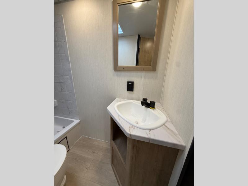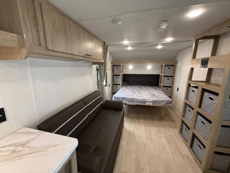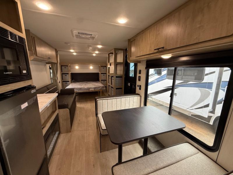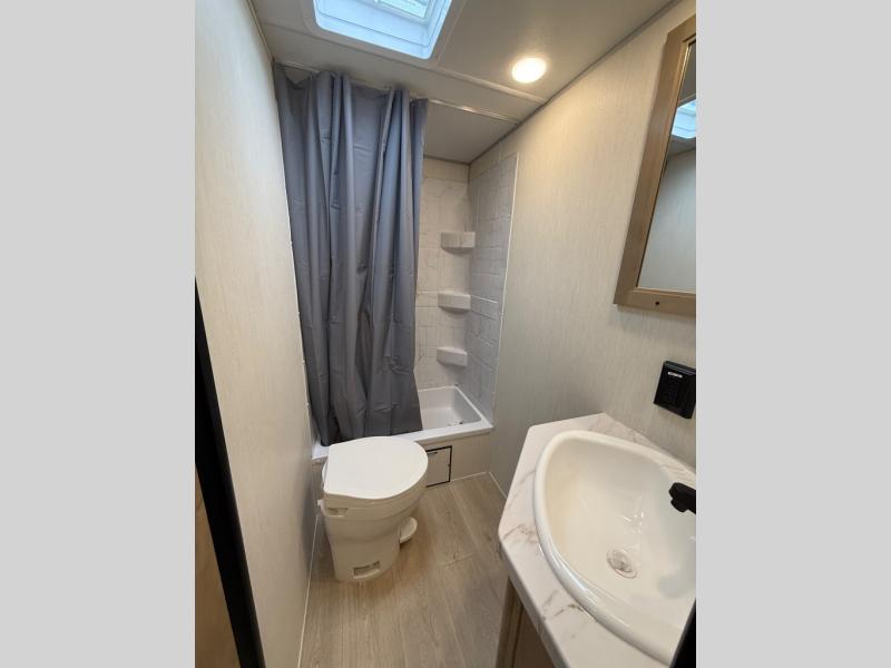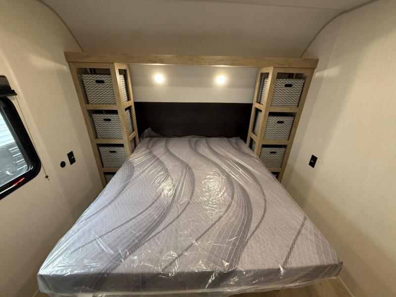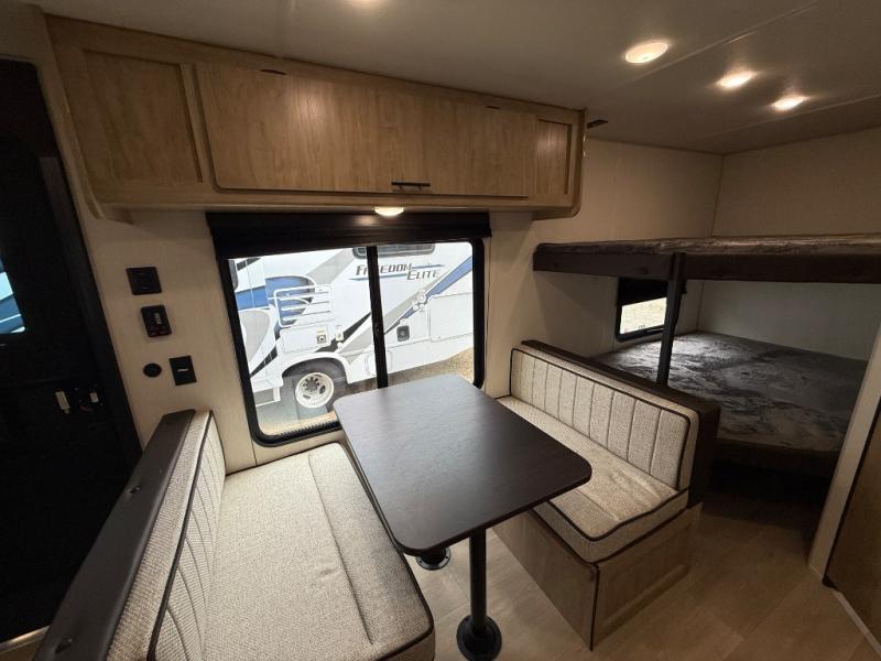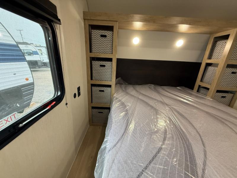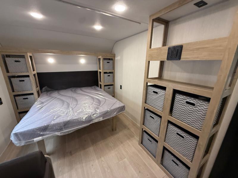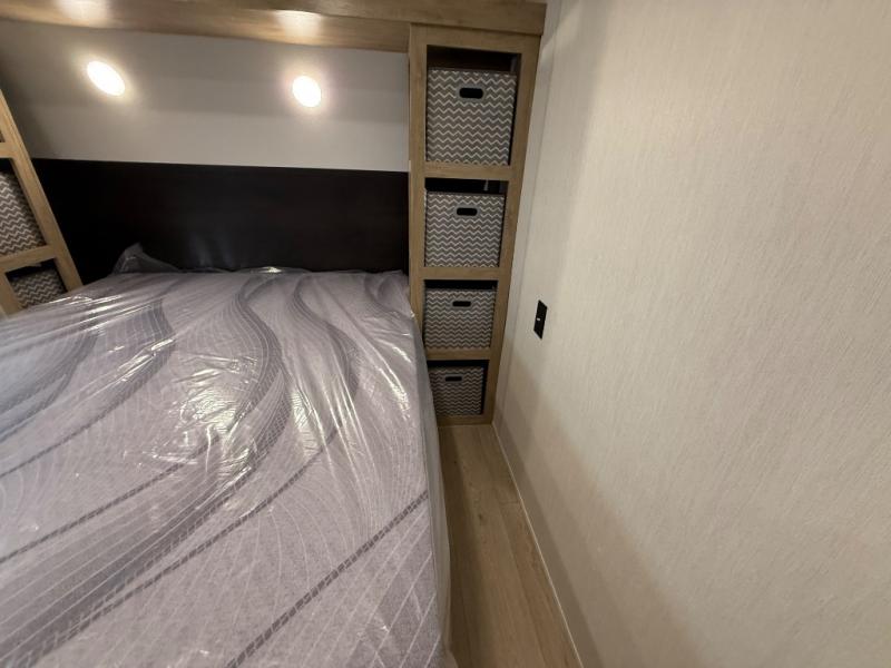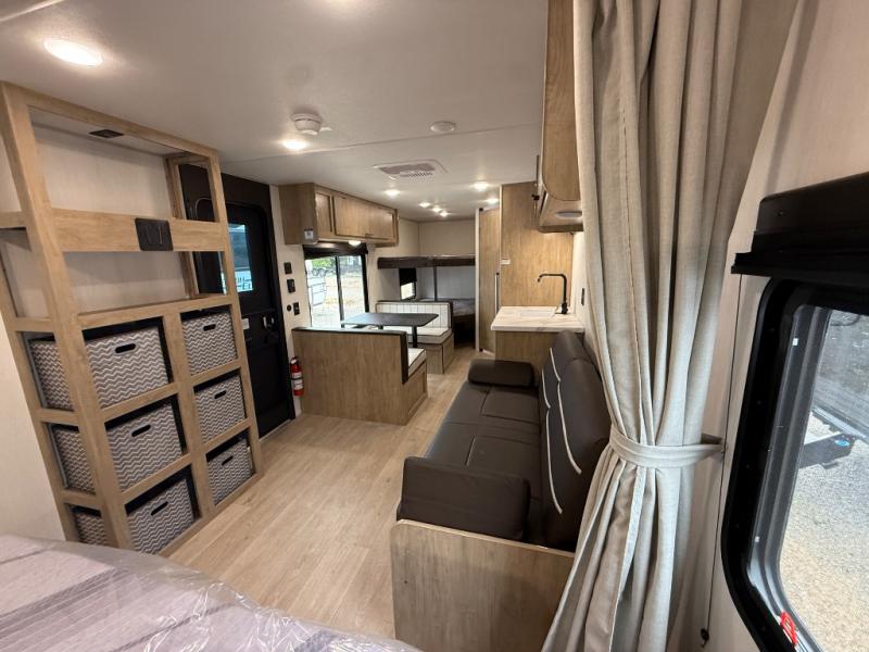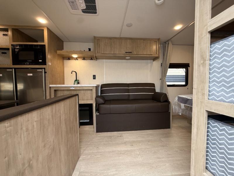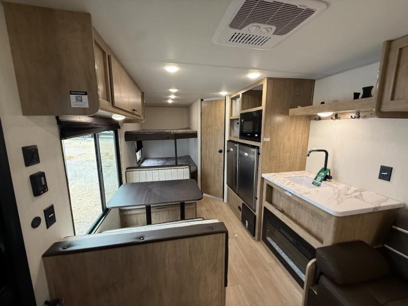 Enjoy family adventures in this bunk model which features sleeping for eight to ten depending on size with a queen bed up front, double-size bunks in the rear curbside corner, and you could even convert the booth dinette and sofa to sleep more. Inside, you will find ample storage with overhead cabinets and a large shelf above the queen bed, plus more shelves next to the entry door, as well as a pantry and storage on either side of the bed. You will appreciate the full bath with tub/shower, toilet, and sink so you can skip the campground facilities. On the outside, you will also find a 12' awning for added outdoor living, and outside storage for your camping gear, plus more!