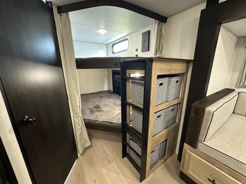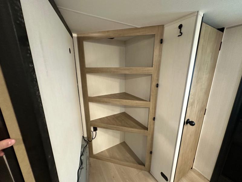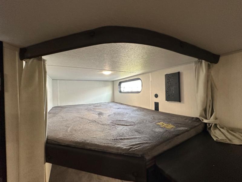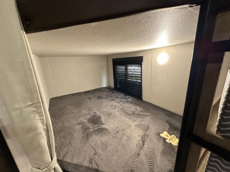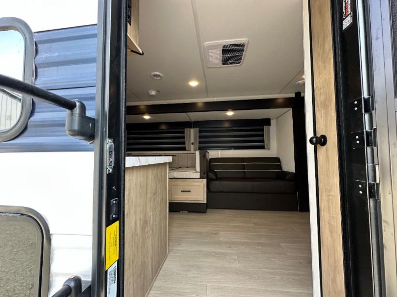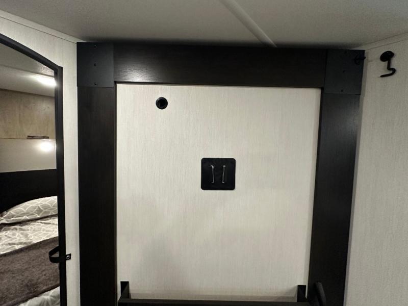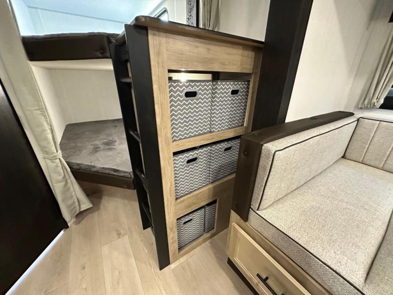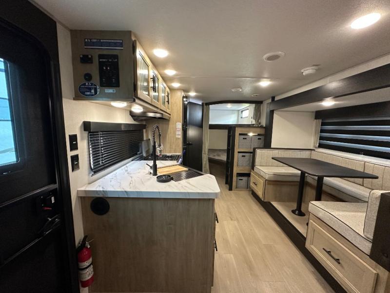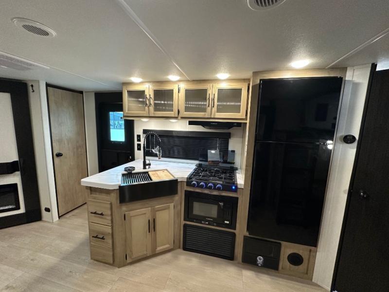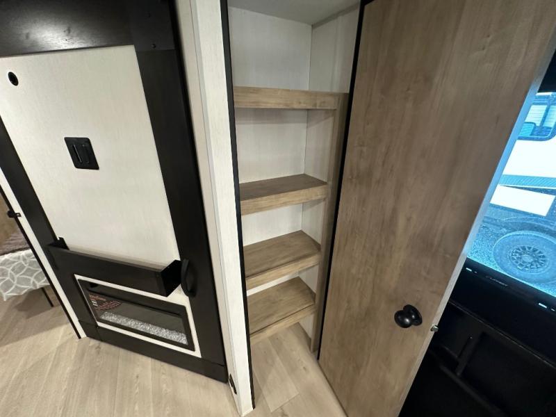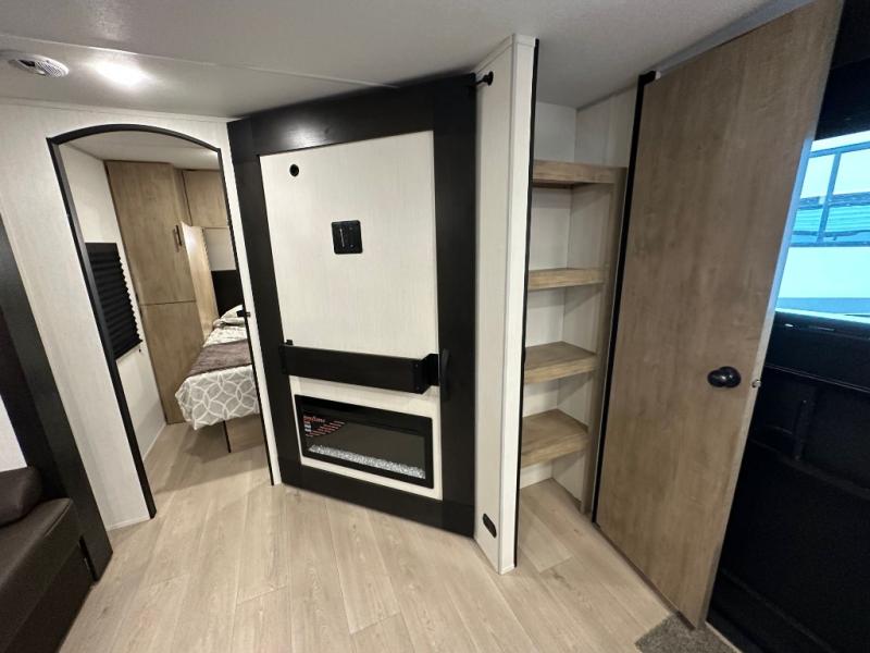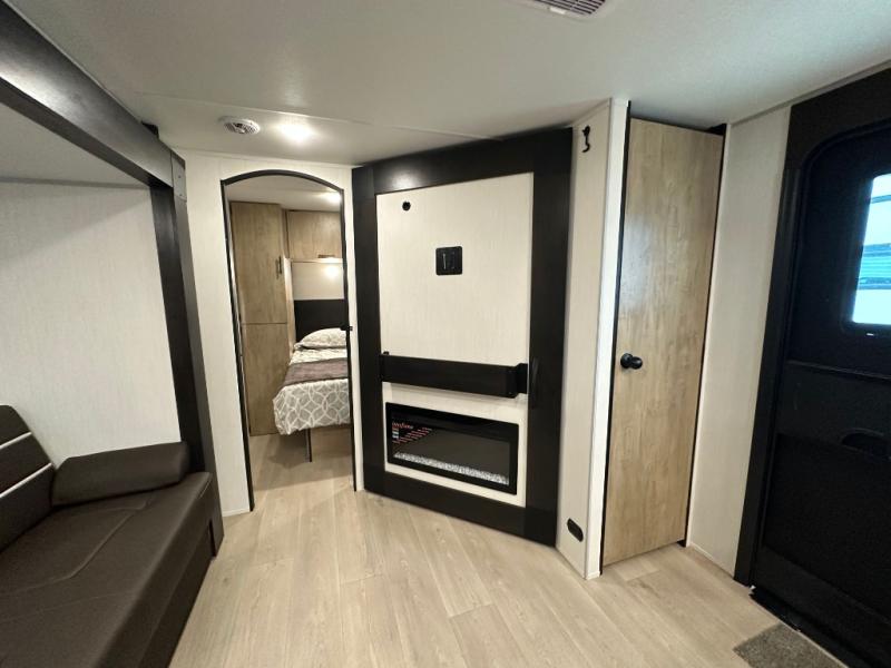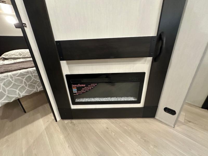 If you've been searching for a travel trailer with a larger sleeping capacity to camp with friends, this is the one! There are double-size bunks in the rear corner, and the full bath with its own exterior entry door is in the other rear corner for easy nighttime use. Up front, an RV king bed in the private bedroom is sure to bring a great night's rest, and you'll find dual bedside wardrobes to keep your clothes picked up off of the floor. In the morning, everyone can meet in the main living room that includes a large slide out, U-shaped dinette, sofa, and a fireplace with a hidden pantry behind it for smart storage solutions. There is also a TV mount here for the option to bring along your television. An outside mini kitchen will allow you to get some fresh air as you make dinner, but there's also a full interior kitchen if the weather isn't cooperating. Additional outdoor features include a rear storage rack, an outside TV mount, and a 9' power awning for some shade!