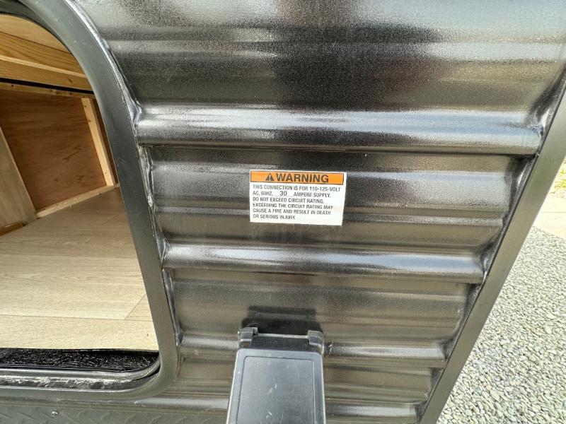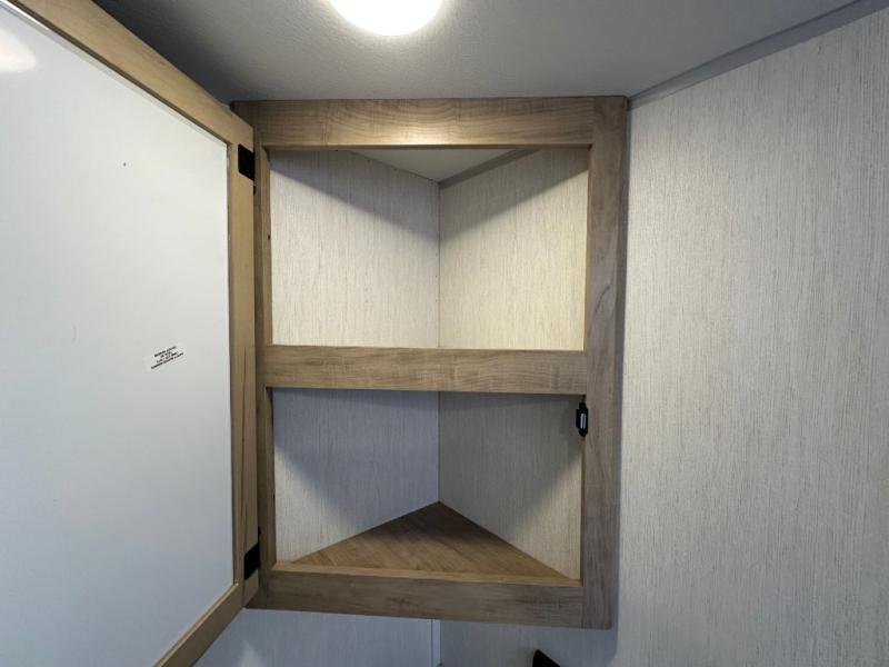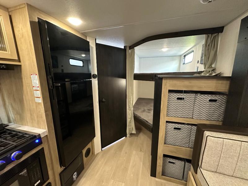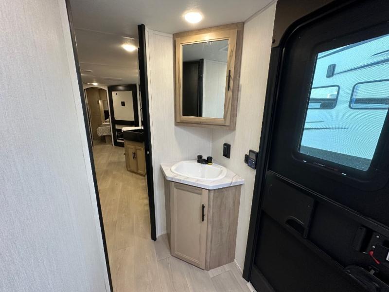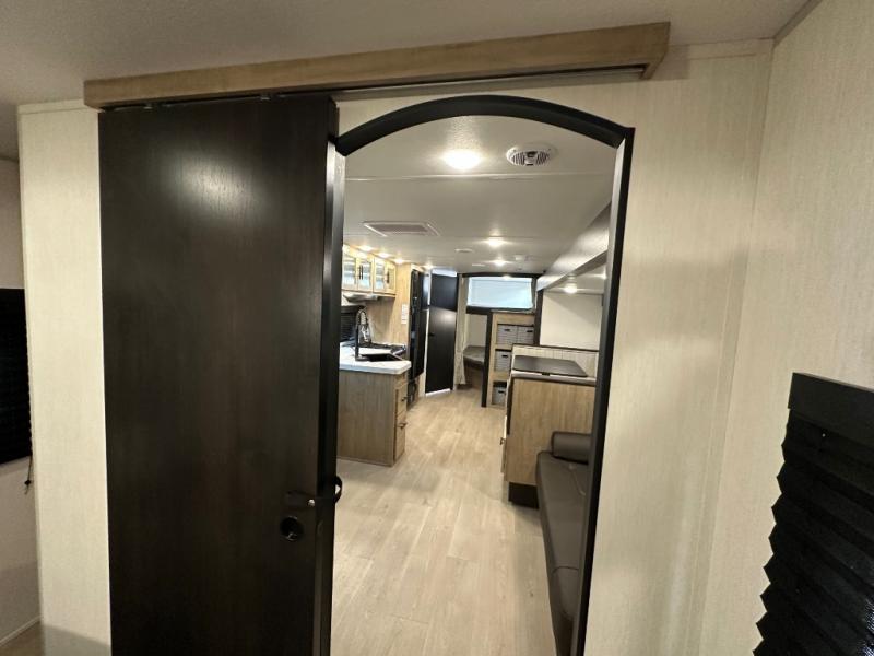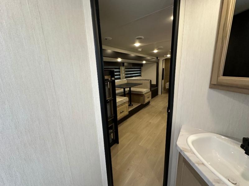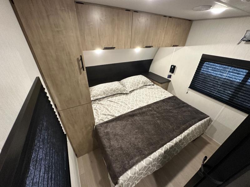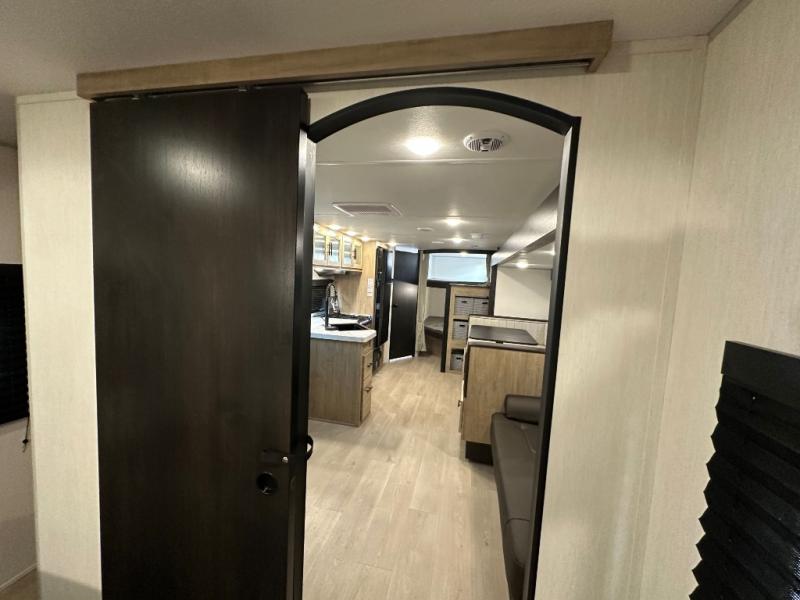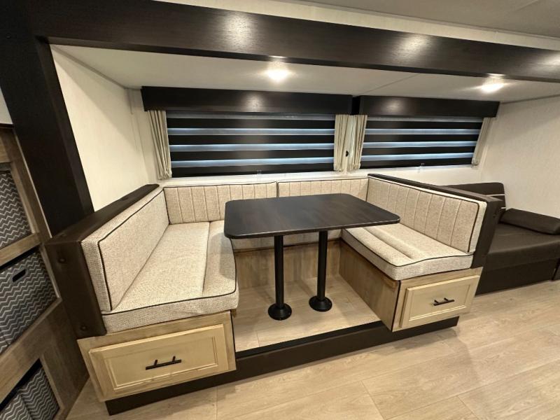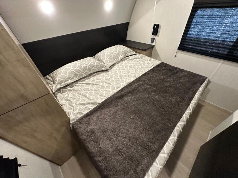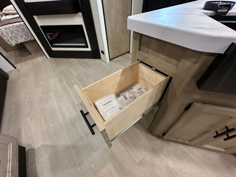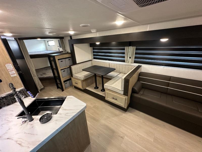 If you've been searching for a travel trailer with a larger sleeping capacity to camp with friends, this is the one! There are double-size bunks in the rear corner, and the full bath with its own exterior entry door is in the other rear corner for easy nighttime use. Up front, an RV king bed in the private bedroom is sure to bring a great night's rest, and you'll find dual bedside wardrobes to keep your clothes picked up off of the floor. In the morning, everyone can meet in the main living room that includes a large slide out, U-shaped dinette, sofa, and a fireplace with a hidden pantry behind it for smart storage solutions. There is also a TV mount here for the option to bring along your television. An outside mini kitchen will allow you to get some fresh air as you make dinner, but there's also a full interior kitchen if the weather isn't cooperating. Additional outdoor features include a rear storage rack, an outside TV mount, and a 9' power awning for some shade!