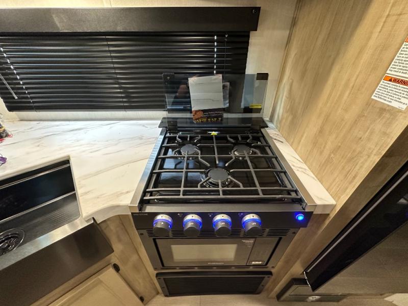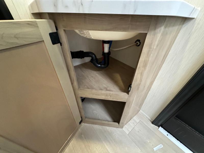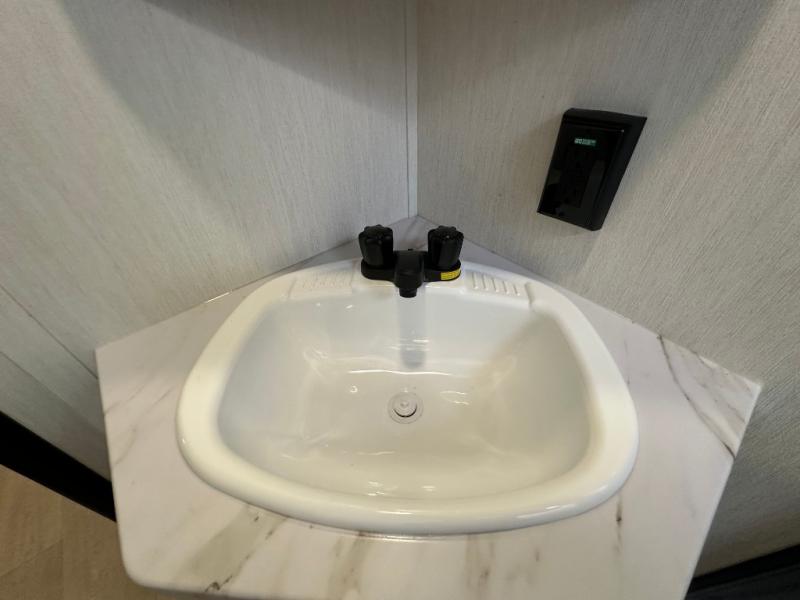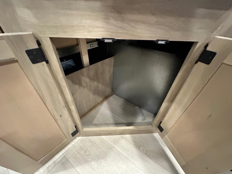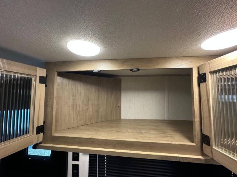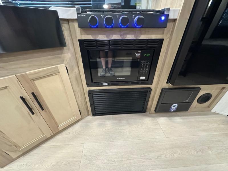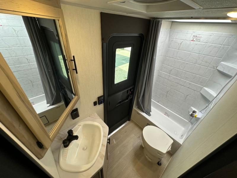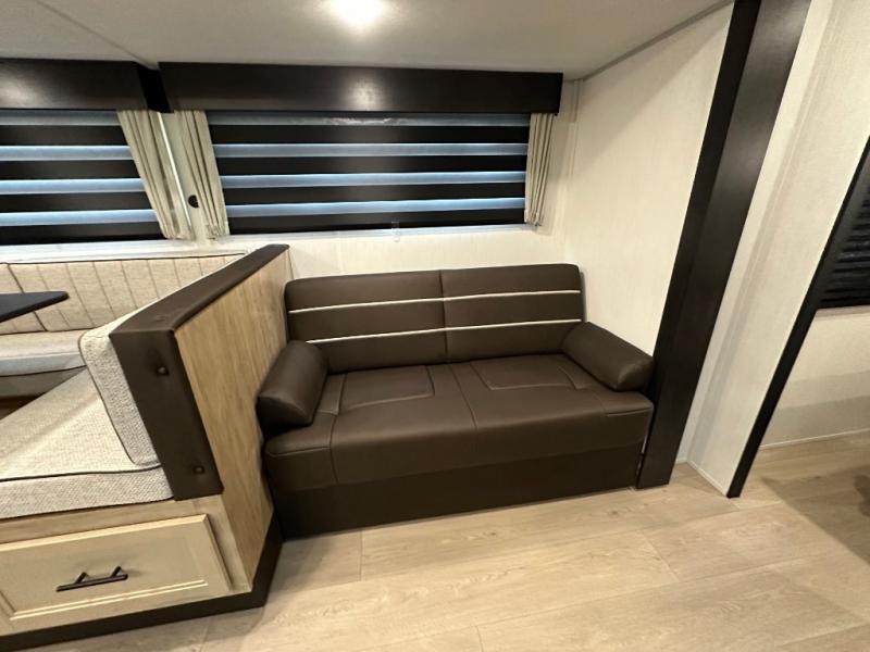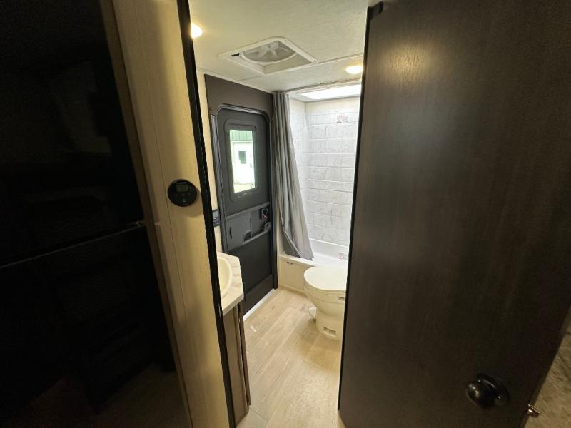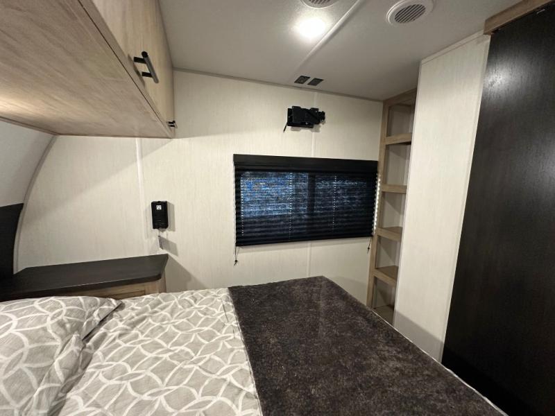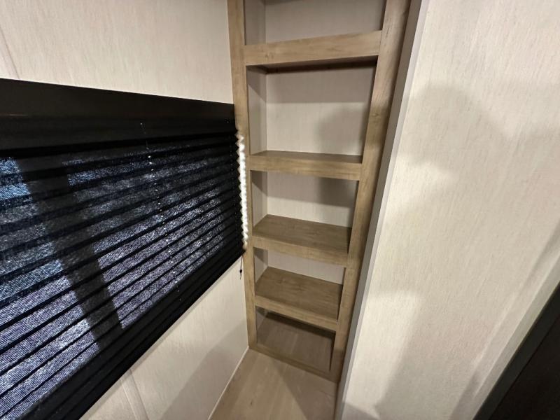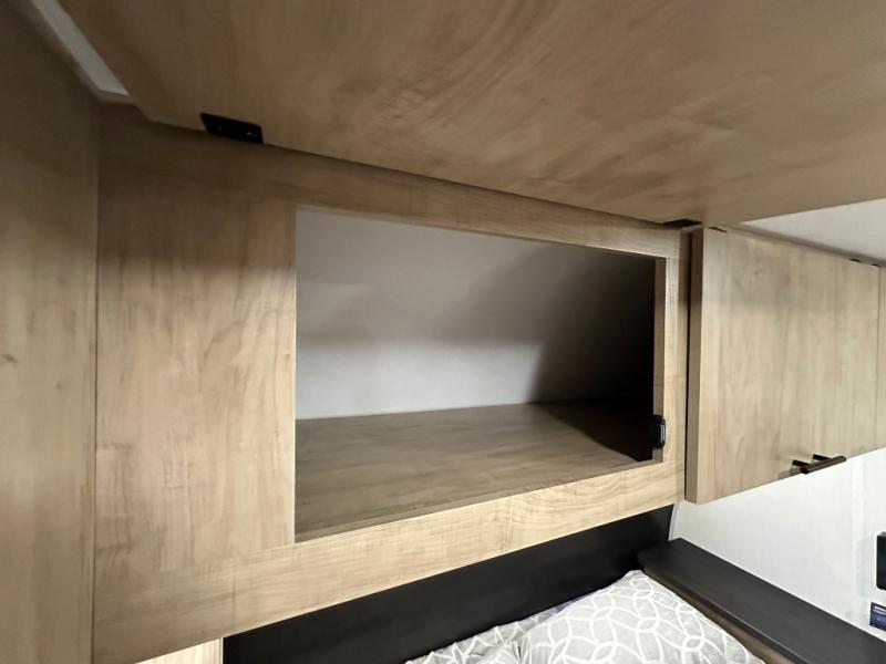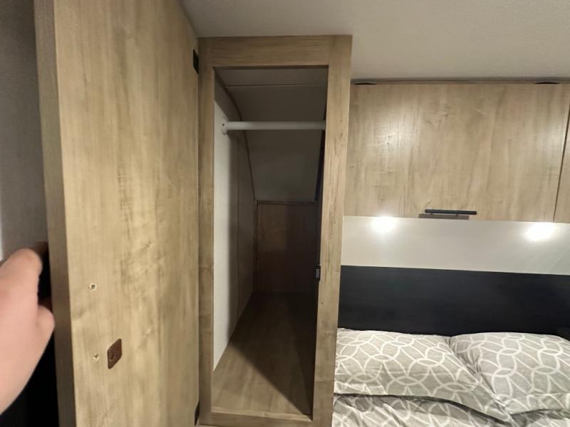 If you've been searching for a travel trailer with a larger sleeping capacity to camp with friends, this is the one! There are double-size bunks in the rear corner, and the full bath with its own exterior entry door is in the other rear corner for easy nighttime use. Up front, an RV king bed in the private bedroom is sure to bring a great night's rest, and you'll find dual bedside wardrobes to keep your clothes picked up off of the floor. In the morning, everyone can meet in the main living room that includes a large slide out, U-shaped dinette, sofa, and a fireplace with a hidden pantry behind it for smart storage solutions. There is also a TV mount here for the option to bring along your television. An outside mini kitchen will allow you to get some fresh air as you make dinner, but there's also a full interior kitchen if the weather isn't cooperating. Additional outdoor features include a rear storage rack, an outside TV mount, and a 9' power awning for some shade!