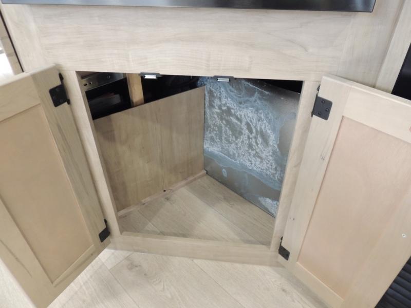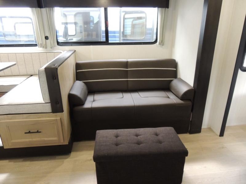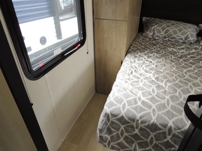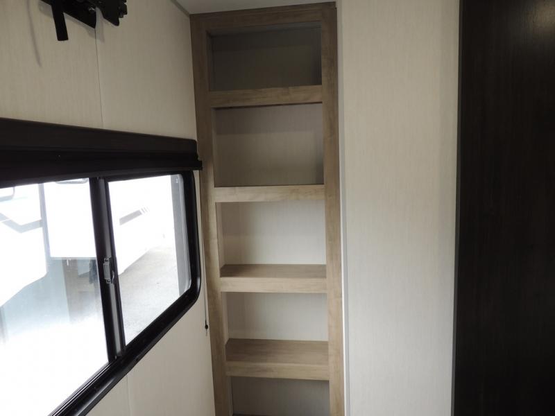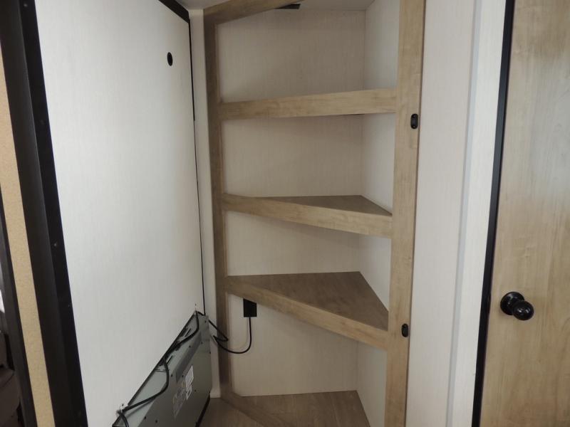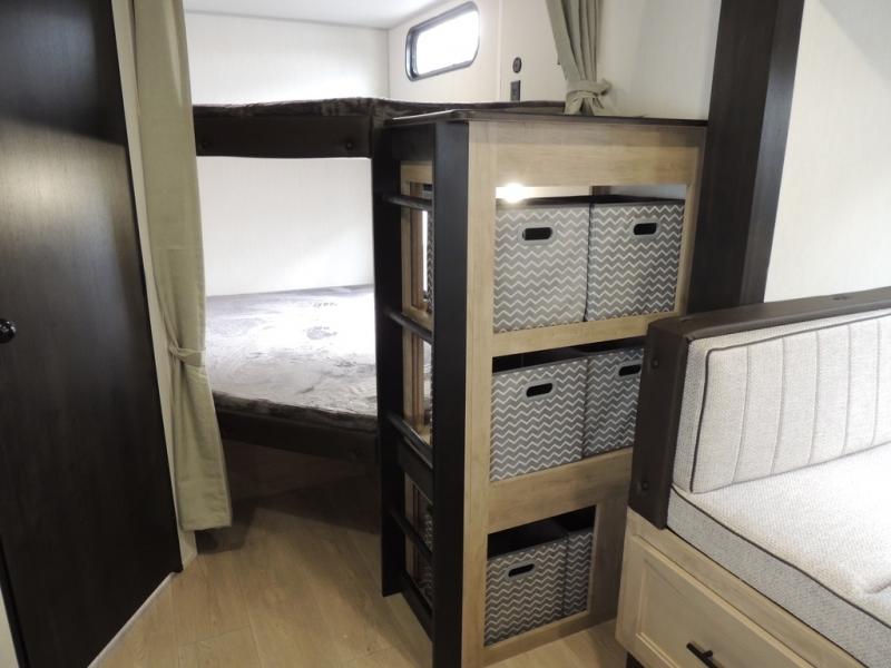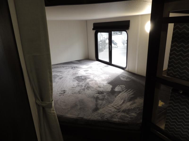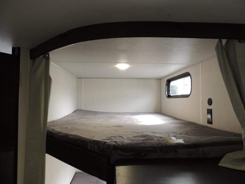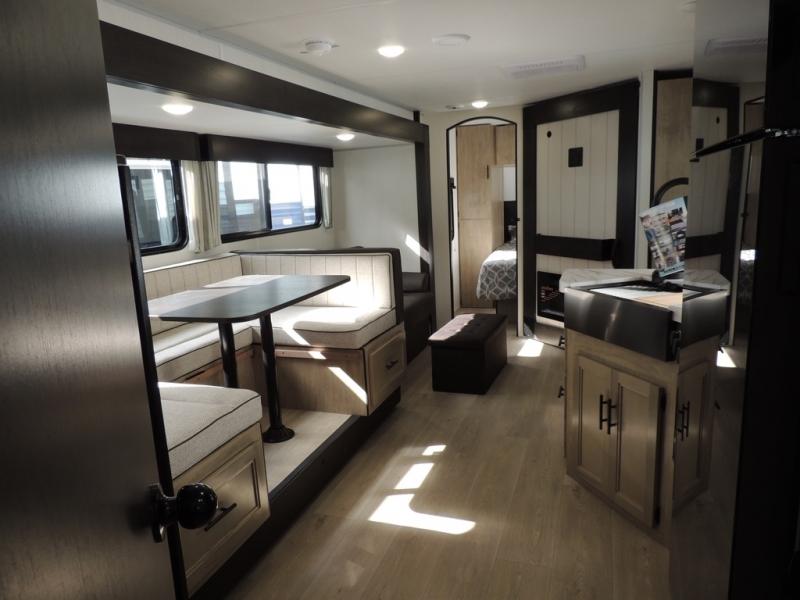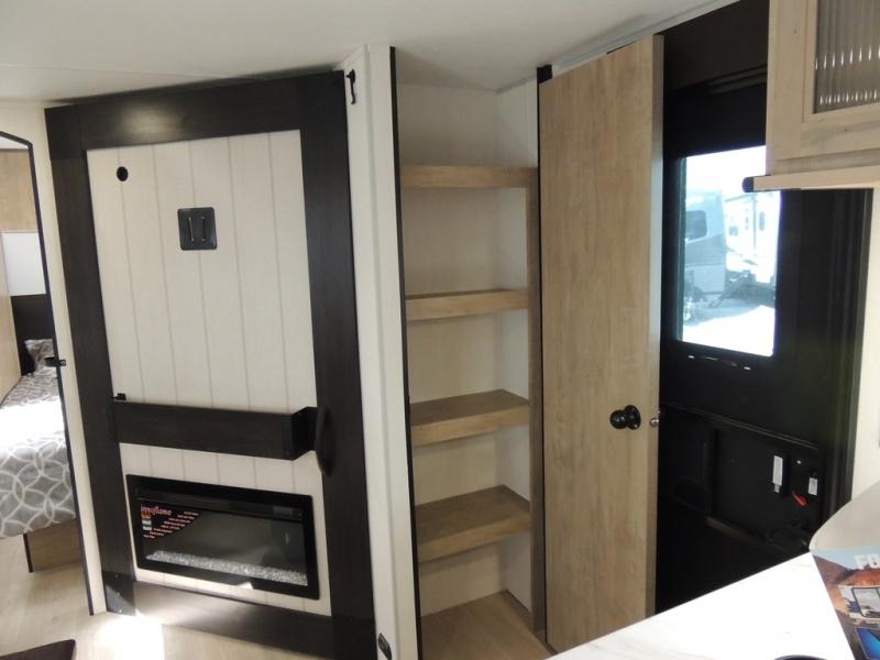 If you've been searching for a travel trailer with a larger sleeping capacity to camp with friends, this is the one! There are double-size bunks in the rear corner, and the full bath with its own exterior entry door is in the other rear corner for easy nighttime use. Up front, an RV king bed in the private bedroom is sure to bring a great night's rest, and you'll find dual bedside wardrobes to keep your clothes picked up off of the floor. In the morning, everyone can meet in the main living room that includes a large slide out, U-shaped dinette, sofa, and a fireplace with a hidden pantry behind it for smart storage solutions. There is also a TV mount here for the option to bring along your television. An outside mini kitchen will allow you to get some fresh air as you make dinner, but there's also a full interior kitchen if the weather isn't cooperating. Additional outdoor features include a rear storage rack, an outside TV mount, and a 9' power awning for some shade!