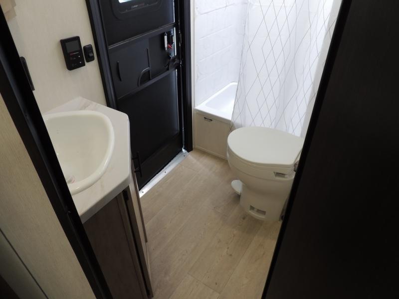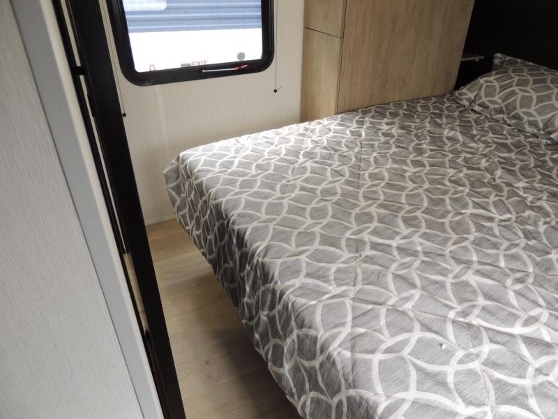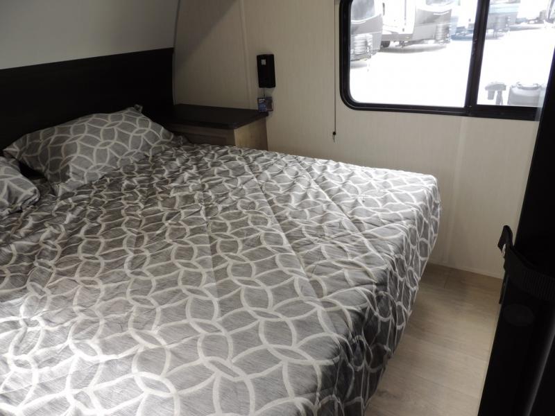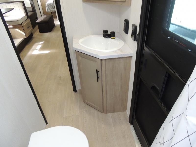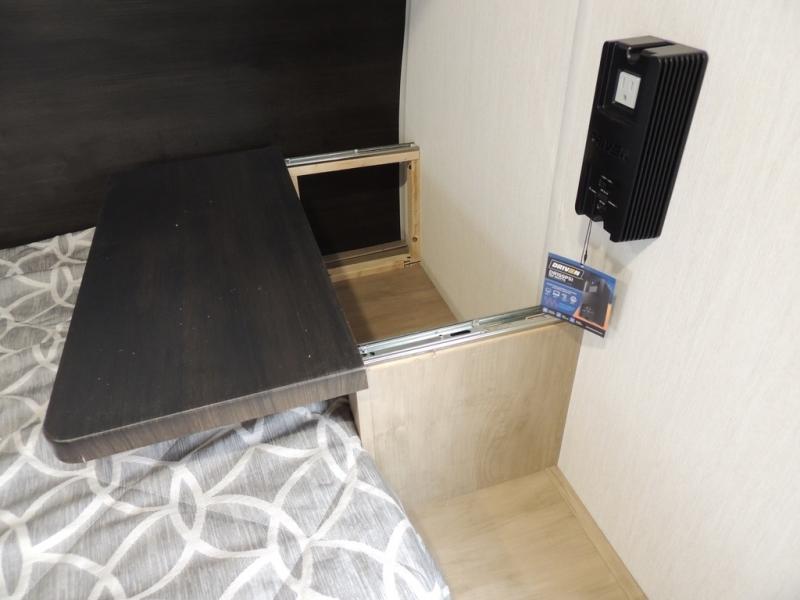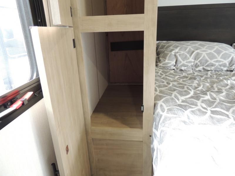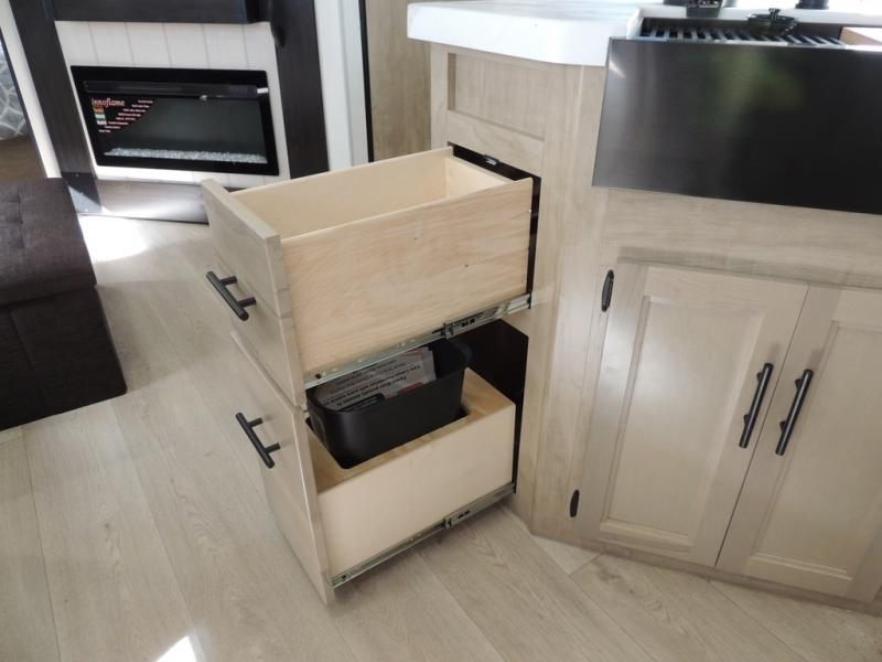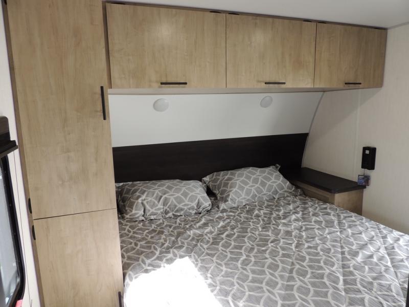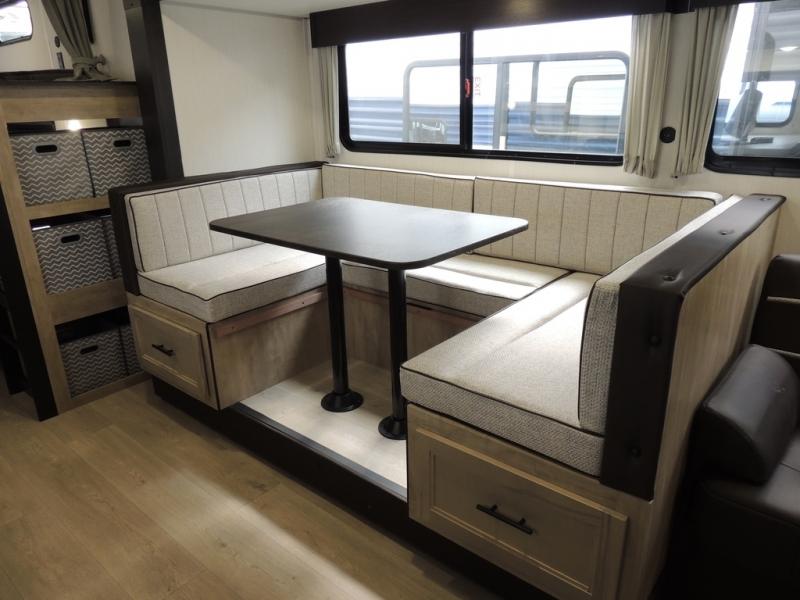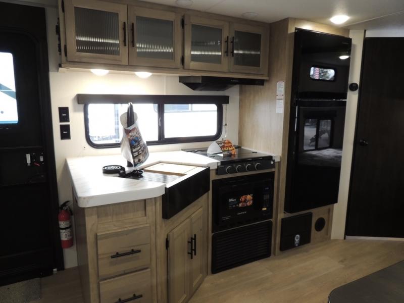 If you've been searching for a travel trailer with a larger sleeping capacity to camp with friends, this is the one! There are double-size bunks in the rear corner, and the full bath with its own exterior entry door is in the other rear corner for easy nighttime use. Up front, an RV king bed in the private bedroom is sure to bring a great night's rest, and you'll find dual bedside wardrobes to keep your clothes picked up off of the floor. In the morning, everyone can meet in the main living room that includes a large slide out, U-shaped dinette, sofa, and a fireplace with a hidden pantry behind it for smart storage solutions. There is also a TV mount here for the option to bring along your television. An outside mini kitchen will allow you to get some fresh air as you make dinner, but there's also a full interior kitchen if the weather isn't cooperating. Additional outdoor features include a rear storage rack, an outside TV mount, and a 9' power awning for some shade!