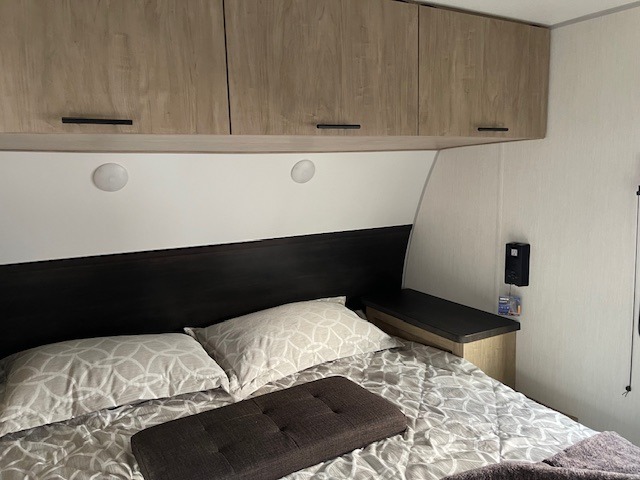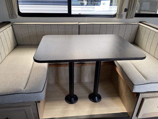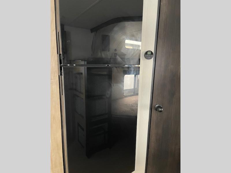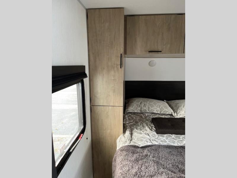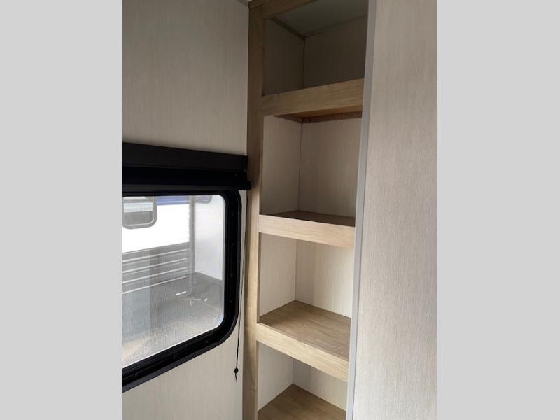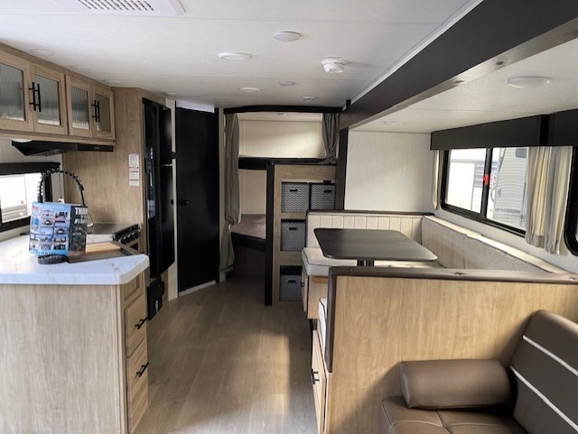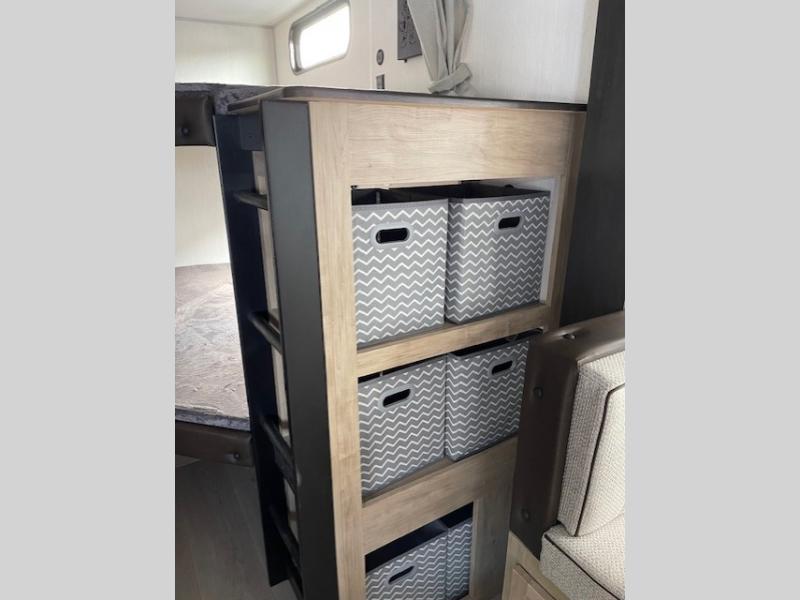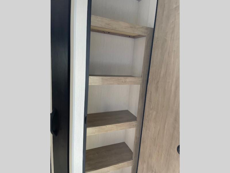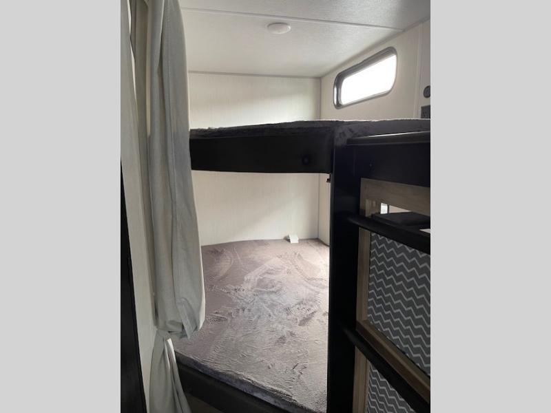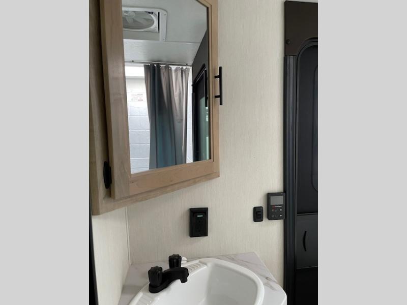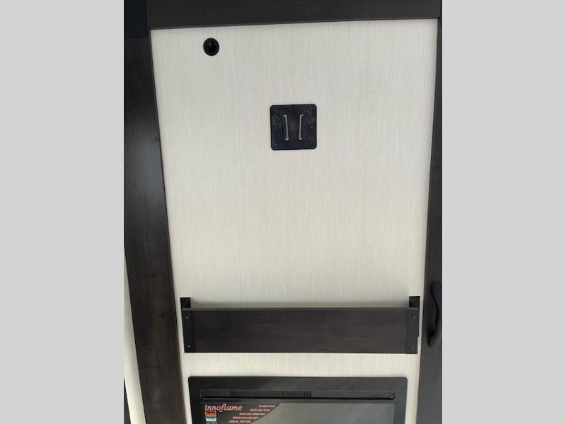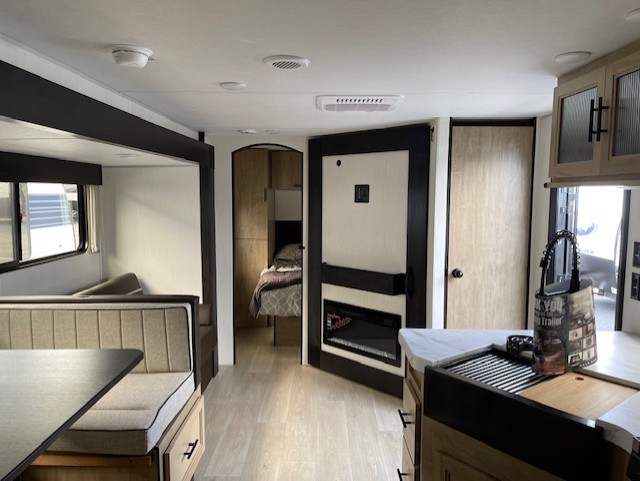 If you've been searching for a travel trailer with a larger sleeping capacity to camp with friends, this is the one! There are double-size bunks in the rear corner, and the full bath with its own exterior entry door is in the other rear corner for easy nighttime use. Up front, an RV king bed in the private bedroom is sure to bring a great night's rest, and you'll find dual bedside wardrobes to keep your clothes picked up off of the floor. In the morning, everyone can meet in the main living room that includes a large slide out, U-shaped dinette, sofa, and a fireplace with a hidden pantry behind it for smart storage solutions. There is also a TV mount here for the option to bring along your television. An outside mini kitchen will allow you to get some fresh air as you make dinner, but there's also a full interior kitchen if the weather isn't cooperating. Additional outdoor features include a rear storage rack, an outside TV mount, and a 9' power awning for some shade!