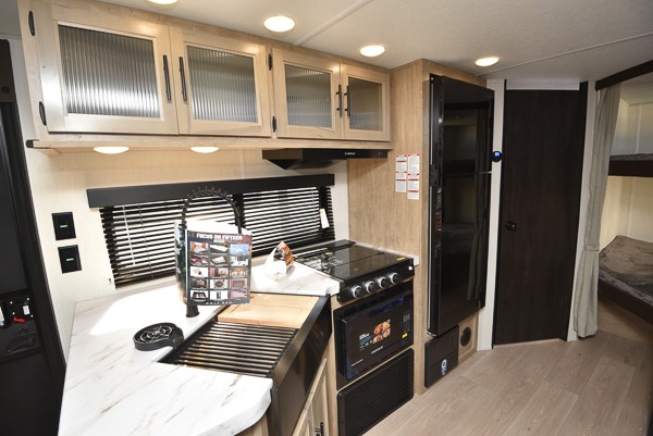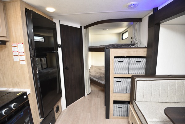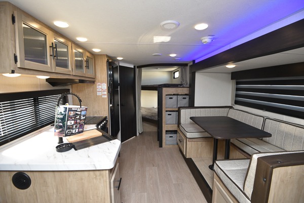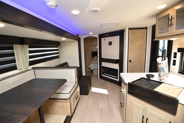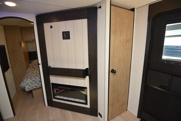 If you've been searching for a travel trailer with a larger sleeping capacity to camp with friends, this is the one! There are double-size bunks in the rear corner, and the full bath with its own exterior entry door is in the other rear corner for easy nighttime use. Up front, an RV king bed in the private bedroom is sure to bring a great night's rest, and you'll find a bedside wardrobe to keep your clothes picked up off of the floor. In the morning, everyone can meet in the main living room that includes a large slide out, U-shaped dinette, sofa, and a fireplace with a hidden pantry behind it for smart storage solutions. An outside kitchen will allow you to get some fresh air as you make dinner, but there's also a full interior kitchen if the weather isn't cooperating. Additional outdoor features include a rear storage rack, an outside TV mount, and a 15' awning for some shade!