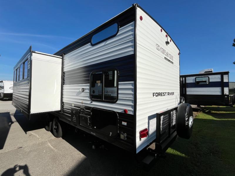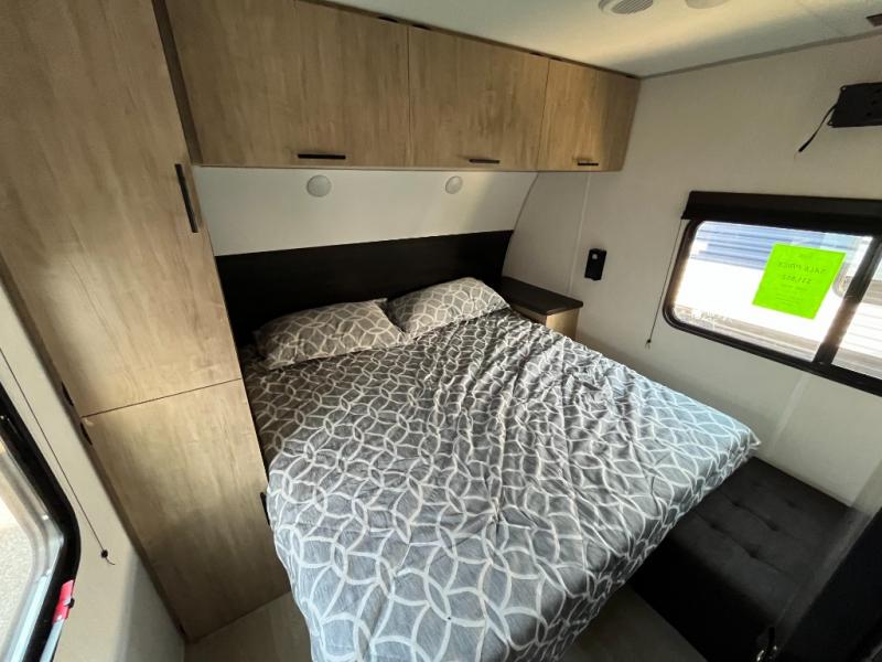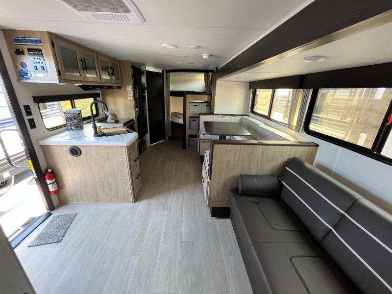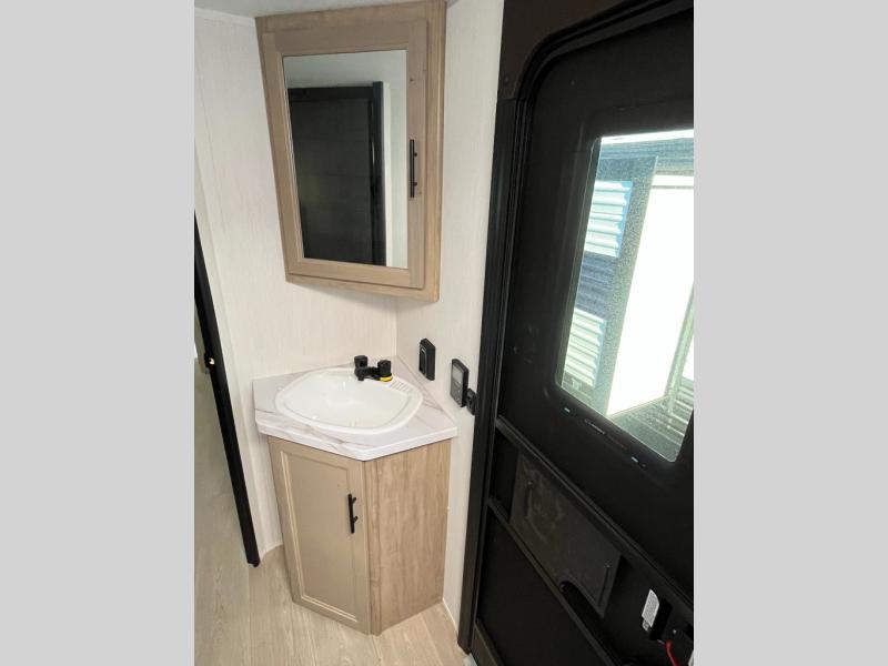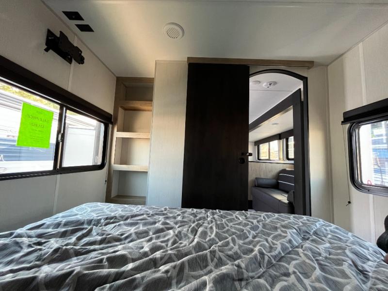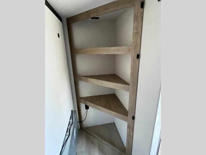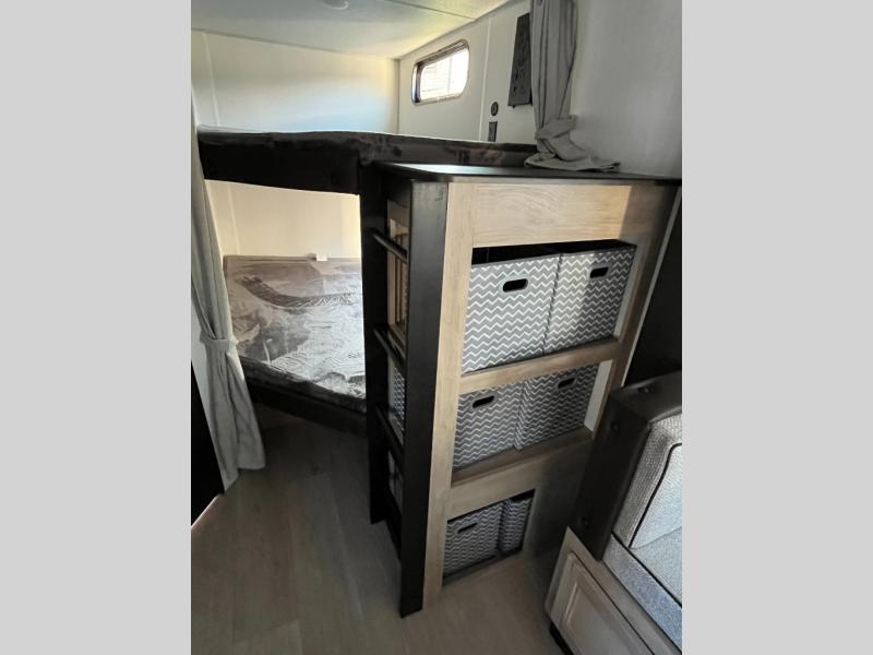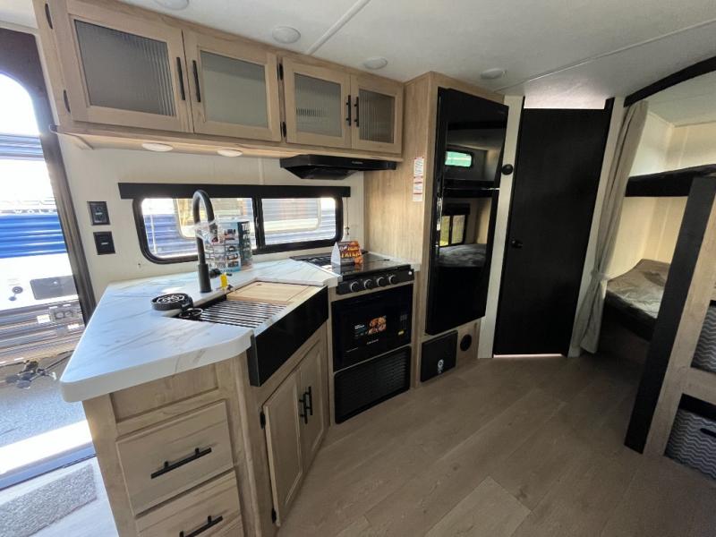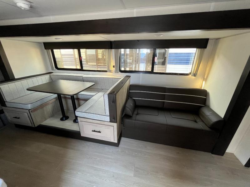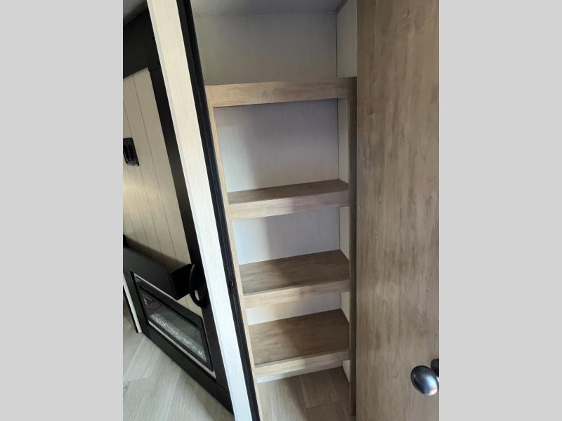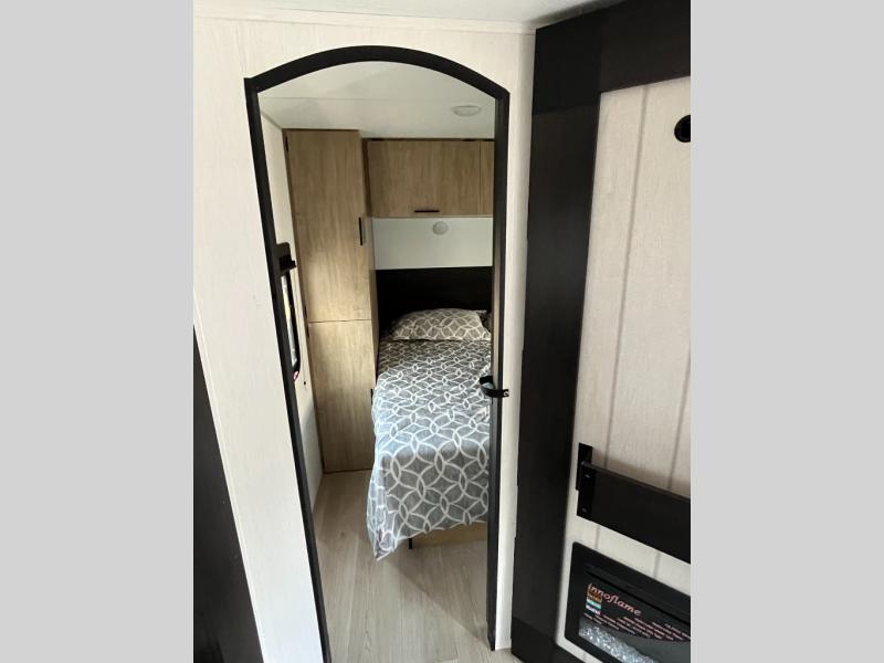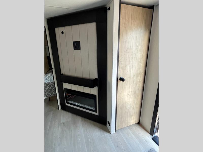 If you've been searching for a travel trailer with a larger sleeping capacity to camp with friends, this is the one! There are double-size bunks in the rear corner, and the full bath with its own exterior entry door is in the other rear corner for easy nighttime use. Up front, an RV king bed in the private bedroom is sure to bring a great night's rest, and you'll find dual bedside wardrobes to keep your clothes picked up off of the floor. In the morning, everyone can meet in the main living room that includes a large slide out, U-shaped dinette, sofa, and a fireplace with a hidden pantry behind it for smart storage solutions. There is also a TV mount here for the option to bring along your television. An outside mini kitchen will allow you to get some fresh air as you make dinner, but there's also a full interior kitchen if the weather isn't cooperating. Additional outdoor features include a rear storage rack, an outside TV mount, and a 9' power awning for some shade!