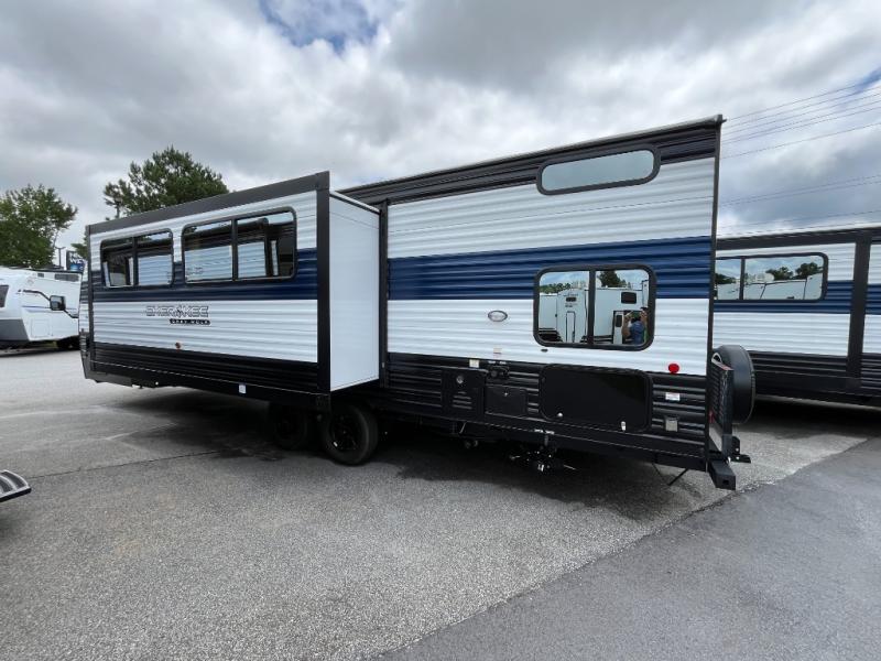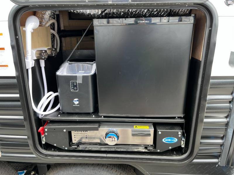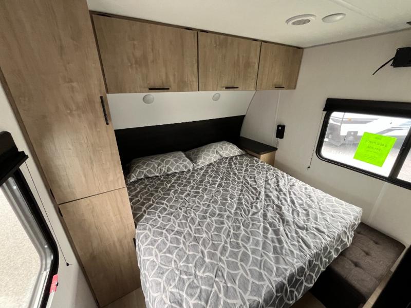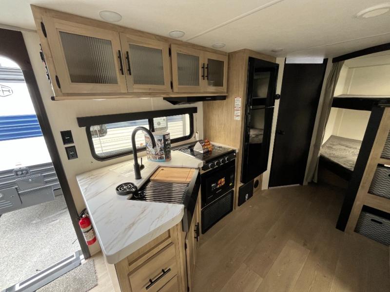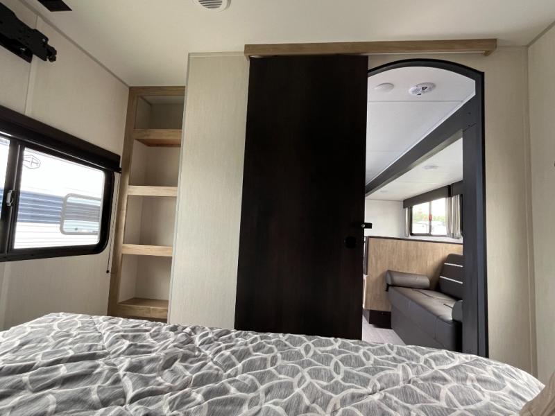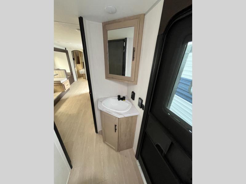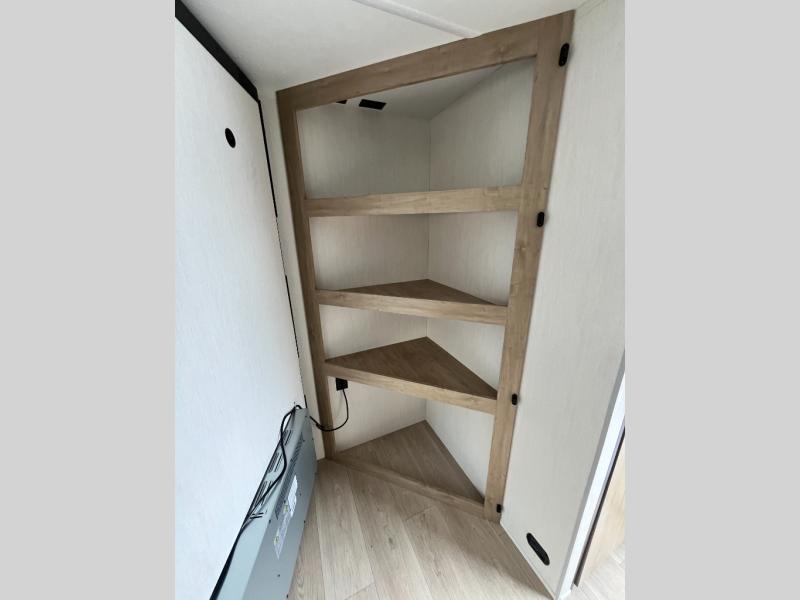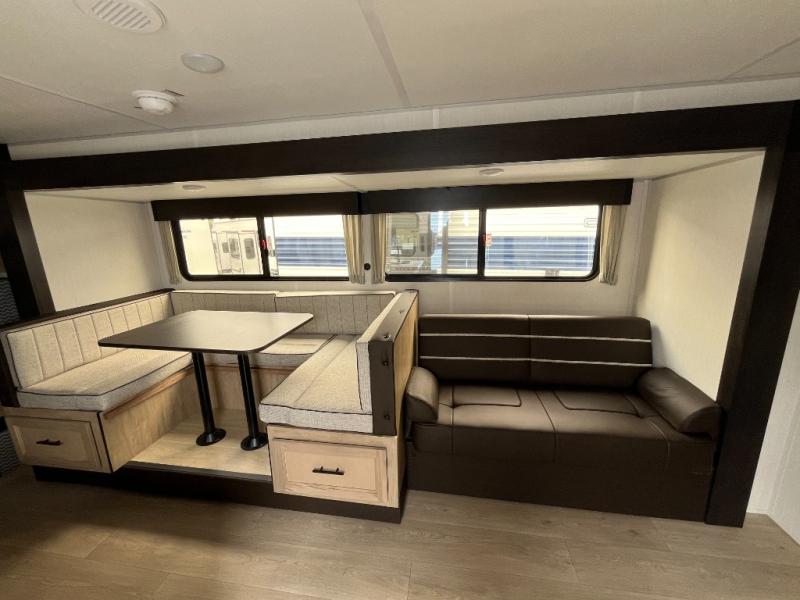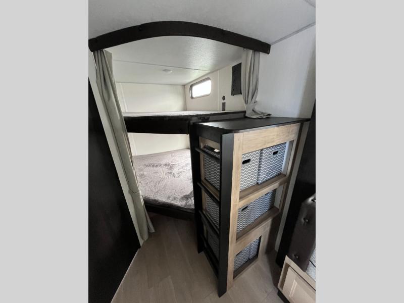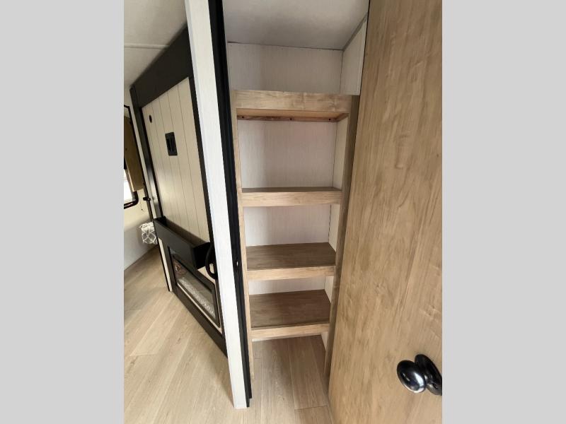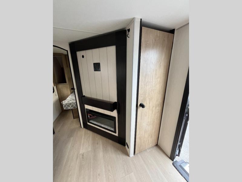 If you've been searching for a travel trailer with a larger sleeping capacity to camp with friends, this is the one! There are double-size bunks in the rear corner, and the full bath with its own exterior entry door is in the other rear corner for easy nighttime use. Up front, an RV king bed in the private bedroom is sure to bring a great night's rest, and you'll find dual bedside wardrobes to keep your clothes picked up off of the floor. In the morning, everyone can meet in the main living room that includes a large slide out, U-shaped dinette, sofa, and a fireplace with a hidden pantry behind it for smart storage solutions. There is also a TV mount here for the option to bring along your television. An outside mini kitchen will allow you to get some fresh air as you make dinner, but there's also a full interior kitchen if the weather isn't cooperating. Additional outdoor features include a rear storage rack, an outside TV mount, and a 9' power awning for some shade!