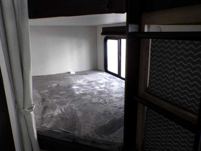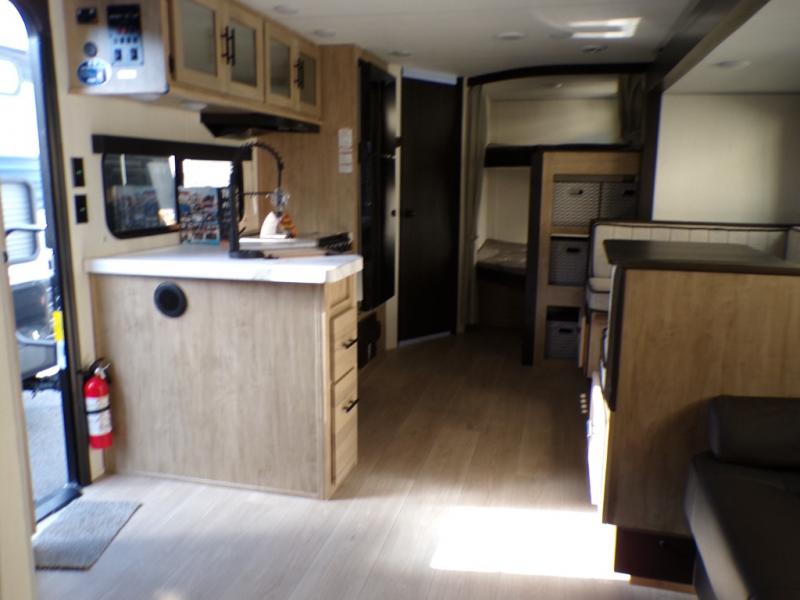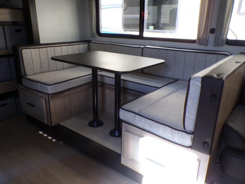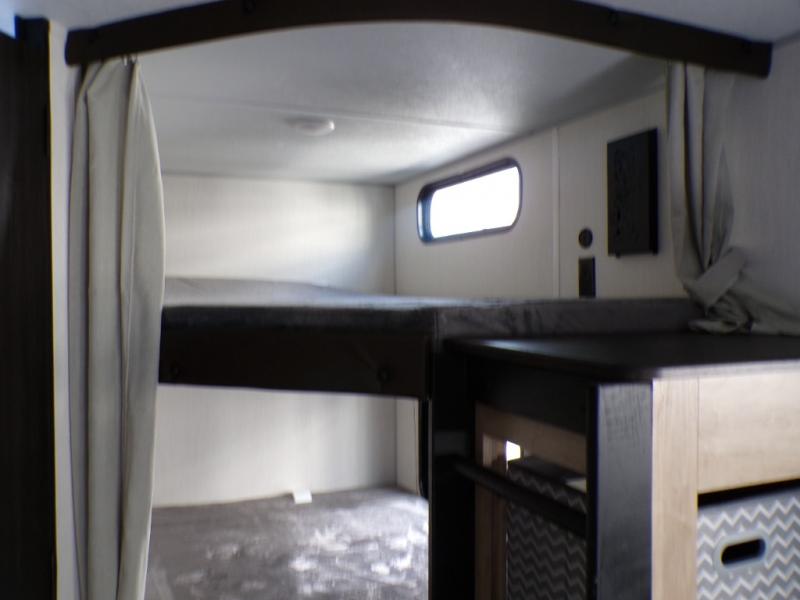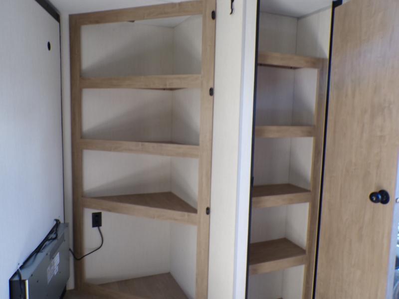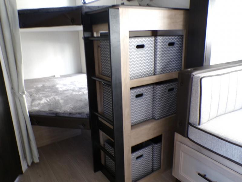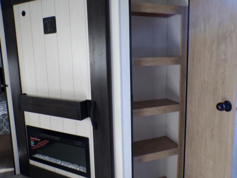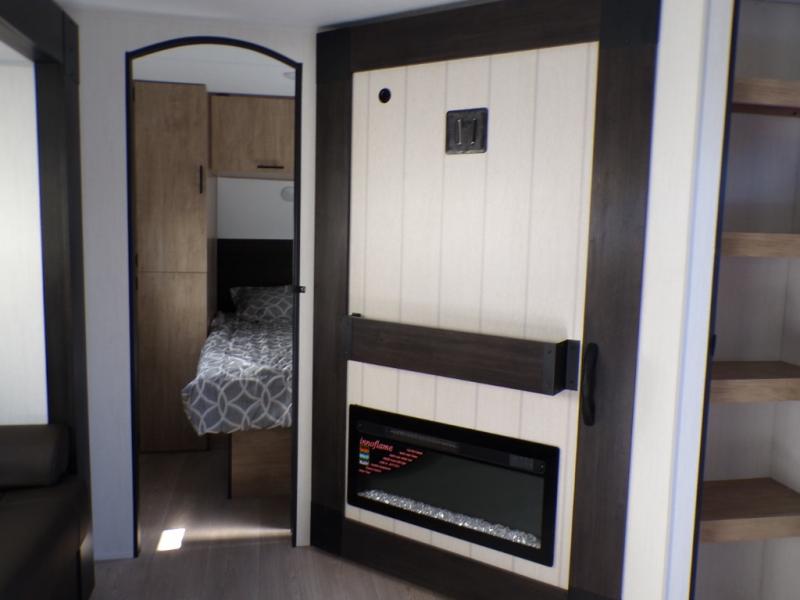 If you've been searching for a travel trailer with a larger sleeping capacity to camp with friends, this is the one! There are double-size bunks in the rear corner, and the full bath with its own exterior entry door is in the other rear corner for easy nighttime use. Up front, an RV king bed in the private bedroom is sure to bring a great night's rest, and you'll find a bedside wardrobe to keep your clothes picked up off of the floor. In the morning, everyone can meet in the main living room that includes a large slide out, U-shaped dinette, sofa, and a fireplace with a hidden pantry behind it for smart storage solutions. An outside kitchen will allow you to get some fresh air as you make dinner, but there's also a full interior kitchen if the weather isn't cooperating. Additional outdoor features include a rear storage rack, an outside TV mount, and a 15' awning for some shade!