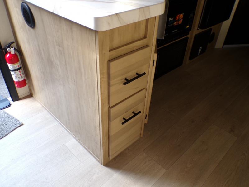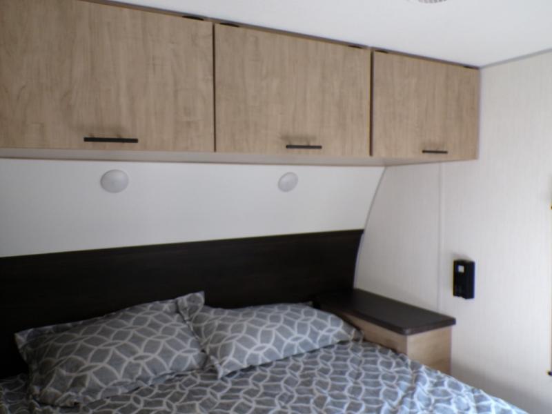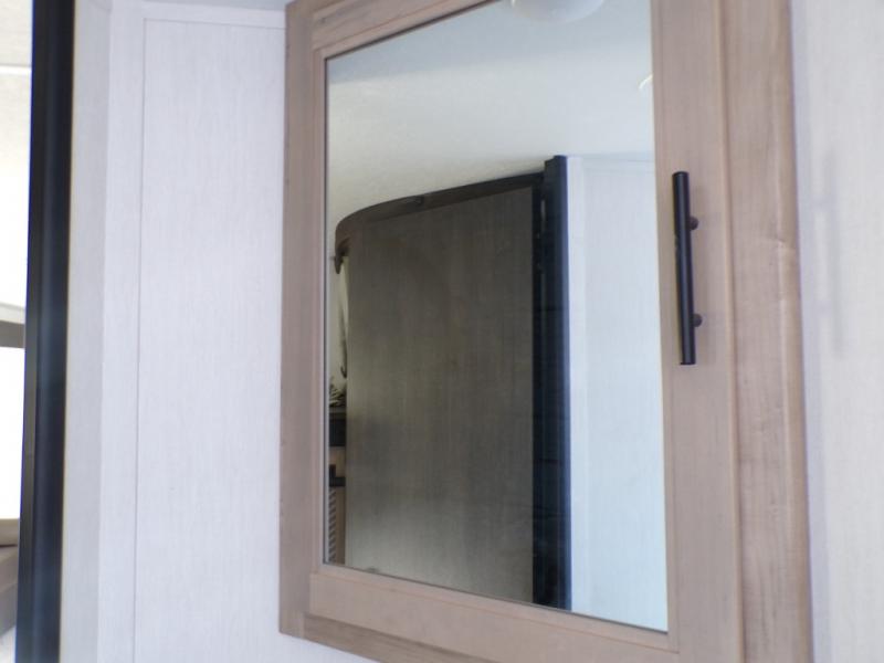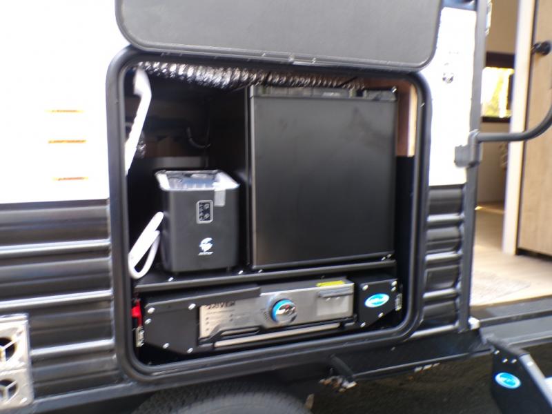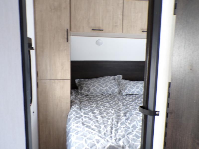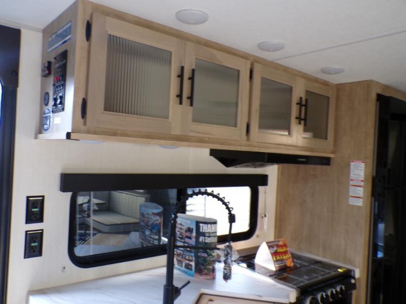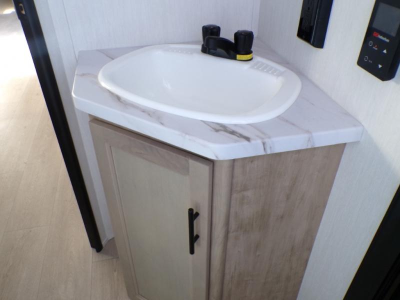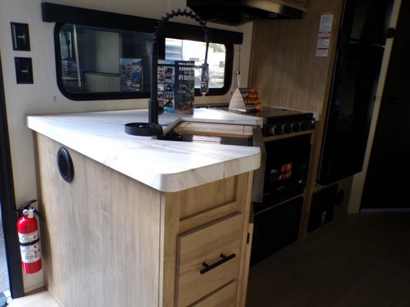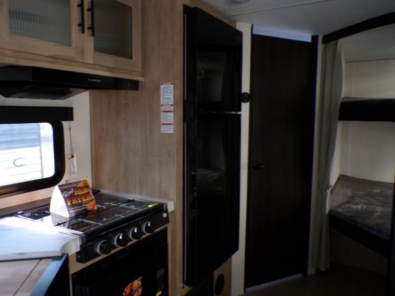If you've been searching for a travel trailer with a larger sleeping capacity to camp with friends, this is the one! There are double-size bunks in the rear corner, and the full bath with its own exterior entry door is in the other rear corner for easy nighttime use. Up front, an RV king bed in the private bedroom is sure to bring a great night's rest, and you'll find a bedside wardrobe to keep your clothes picked up off of the floor. In the morning, everyone can meet in the main living room that includes a large slide out, U-shaped dinette, sofa, and a fireplace with a hidden pantry behind it for smart storage solutions. An outside kitchen will allow you to get some fresh air as you make dinner, but there's also a full interior kitchen if the weather isn't cooperating. Additional outdoor features include a rear storage rack, an outside TV mount, and a 15' awning for some shade!