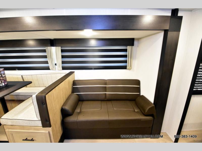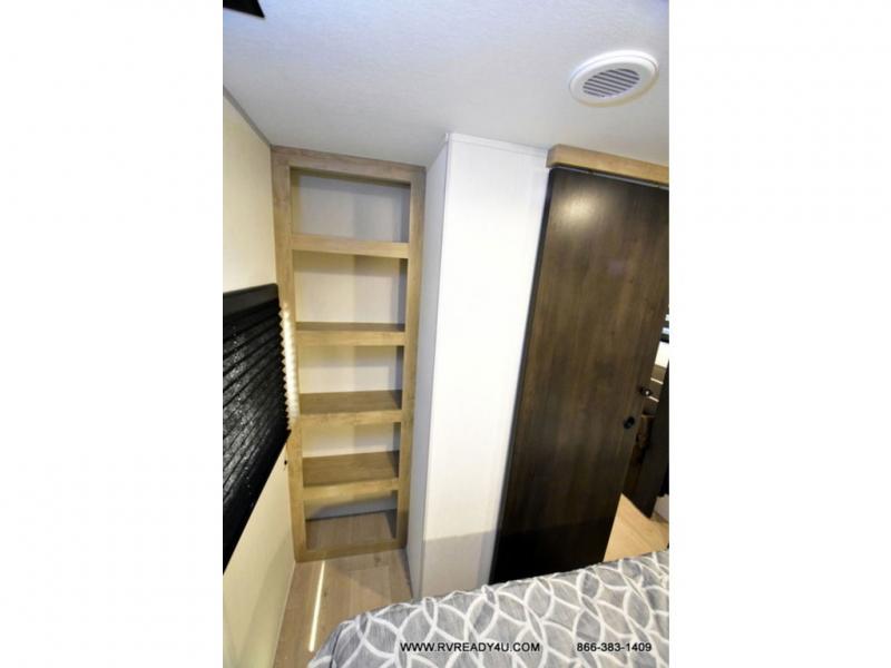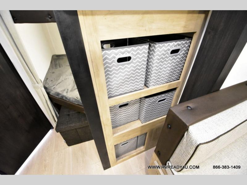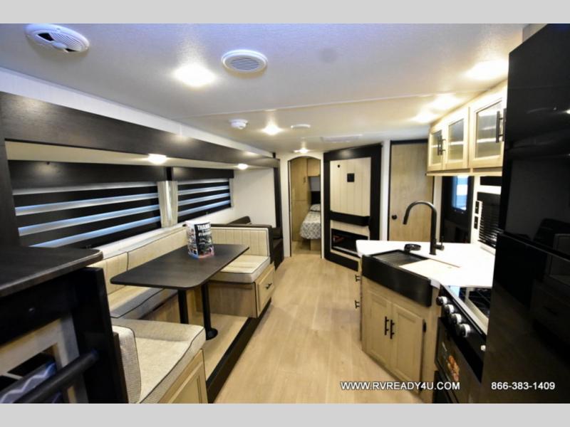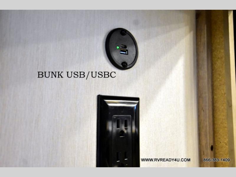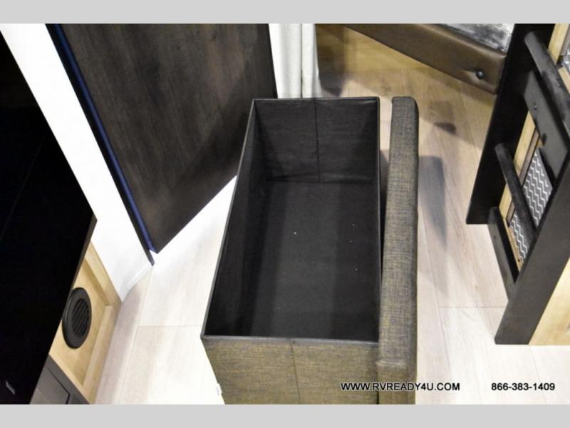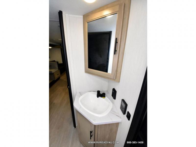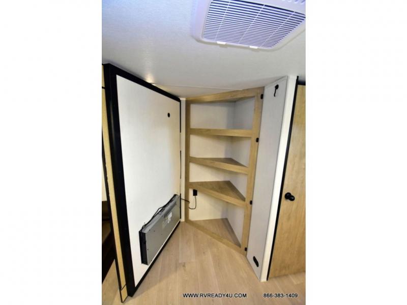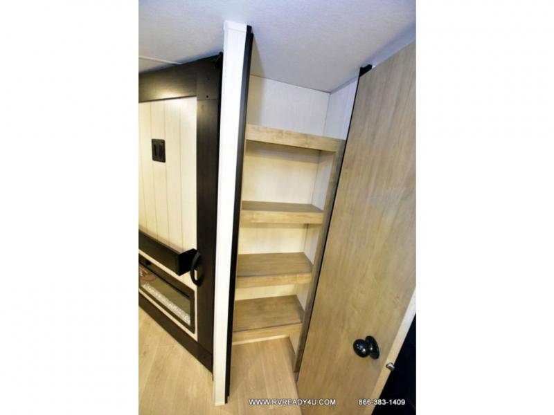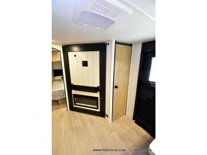 If you've been searching for a travel trailer with a larger sleeping capacity to camp with friends, this is the one! There are double-size bunks in the rear corner, and the full bath with its own exterior entry door is in the other rear corner for easy nighttime use. Up front, an RV king bed in the private bedroom is sure to bring a great night's rest, and you'll find dual bedside wardrobes to keep your clothes picked up off of the floor. In the morning, everyone can meet in the main living room that includes a large slide out, U-shaped dinette, sofa, and a fireplace with a hidden pantry behind it for smart storage solutions. There is also a TV mount here for the option to bring along your television. An outside mini kitchen will allow you to get some fresh air as you make dinner, but there's also a full interior kitchen if the weather isn't cooperating. Additional outdoor features include a rear storage rack, an outside TV mount, and a 9' power awning for some shade!