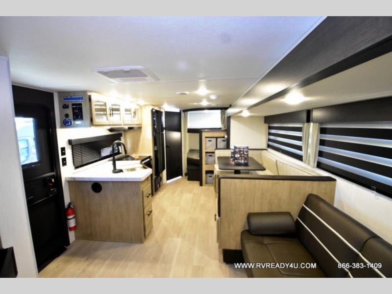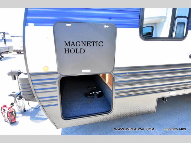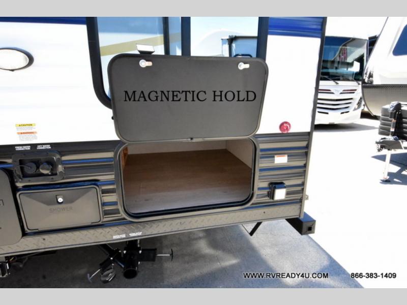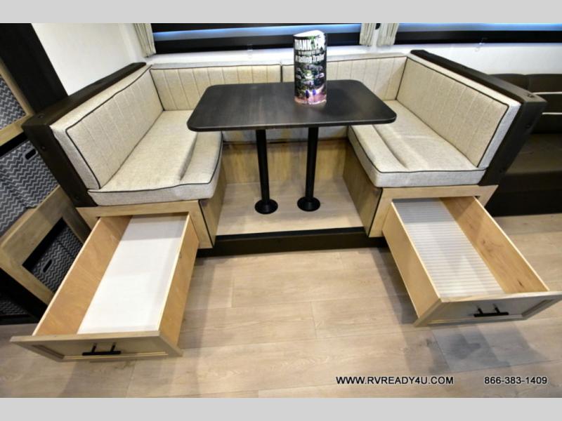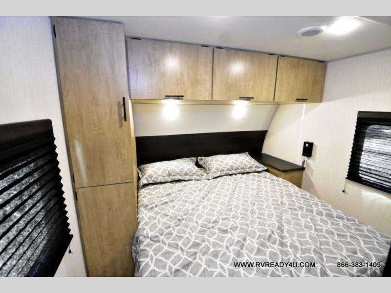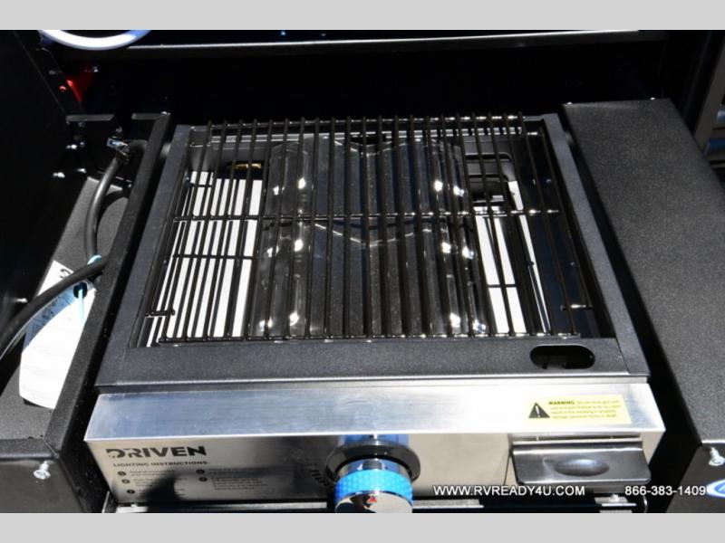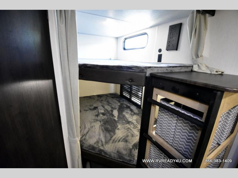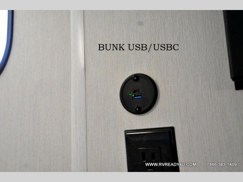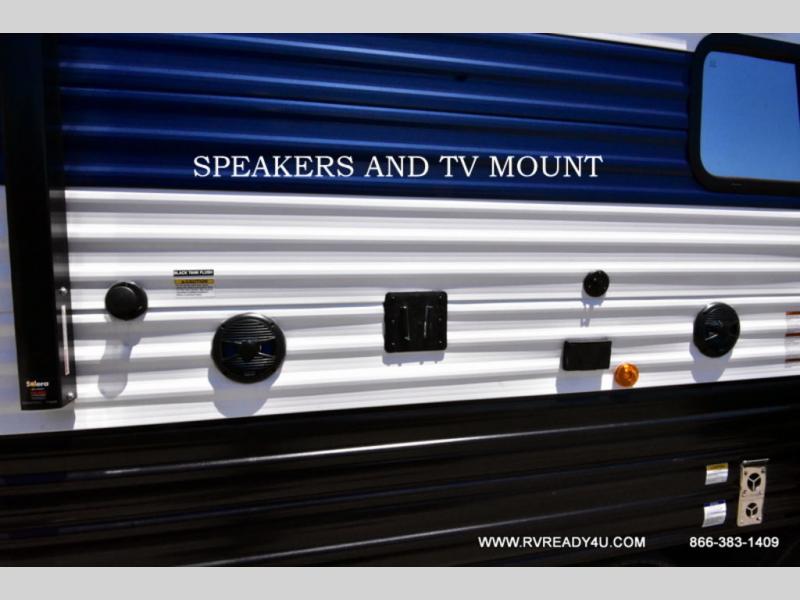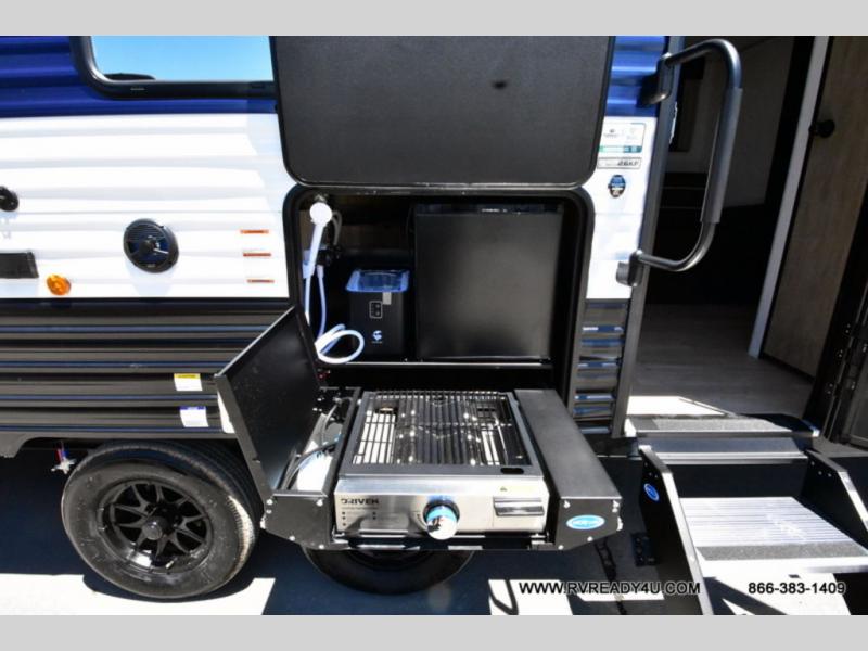 If you've been searching for a travel trailer with a larger sleeping capacity to camp with friends, this is the one! There are double-size bunks in the rear corner, and the full bath with its own exterior entry door is in the other rear corner for easy nighttime use. Up front, an RV king bed in the private bedroom is sure to bring a great night's rest, and you'll find dual bedside wardrobes to keep your clothes picked up off of the floor. In the morning, everyone can meet in the main living room that includes a large slide out, U-shaped dinette, sofa, and a fireplace with a hidden pantry behind it for smart storage solutions. There is also a TV mount here for the option to bring along your television. An outside mini kitchen will allow you to get some fresh air as you make dinner, but there's also a full interior kitchen if the weather isn't cooperating. Additional outdoor features include a rear storage rack, an outside TV mount, and a 9' power awning for some shade!
