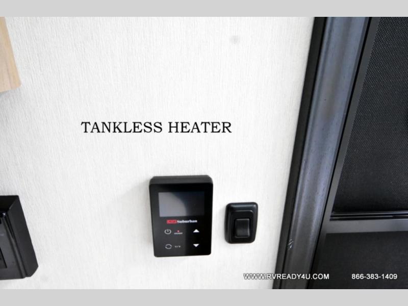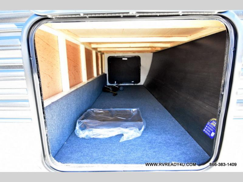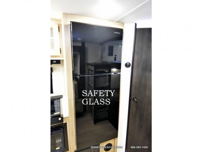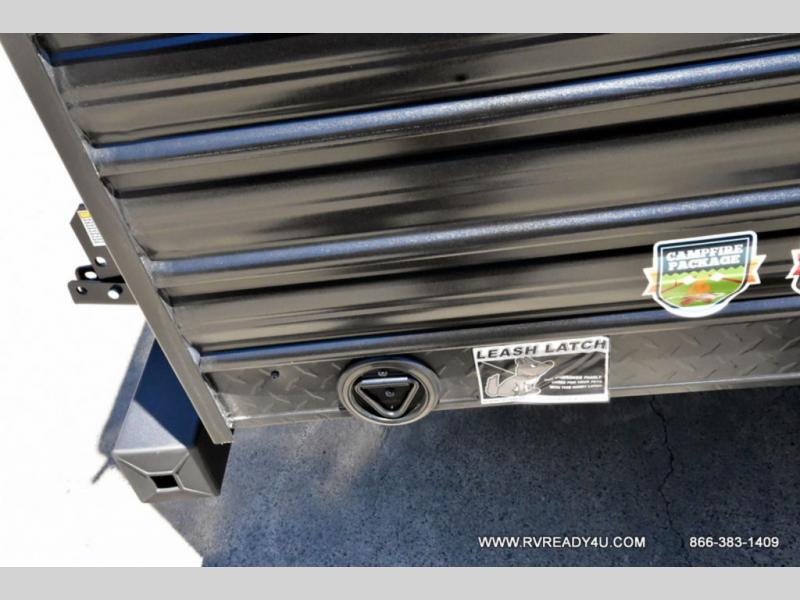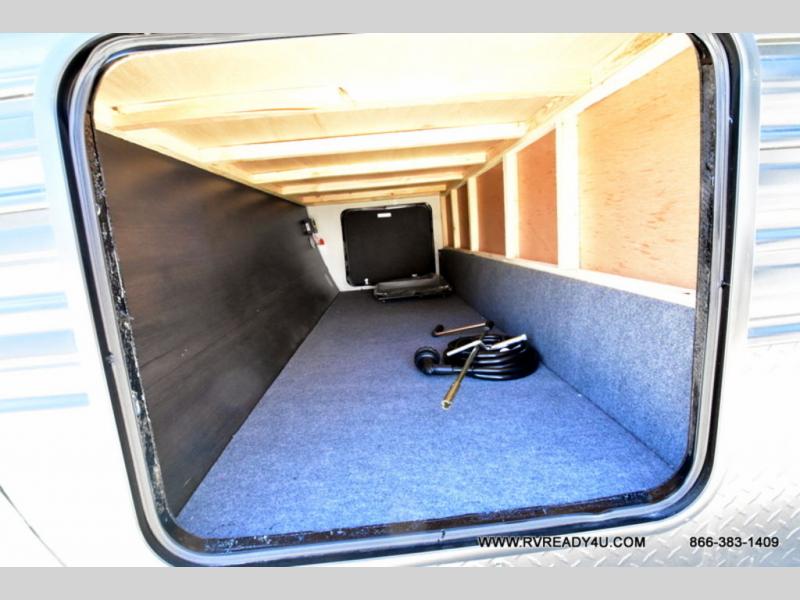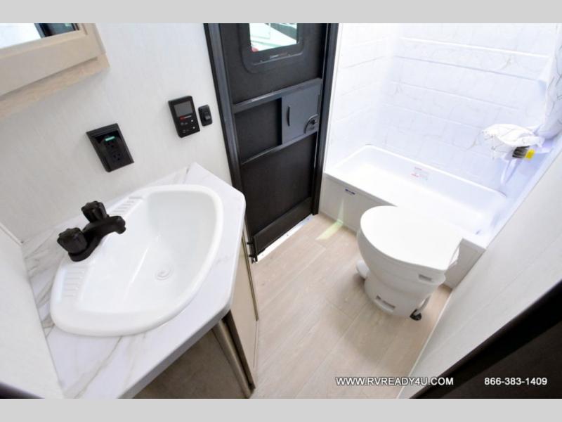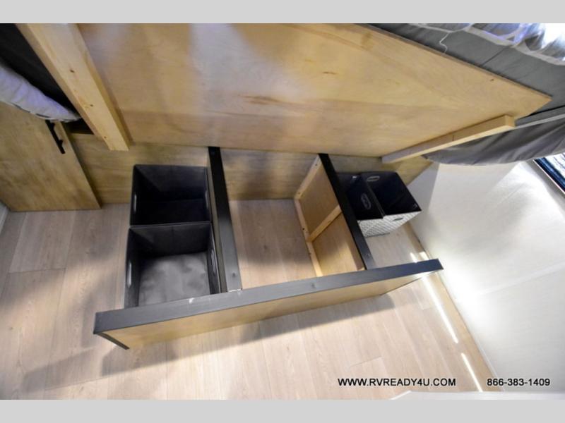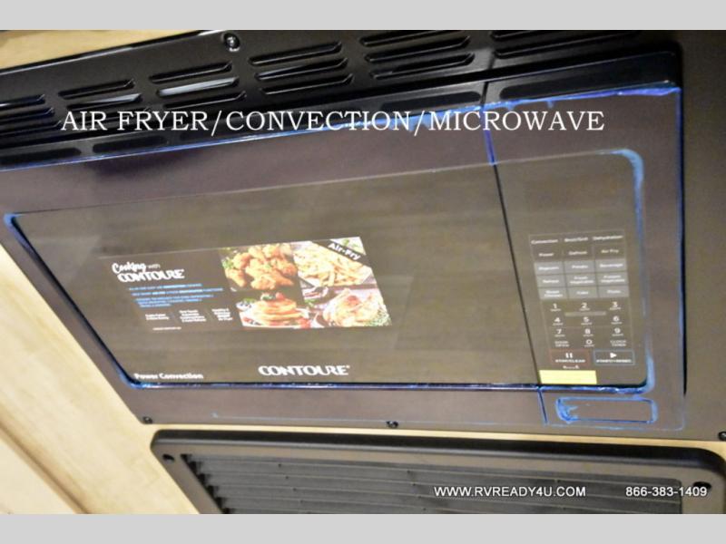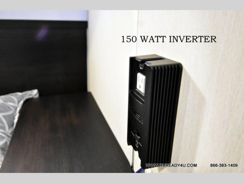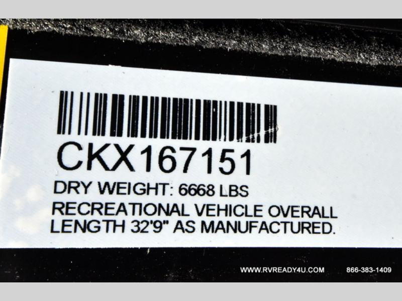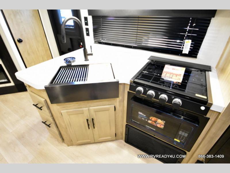 If you've been searching for a travel trailer with a larger sleeping capacity to camp with friends, this is the one! There are double-size bunks in the rear corner, and the full bath with its own exterior entry door is in the other rear corner for easy nighttime use. Up front, an RV king bed in the private bedroom is sure to bring a great night's rest, and you'll find dual bedside wardrobes to keep your clothes picked up off of the floor. In the morning, everyone can meet in the main living room that includes a large slide out, U-shaped dinette, sofa, and a fireplace with a hidden pantry behind it for smart storage solutions. There is also a TV mount here for the option to bring along your television. An outside mini kitchen will allow you to get some fresh air as you make dinner, but there's also a full interior kitchen if the weather isn't cooperating. Additional outdoor features include a rear storage rack, an outside TV mount, and a 9' power awning for some shade!