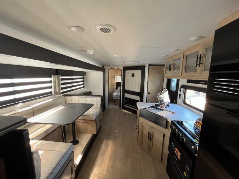 If you've been searching for a travel trailer with a larger sleeping capacity to camp with friends, this is the one! There are double-size bunks in the rear corner, and the full bath with its own exterior entry door is in the other rear corner for easy nighttime use. Up front, an RV king bed in the private bedroom is sure to bring a great night's rest, and you'll find dual bedside wardrobes to keep your clothes picked up off of the floor. In the morning, everyone can meet in the main living room that includes a large slide out, U-shaped dinette, sofa, and a fireplace with a hidden pantry behind it for smart storage solutions. There is also a TV mount here for the option to bring along your television. An outside mini kitchen will allow you to get some fresh air as you make dinner, but there's also a full interior kitchen if the weather isn't cooperating. Additional outdoor features include a rear storage rack, an outside TV mount, and a 9' power awning for some shade!