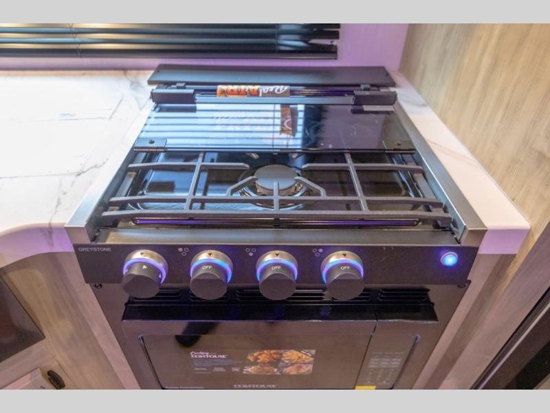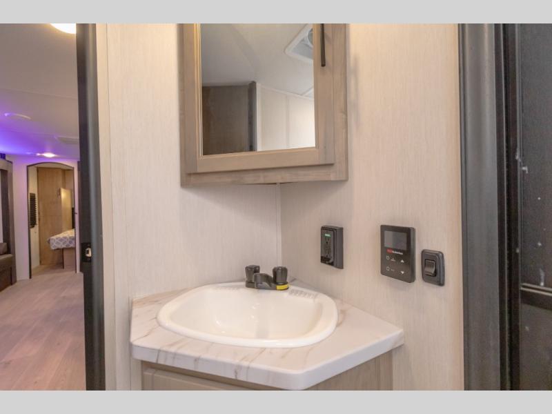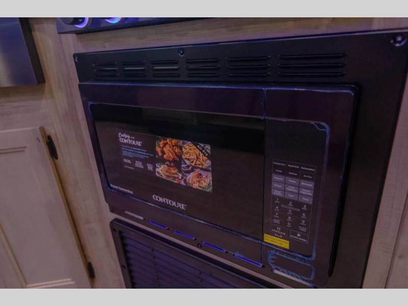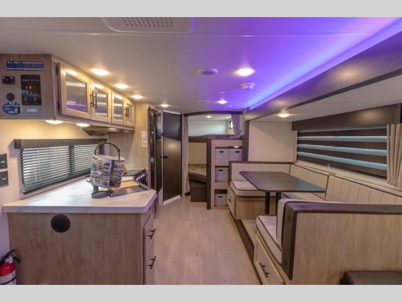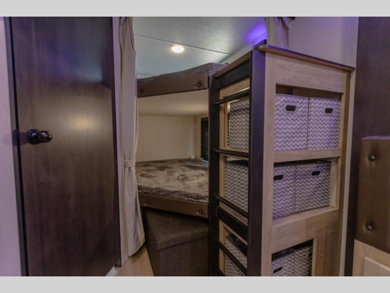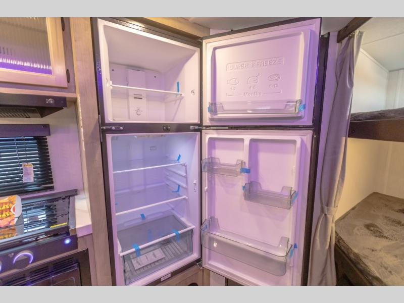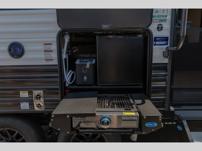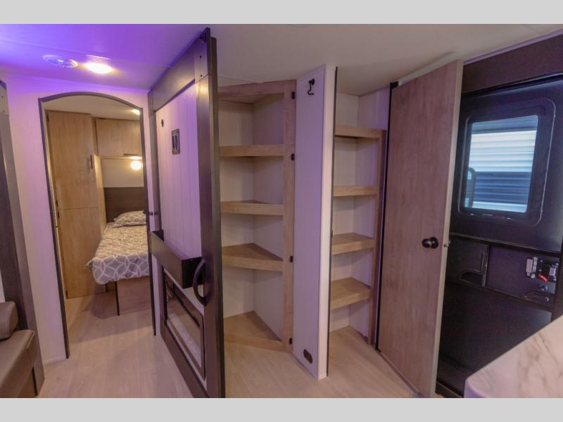 If you've been searching for a travel trailer with a larger sleeping capacity to camp with friends, this is the one! There are double-size bunks in the rear corner, and the full bath with its own exterior entry door is in the other rear corner for easy nighttime use. Up front, an RV king bed in the private bedroom is sure to bring a great night's rest, and you'll find a bedside wardrobe to keep your clothes picked up off of the floor. In the morning, everyone can meet in the main living room that includes a large slide out, U-shaped dinette, sofa, and a fireplace with a hidden pantry behind it for smart storage solutions. An outside kitchen will allow you to get some fresh air as you make dinner, but there's also a full interior kitchen if the weather isn't cooperating. Additional outdoor features include a rear storage rack, an outside TV mount, and a 15' awning for some shade!
