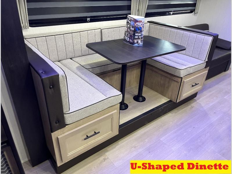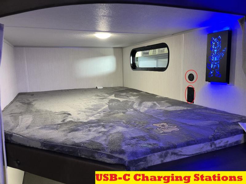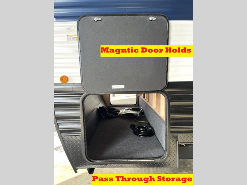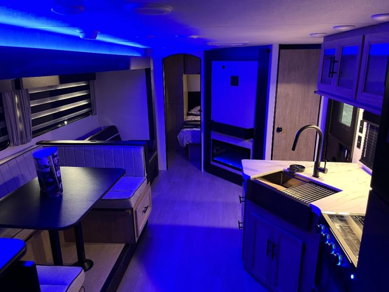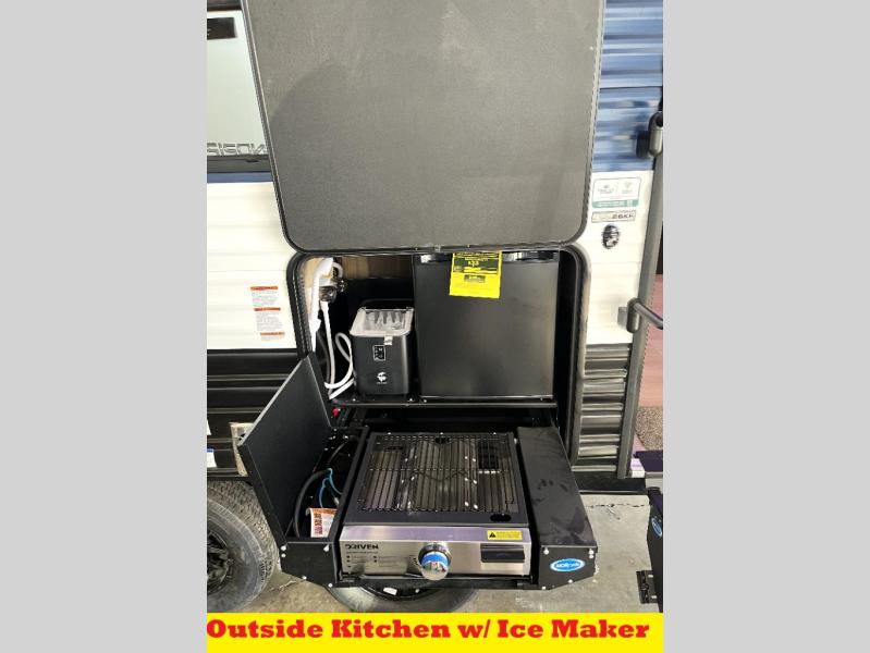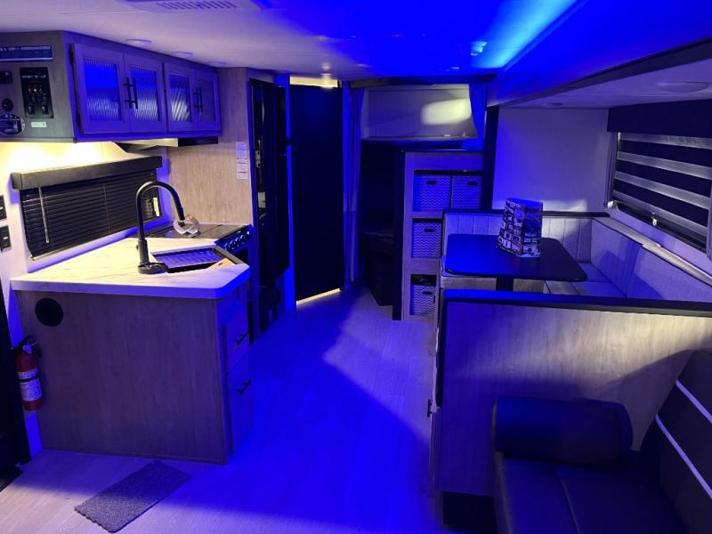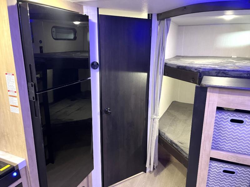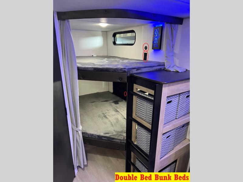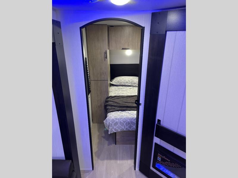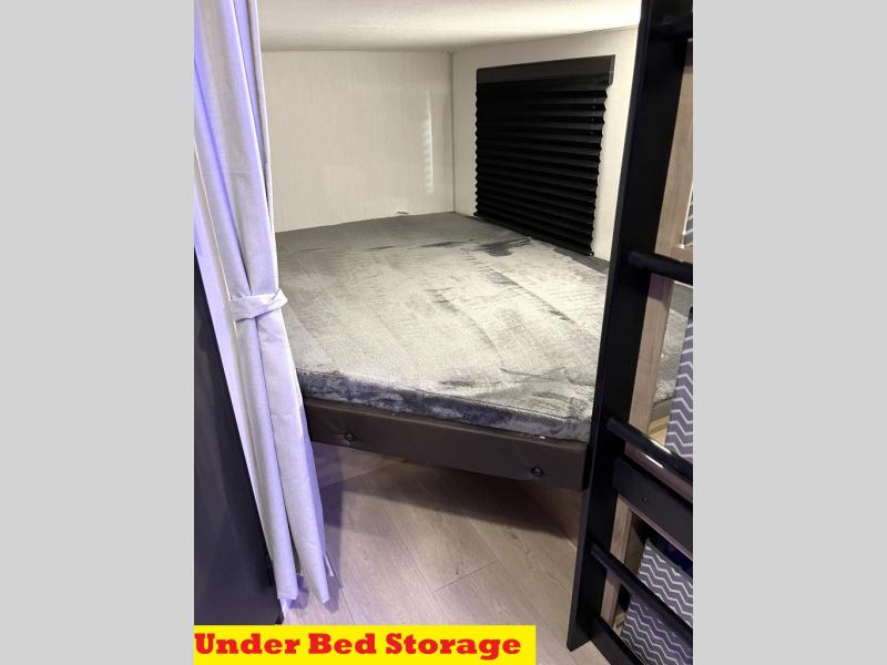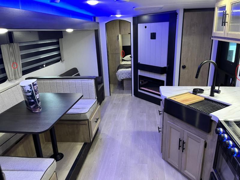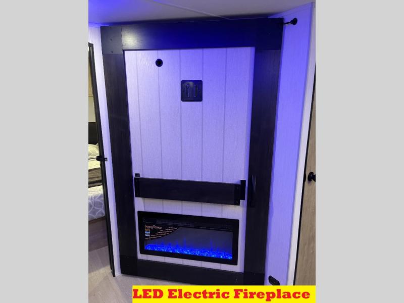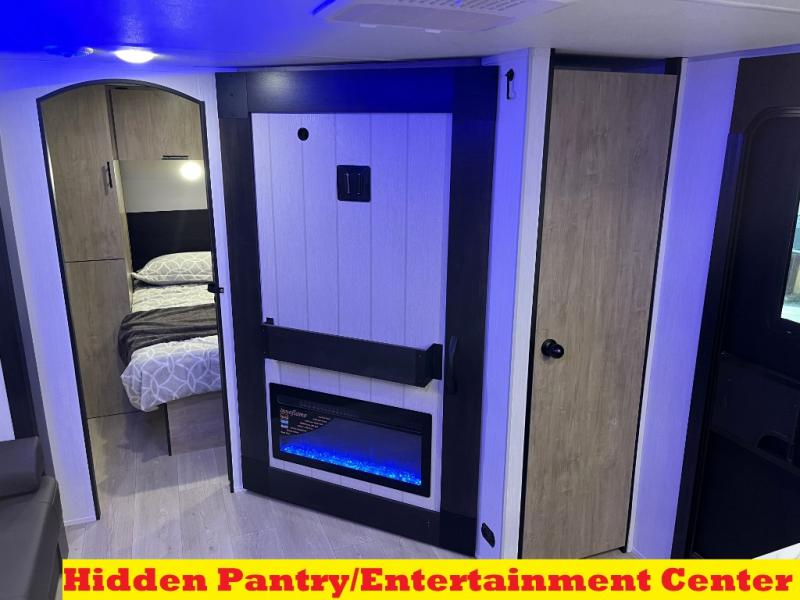 If you've been searching for a travel trailer with a larger sleeping capacity to camp with friends, this is the one! There are double-size bunks in the rear corner, and the full bath with its own exterior entry door is in the other rear corner for easy nighttime use. Up front, an RV king bed in the private bedroom is sure to bring a great night's rest, and you'll find a bedside wardrobe to keep your clothes picked up off of the floor. In the morning, everyone can meet in the main living room that includes a large slide out, U-shaped dinette, sofa, and a fireplace with a hidden pantry behind it for smart storage solutions. An outside kitchen will allow you to get some fresh air as you make dinner, but there's also a full interior kitchen if the weather isn't cooperating. Additional outdoor features include a rear storage rack, an outside TV mount, and a 15' awning for some shade!