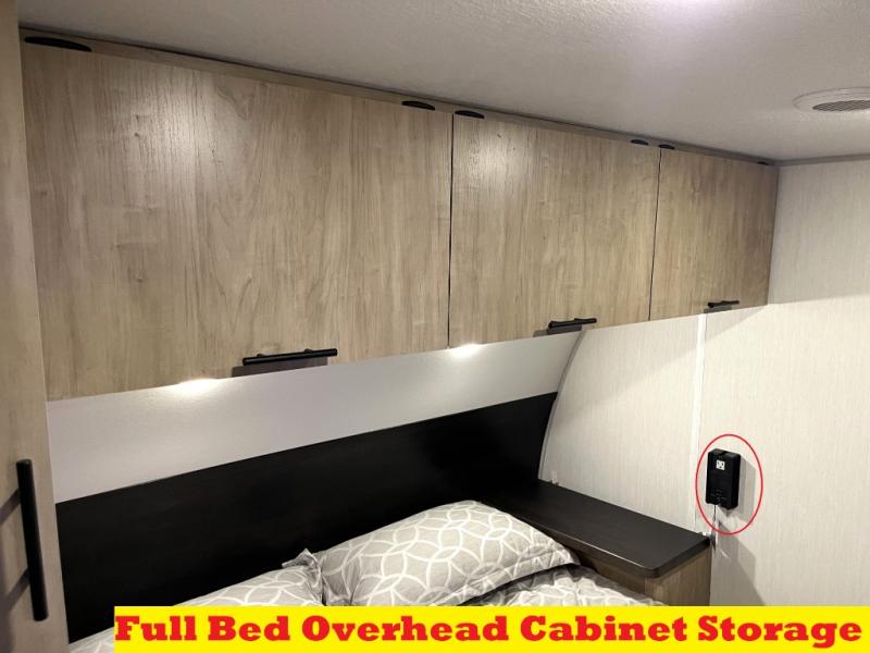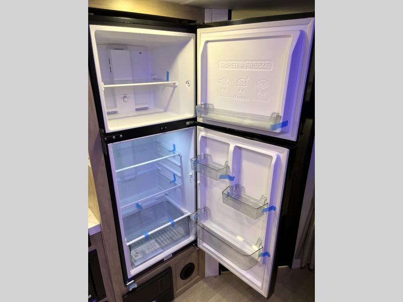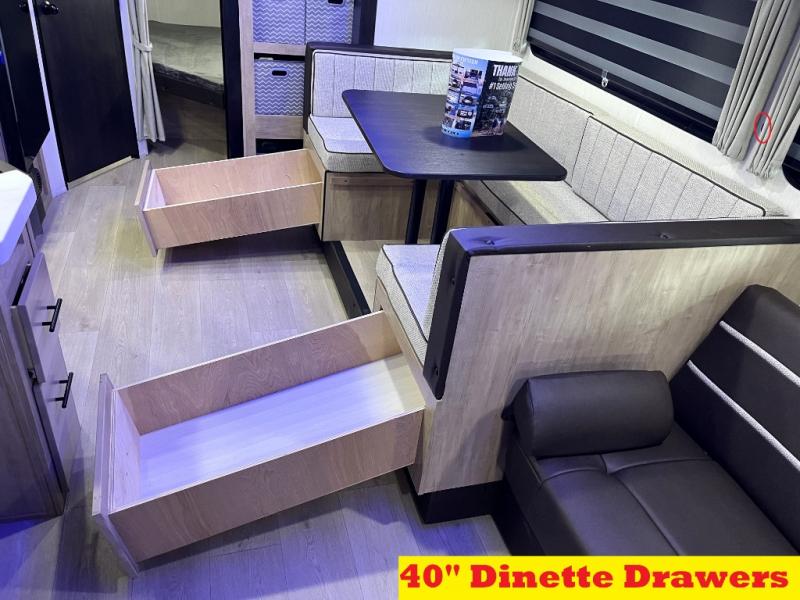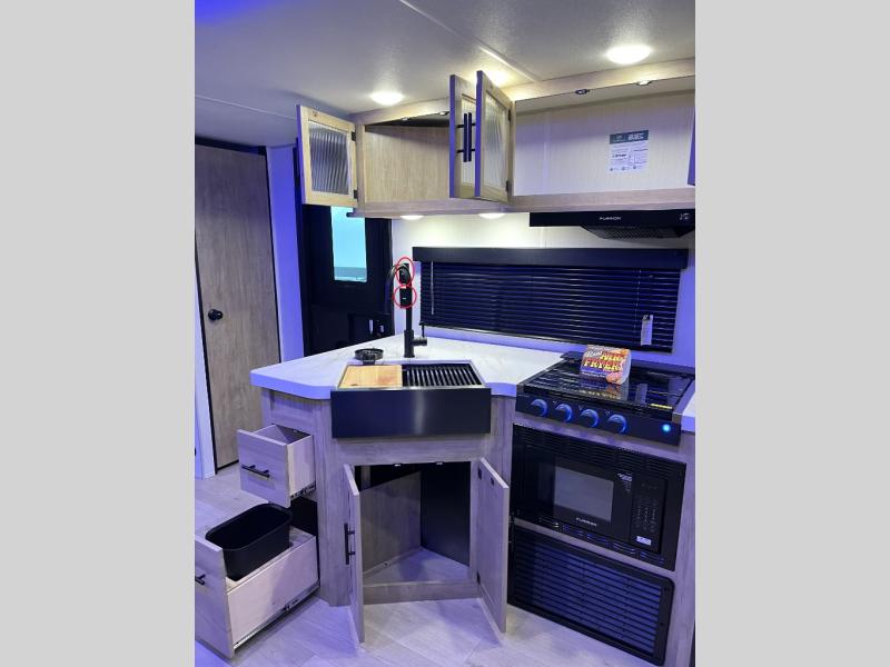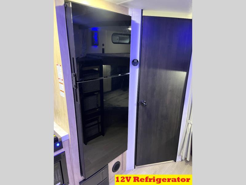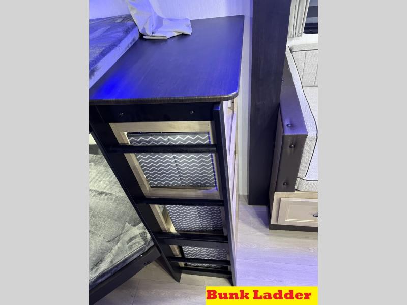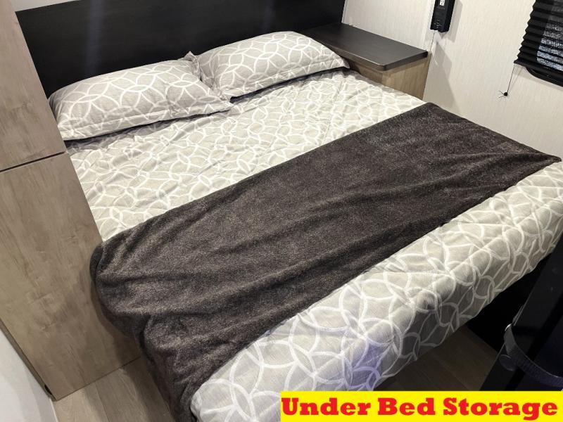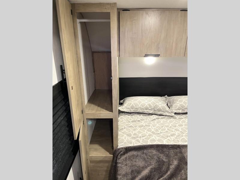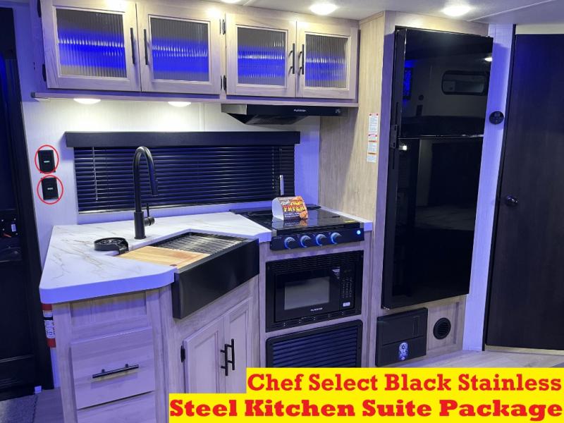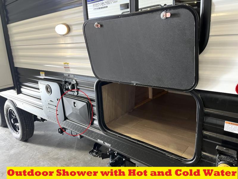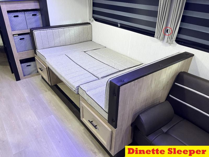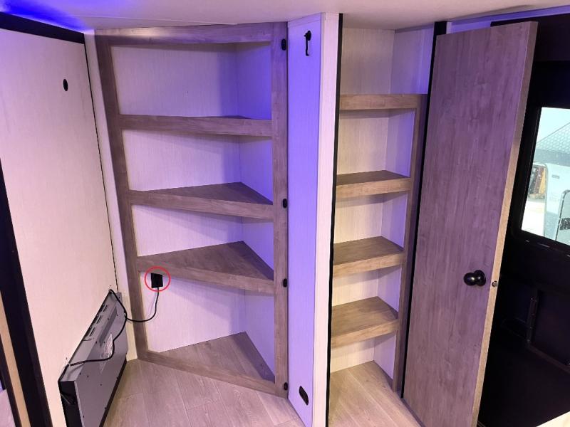 If you've been searching for a travel trailer with a larger sleeping capacity to camp with friends, this is the one! There are double-size bunks in the rear corner, and the full bath with its own exterior entry door is in the other rear corner for easy nighttime use. Up front, an RV king bed in the private bedroom is sure to bring a great night's rest, and you'll find a bedside wardrobe to keep your clothes picked up off of the floor. In the morning, everyone can meet in the main living room that includes a large slide out, U-shaped dinette, sofa, and a fireplace with a hidden pantry behind it for smart storage solutions. An outside kitchen will allow you to get some fresh air as you make dinner, but there's also a full interior kitchen if the weather isn't cooperating. Additional outdoor features include a rear storage rack, an outside TV mount, and a 15' awning for some shade!
