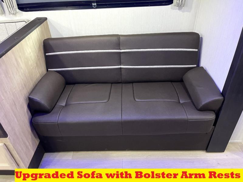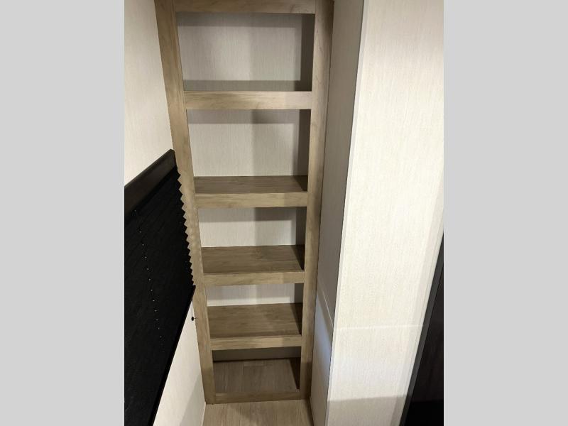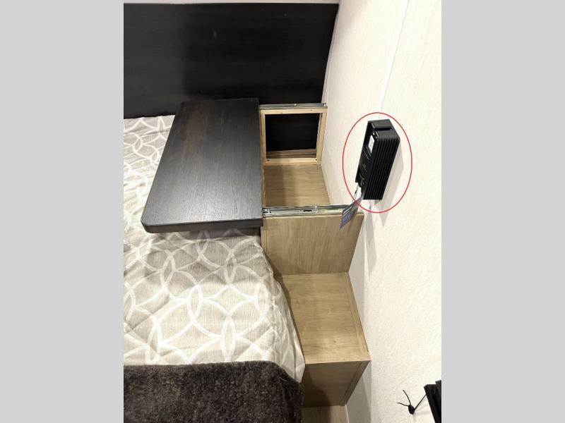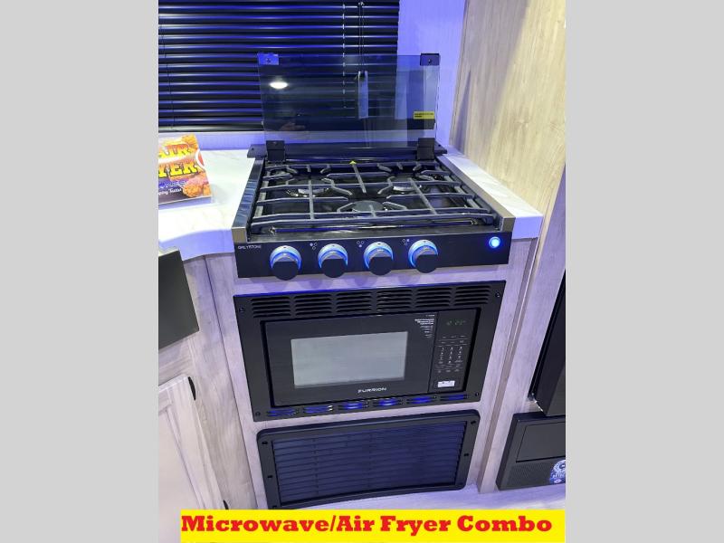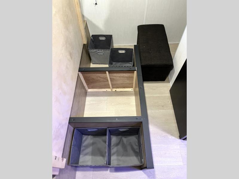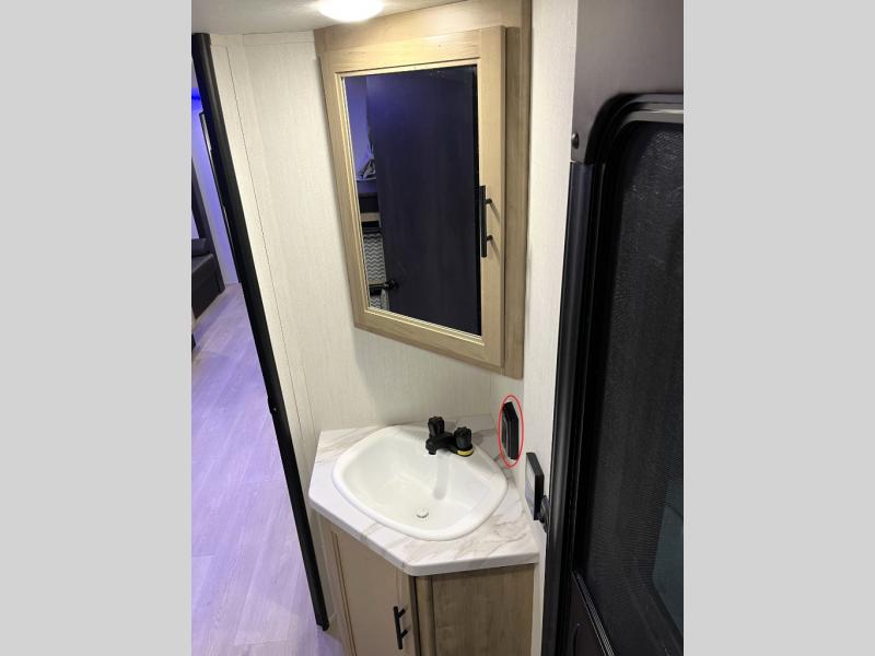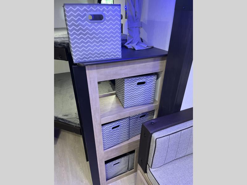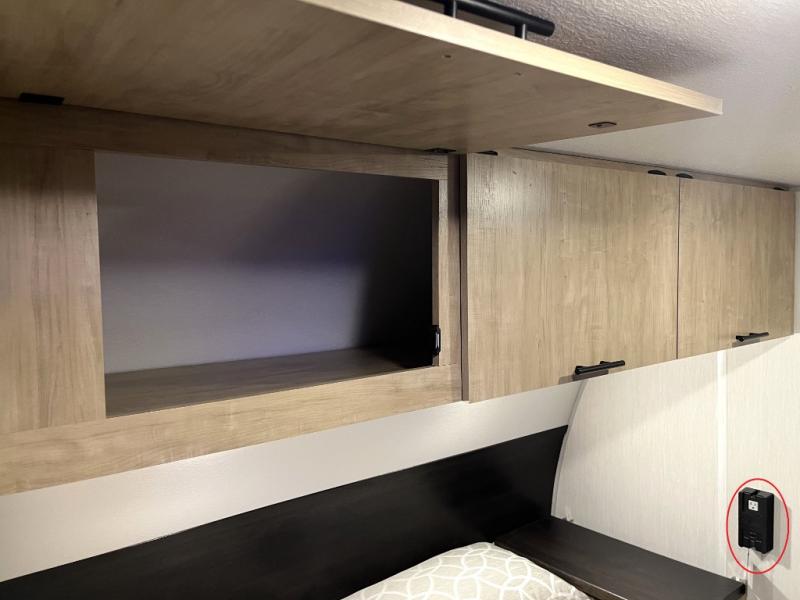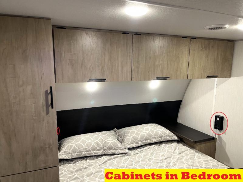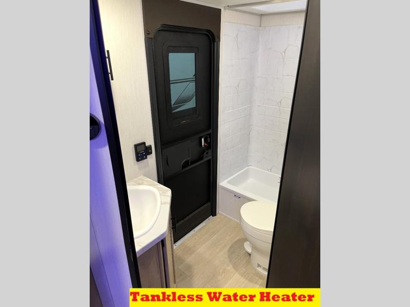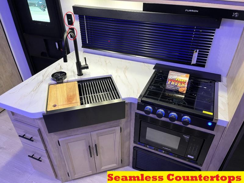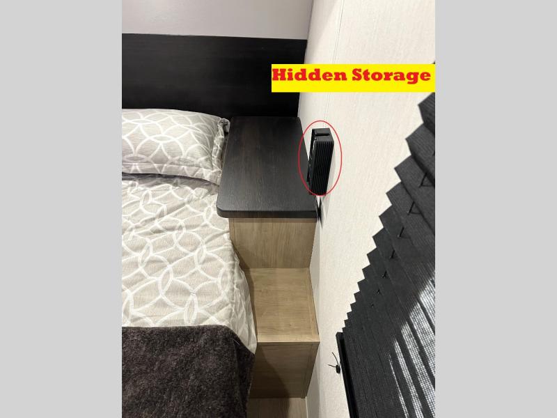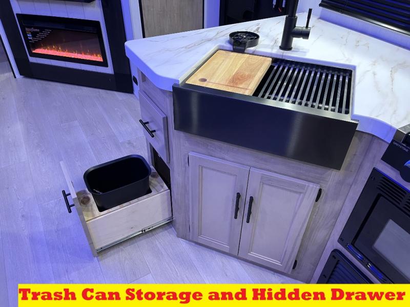 If you've been searching for a travel trailer with a larger sleeping capacity to camp with friends, this is the one! There are double-size bunks in the rear corner, and the full bath with its own exterior entry door is in the other rear corner for easy nighttime use. Up front, an RV king bed in the private bedroom is sure to bring a great night's rest, and you'll find a bedside wardrobe to keep your clothes picked up off of the floor. In the morning, everyone can meet in the main living room that includes a large slide out, U-shaped dinette, sofa, and a fireplace with a hidden pantry behind it for smart storage solutions. An outside kitchen will allow you to get some fresh air as you make dinner, but there's also a full interior kitchen if the weather isn't cooperating. Additional outdoor features include a rear storage rack, an outside TV mount, and a 15' awning for some shade!