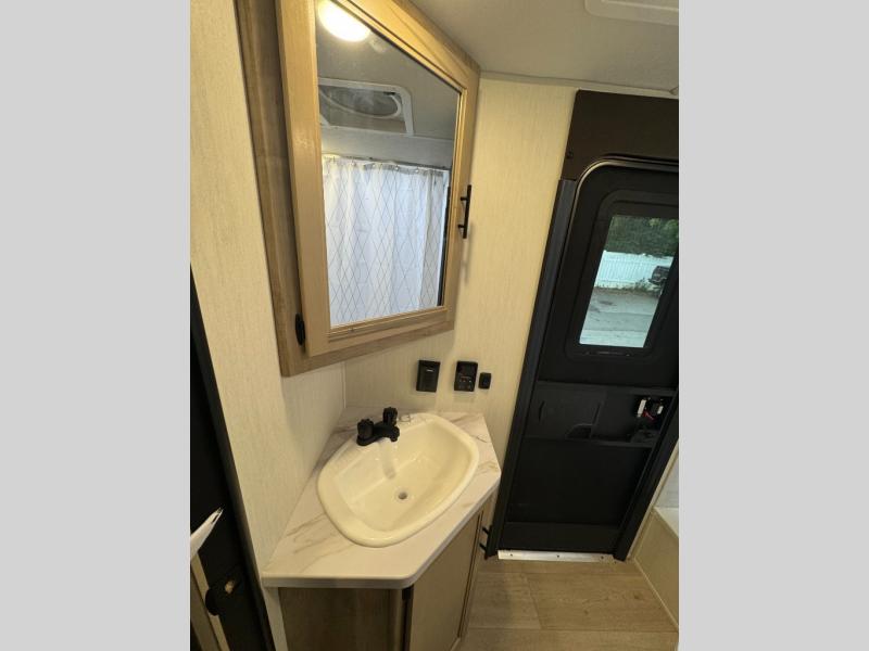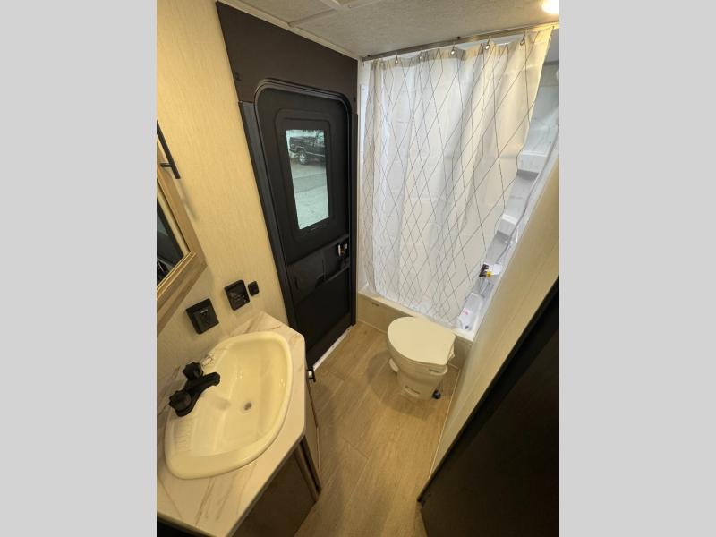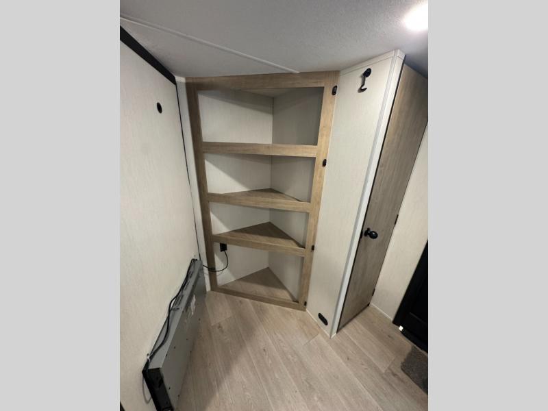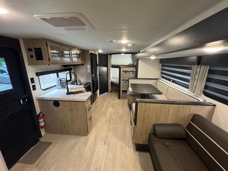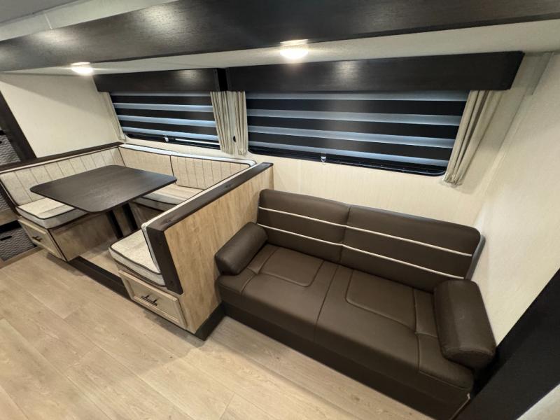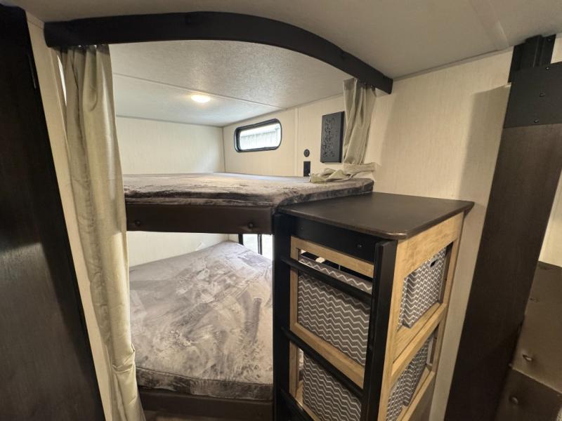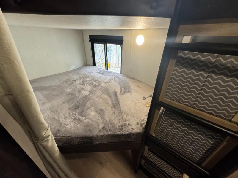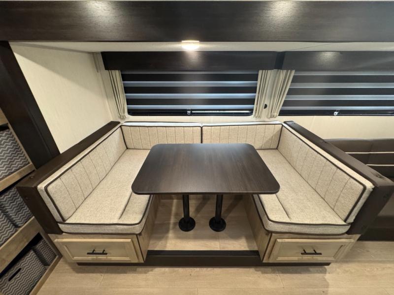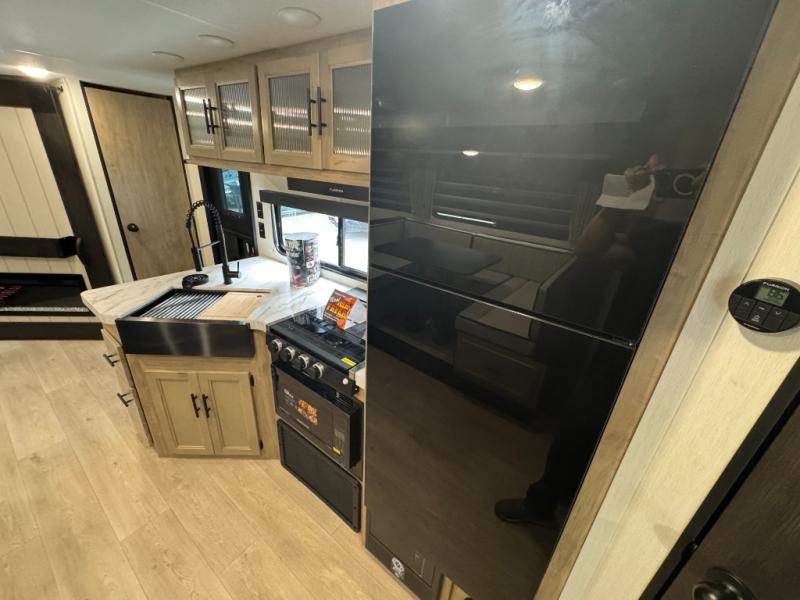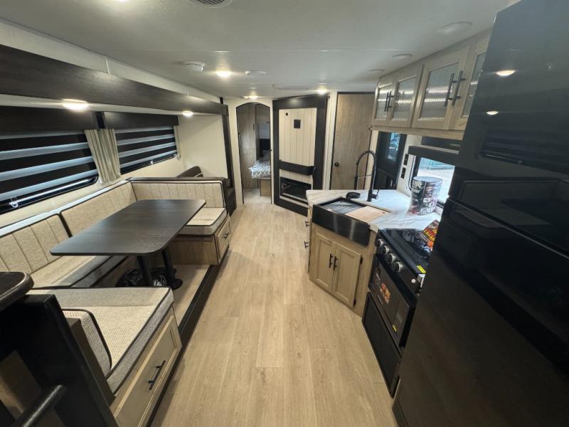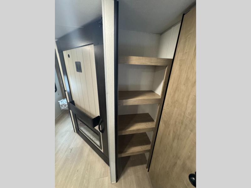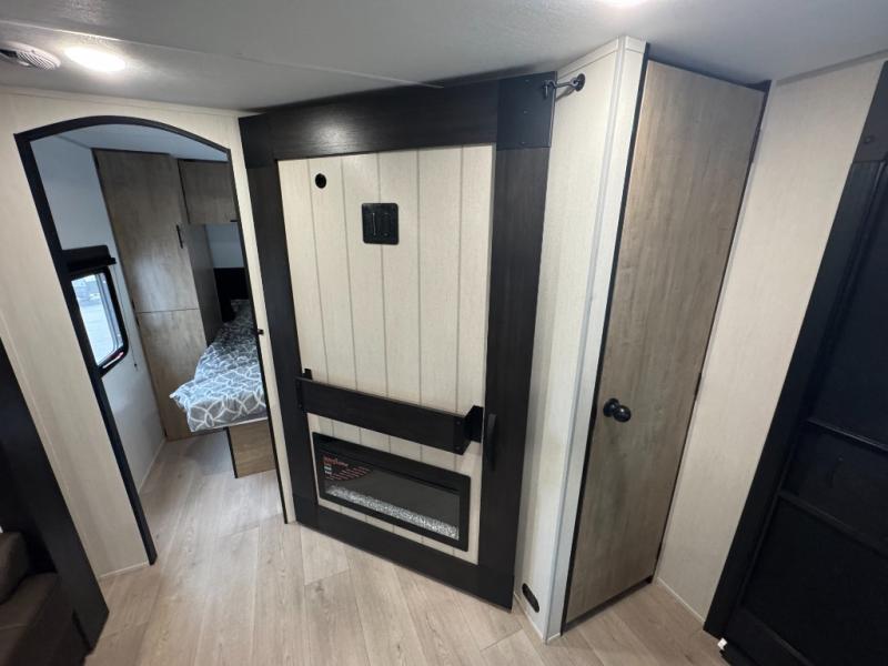 If you've been searching for a travel trailer with a larger sleeping capacity to camp with friends, this is the one! There are double-size bunks in the rear corner, and the full bath with its own exterior entry door is in the other rear corner for easy nighttime use. Up front, an RV king bed in the private bedroom is sure to bring a great night's rest, and you'll find a bedside wardrobe to keep your clothes picked up off of the floor. In the morning, everyone can meet in the main living room that includes a large slide out, U-shaped dinette, sofa, and a fireplace with a hidden pantry behind it for smart storage solutions. An outside kitchen will allow you to get some fresh air as you make dinner, but there's also a full interior kitchen if the weather isn't cooperating. Additional outdoor features include a rear storage rack, an outside TV mount, and a 15' awning for some shade!