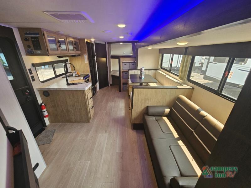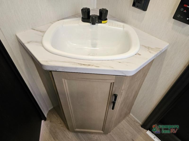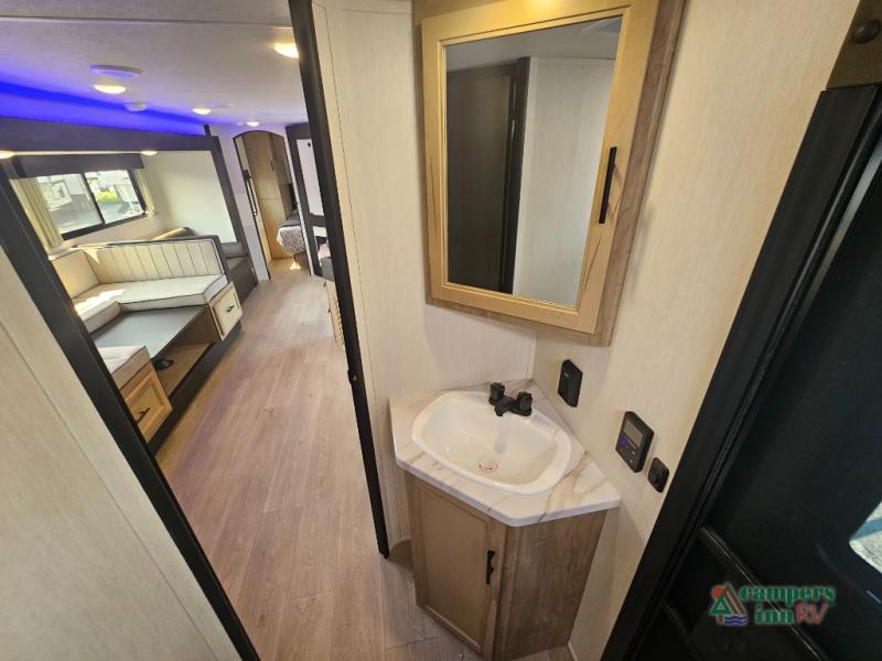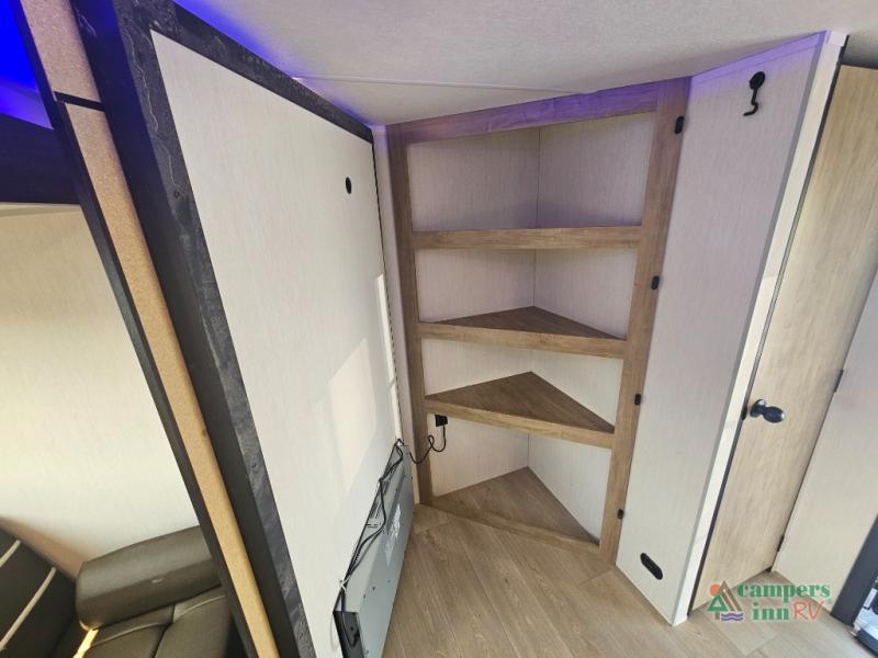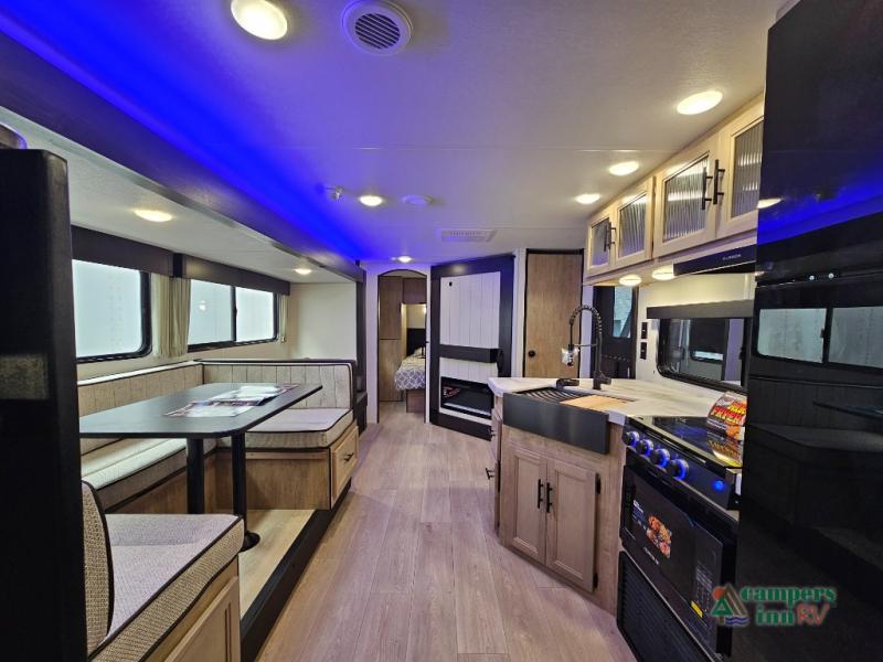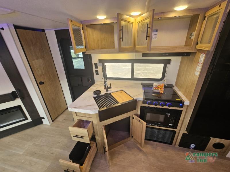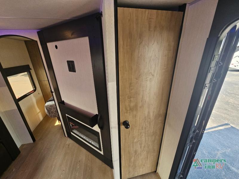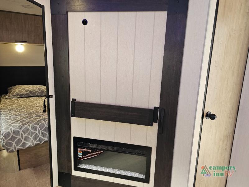 If you've been searching for a travel trailer with a larger sleeping capacity to camp with friends, this is the one! There are double-size bunks in the rear corner, and the full bath with its own exterior entry door is in the other rear corner for easy nighttime use. Up front, an RV king bed in the private bedroom is sure to bring a great night's rest, and you'll find a bedside wardrobe to keep your clothes picked up off of the floor. In the morning, everyone can meet in the main living room that includes a large slide out, U-shaped dinette, sofa, and a fireplace with a hidden pantry behind it for smart storage solutions. An outside kitchen will allow you to get some fresh air as you make dinner, but there's also a full interior kitchen if the weather isn't cooperating. Additional outdoor features include a rear storage rack, an outside TV mount, and a 15' awning for some shade!