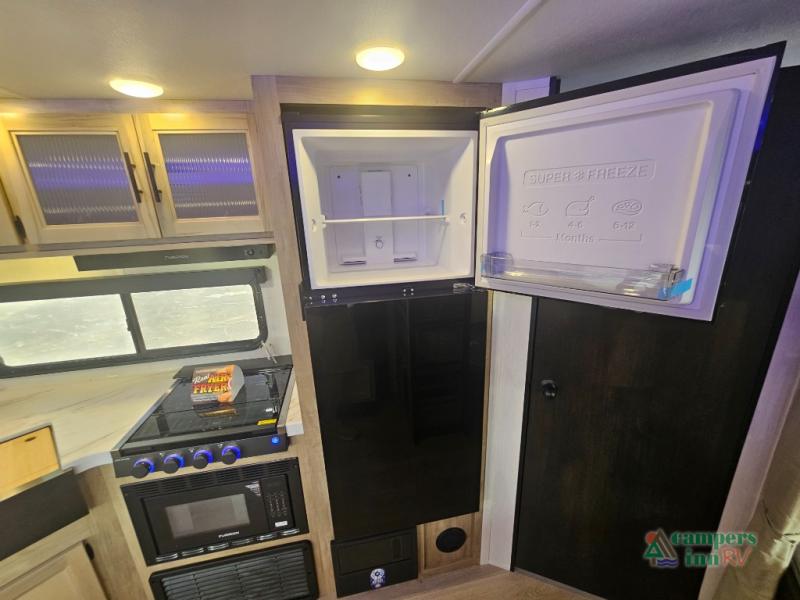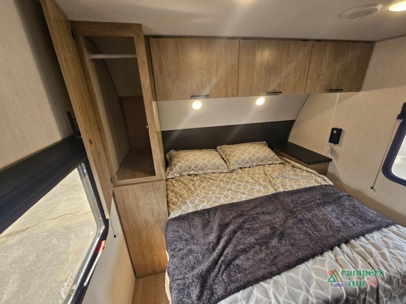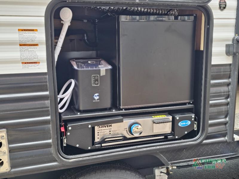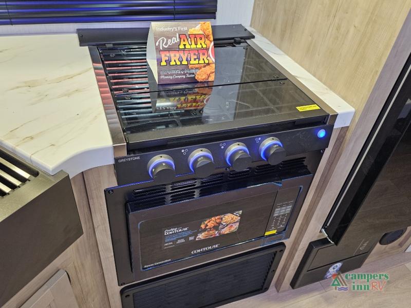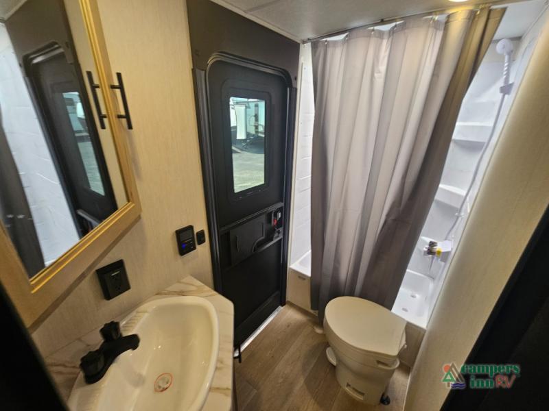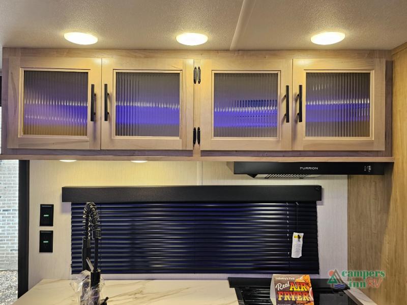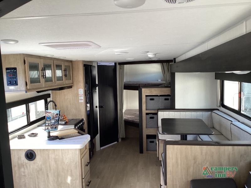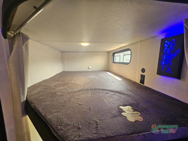 If you've been searching for a travel trailer with a larger sleeping capacity to camp with friends, this is the one! There are double-size bunks in the rear corner, and the full bath with its own exterior entry door is in the other rear corner for easy nighttime use. Up front, an RV king bed in the private bedroom is sure to bring a great night's rest, and you'll find a bedside wardrobe to keep your clothes picked up off of the floor. In the morning, everyone can meet in the main living room that includes a large slide out, U-shaped dinette, sofa, and a fireplace with a hidden pantry behind it for smart storage solutions. An outside kitchen will allow you to get some fresh air as you make dinner, but there's also a full interior kitchen if the weather isn't cooperating. Additional outdoor features include a rear storage rack, an outside TV mount, and a 15' awning for some shade!