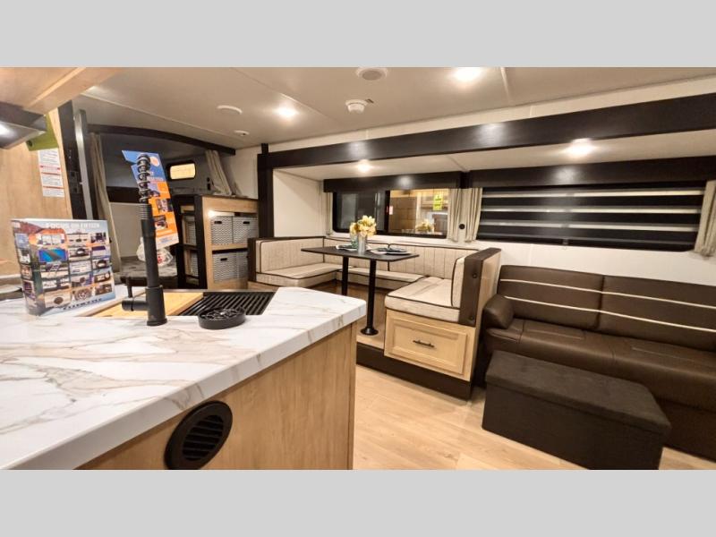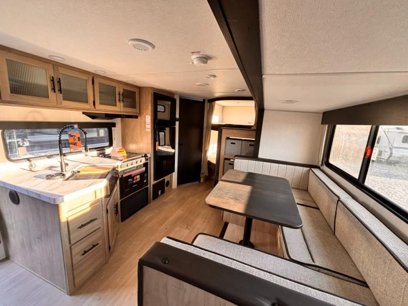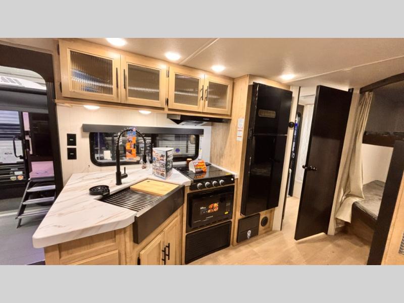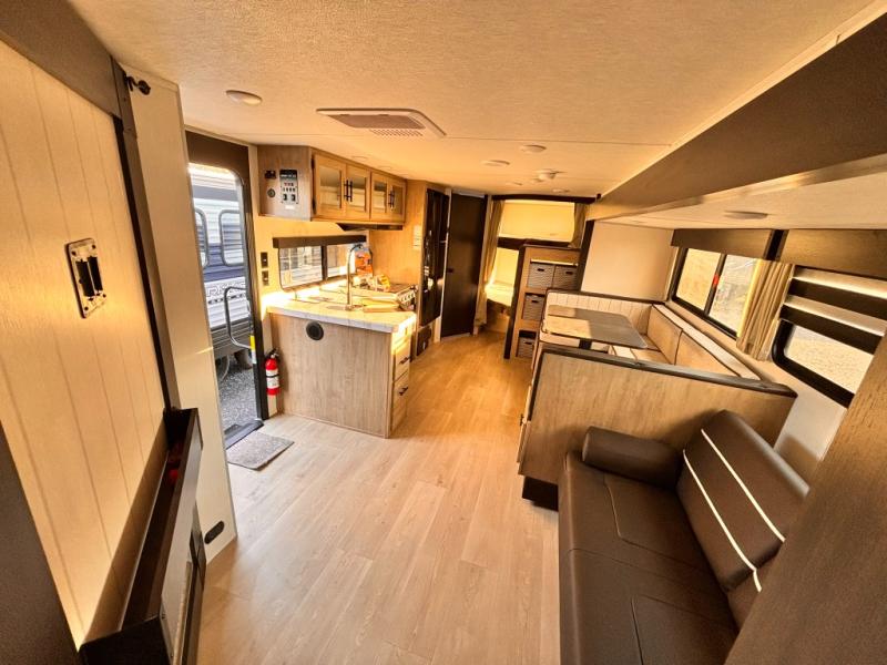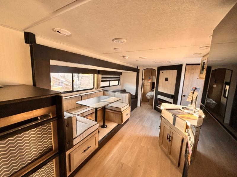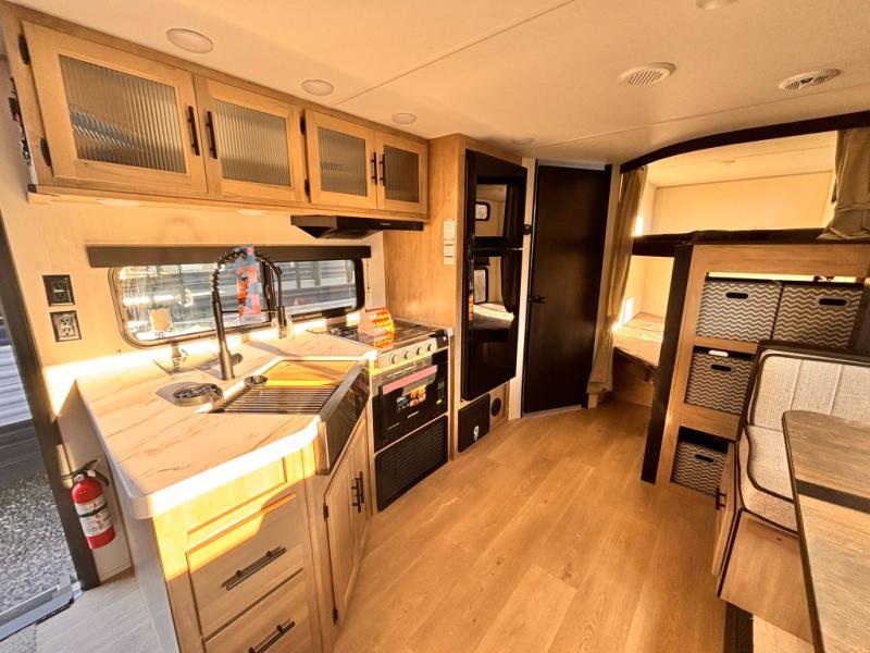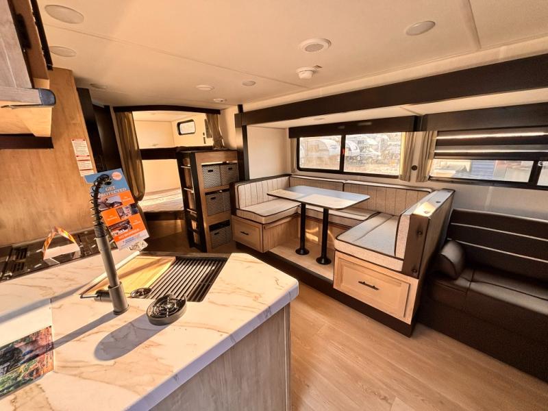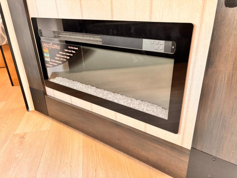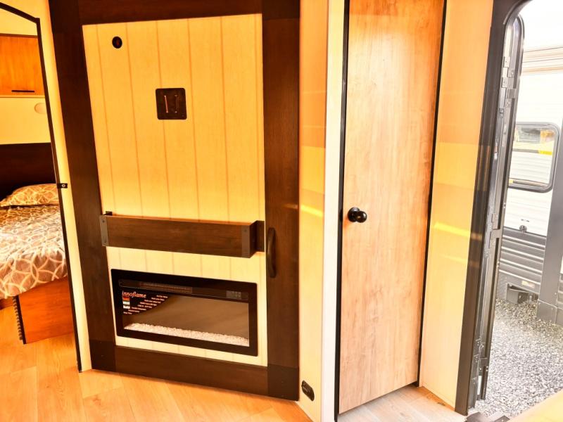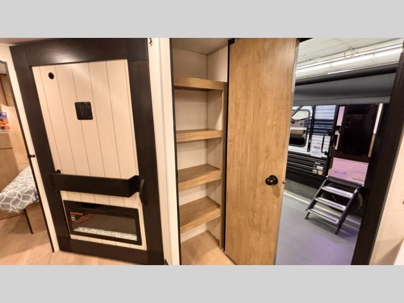 If you've been searching for a travel trailer with a larger sleeping capacity to camp with friends, this is the one! There are double-size bunks in the rear corner, and the full bath with its own exterior entry door is in the other rear corner for easy nighttime use. Up front, an RV king bed in the private bedroom is sure to bring a great night's rest, and you'll find a bedside wardrobe to keep your clothes picked up off of the floor. In the morning, everyone can meet in the main living room that includes a large slide out, U-shaped dinette, sofa, and a fireplace with a hidden pantry behind it for smart storage solutions. An outside kitchen will allow you to get some fresh air as you make dinner, but there's also a full interior kitchen if the weather isn't cooperating. Additional outdoor features include a rear storage rack, an outside TV mount, and a 15' awning for some shade!