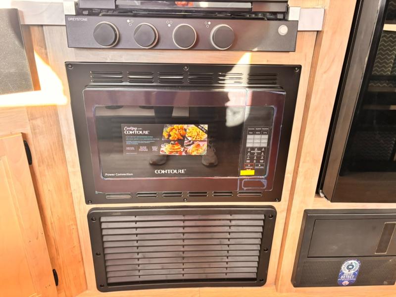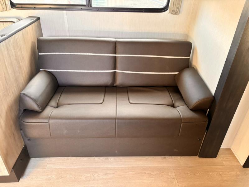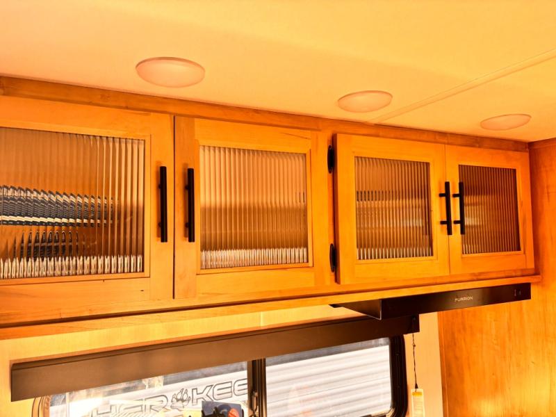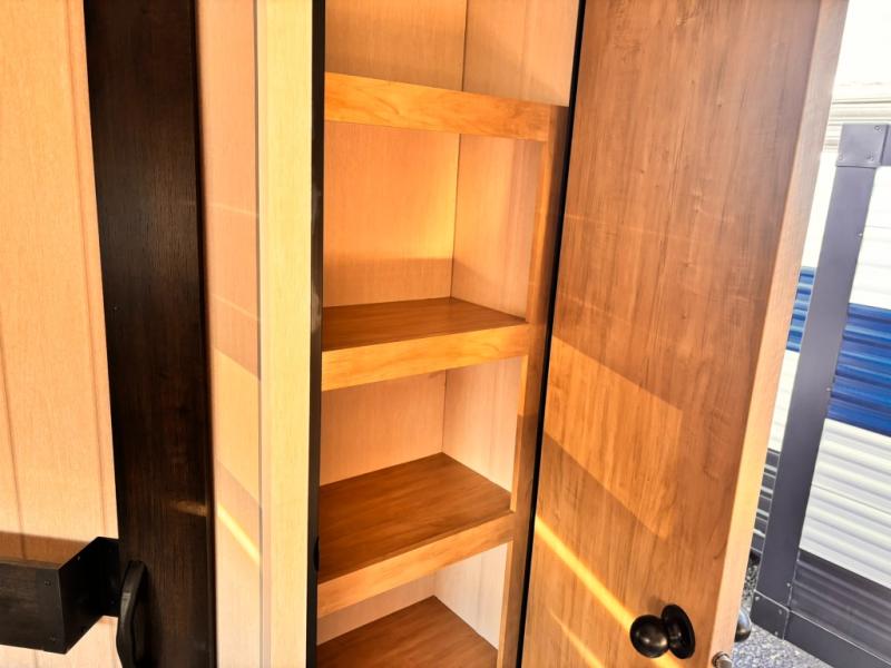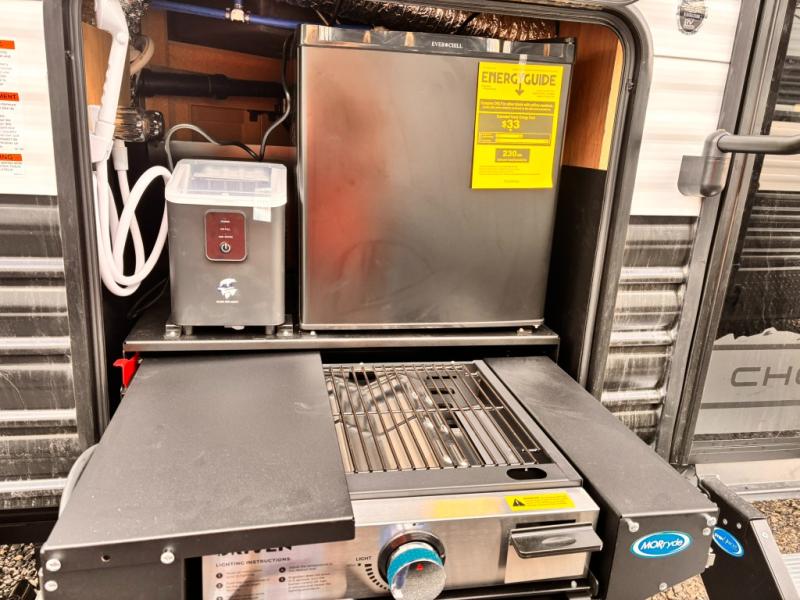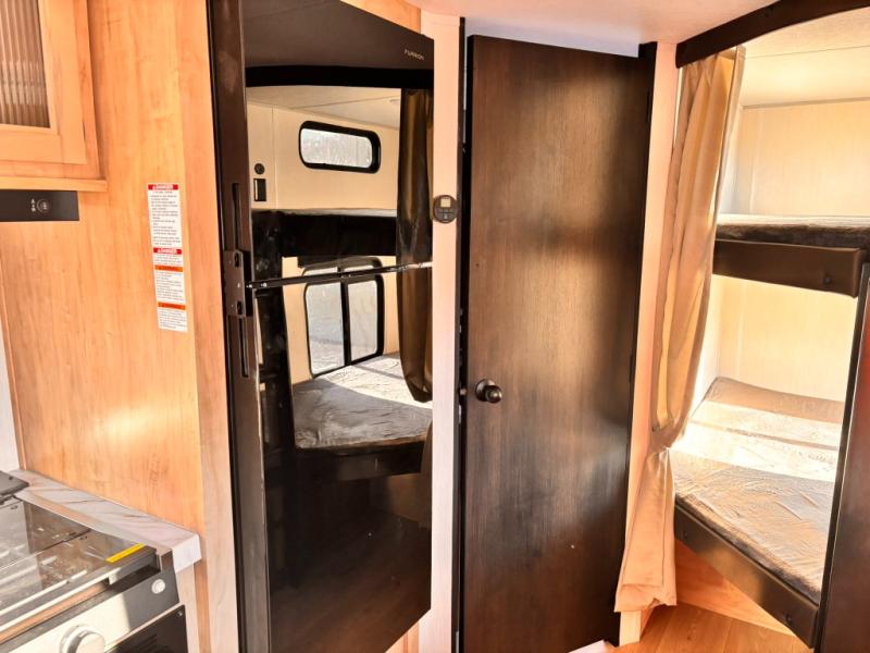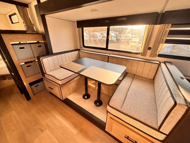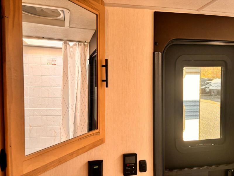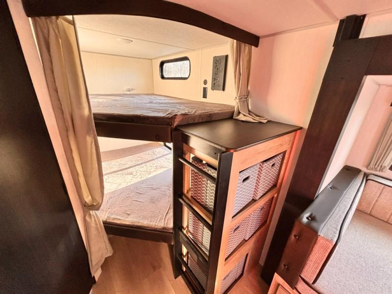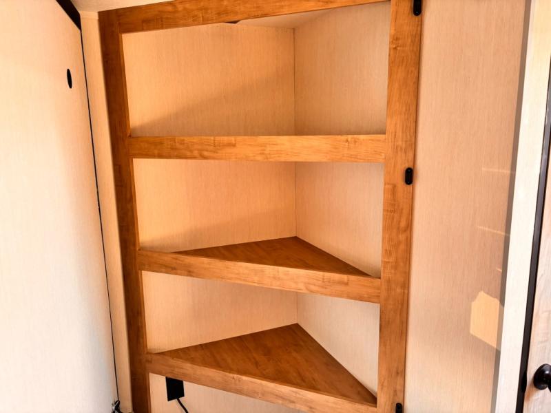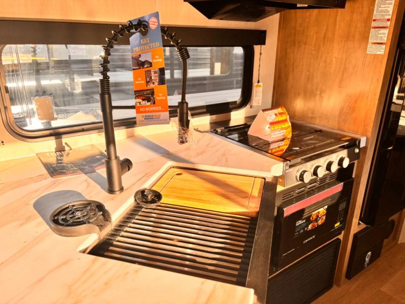 If you've been searching for a travel trailer with a larger sleeping capacity to camp with friends, this is the one! There are double-size bunks in the rear corner, and the full bath with its own exterior entry door is in the other rear corner for easy nighttime use. Up front, an RV king bed in the private bedroom is sure to bring a great night's rest, and you'll find a bedside wardrobe to keep your clothes picked up off of the floor. In the morning, everyone can meet in the main living room that includes a large slide out, U-shaped dinette, sofa, and a fireplace with a hidden pantry behind it for smart storage solutions. An outside kitchen will allow you to get some fresh air as you make dinner, but there's also a full interior kitchen if the weather isn't cooperating. Additional outdoor features include a rear storage rack, an outside TV mount, and a 15' awning for some shade!