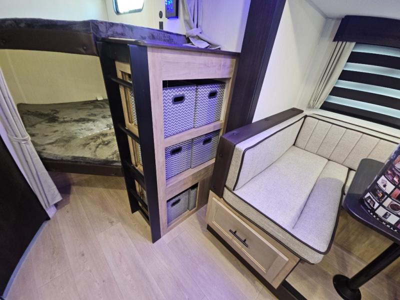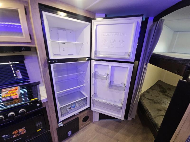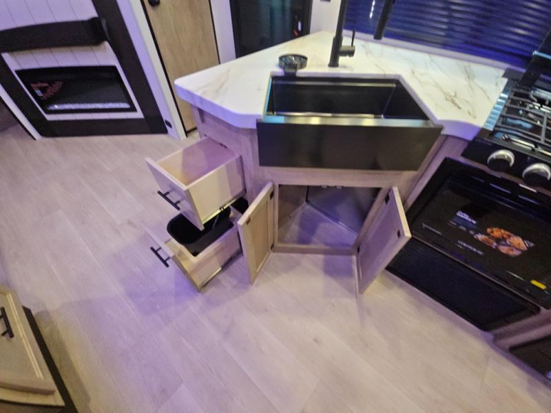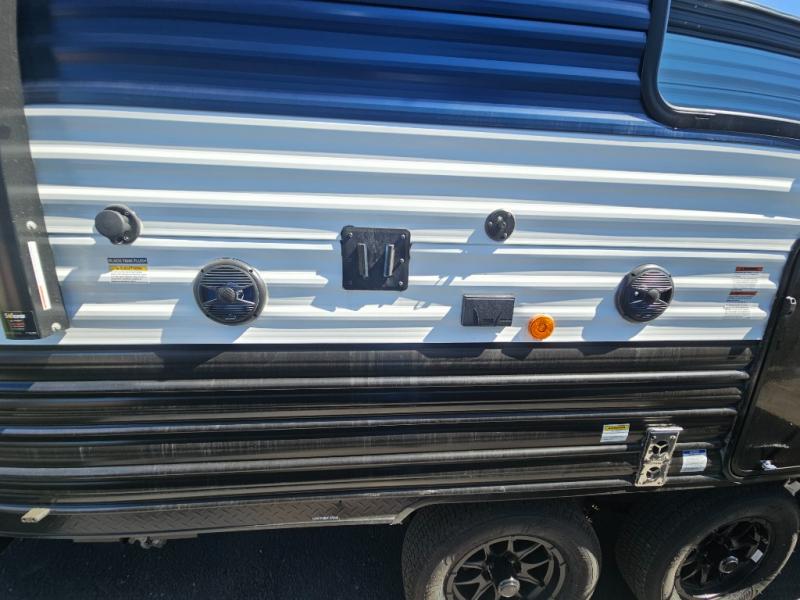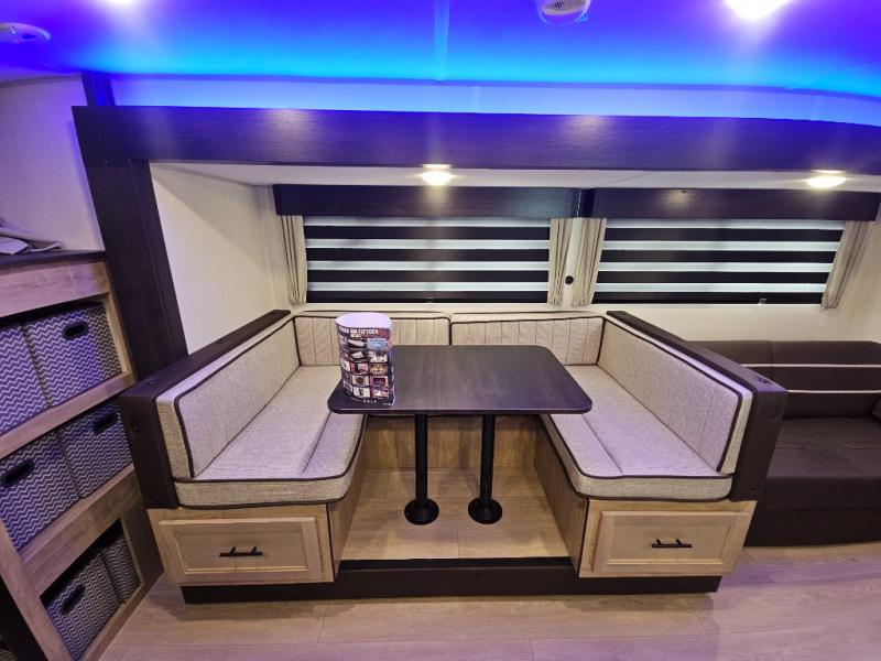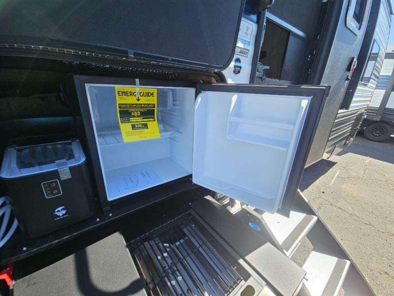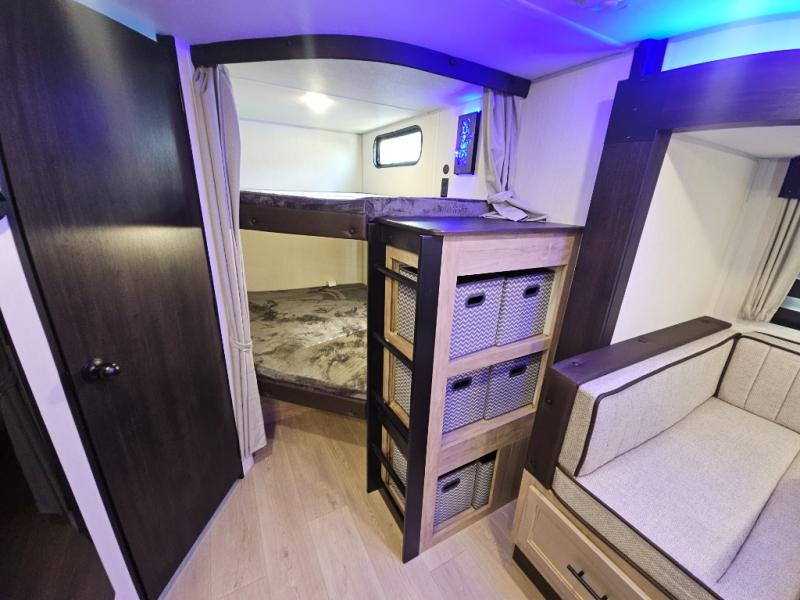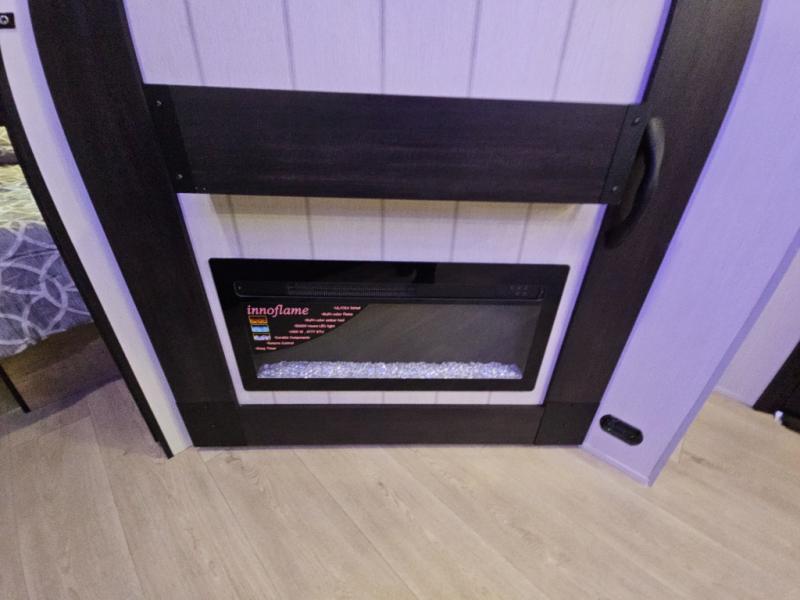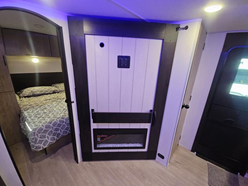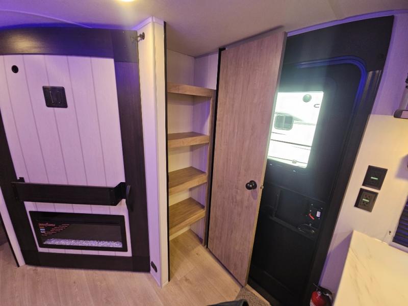 If you've been searching for a travel trailer with a larger sleeping capacity to camp with friends, this is the one! There are double-size bunks in the rear corner, and the full bath with its own exterior entry door is in the other rear corner for easy nighttime use. Up front, an RV king bed in the private bedroom is sure to bring a great night's rest, and you'll find a bedside wardrobe to keep your clothes picked up off of the floor. In the morning, everyone can meet in the main living room that includes a large slide out, U-shaped dinette, sofa, and a fireplace with a hidden pantry behind it for smart storage solutions. An outside kitchen will allow you to get some fresh air as you make dinner, but there's also a full interior kitchen if the weather isn't cooperating. Additional outdoor features include a rear storage rack, an outside TV mount, and a 15' awning for some shade!