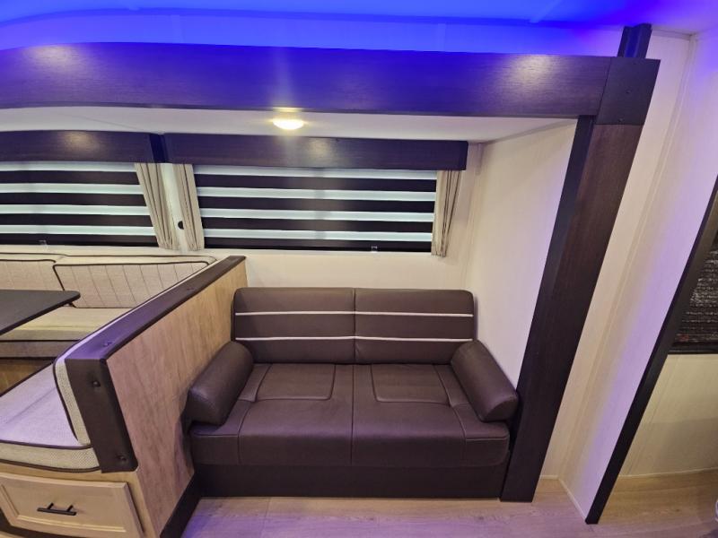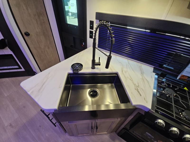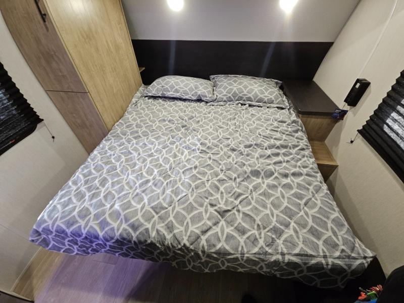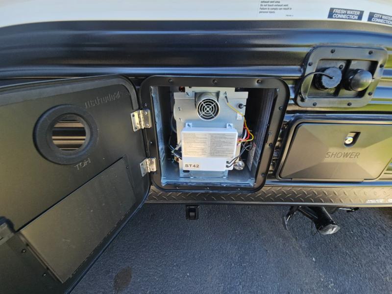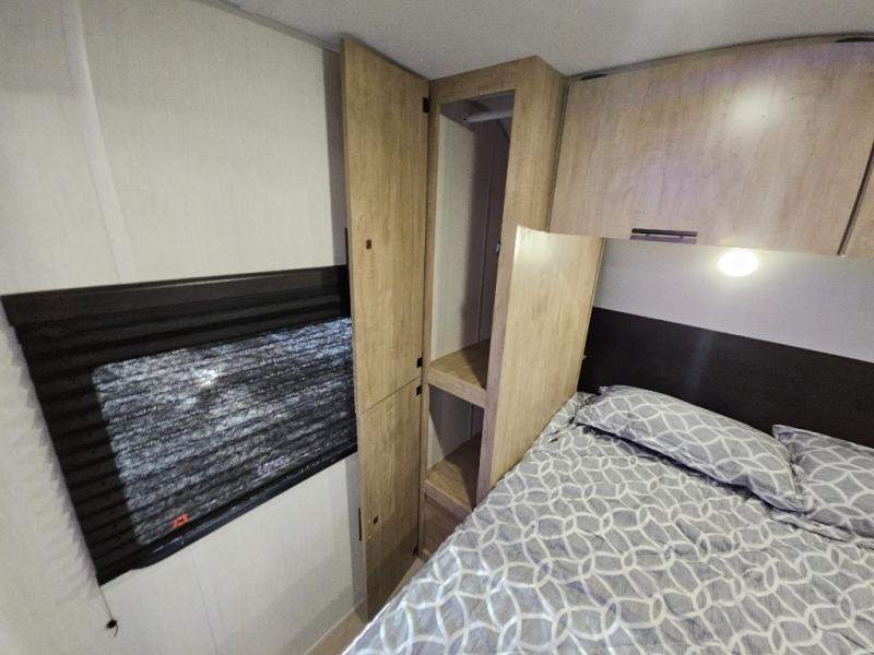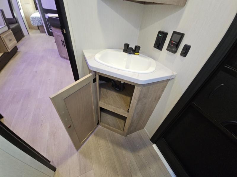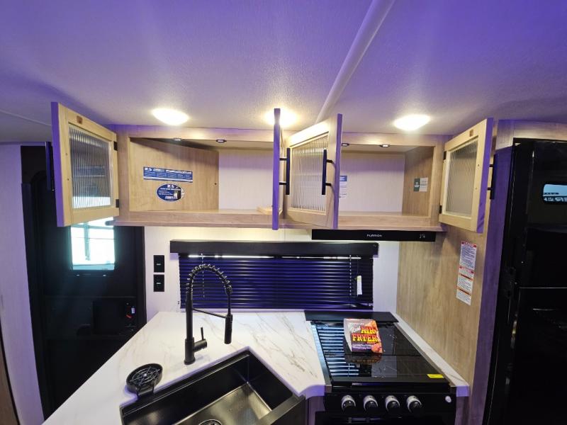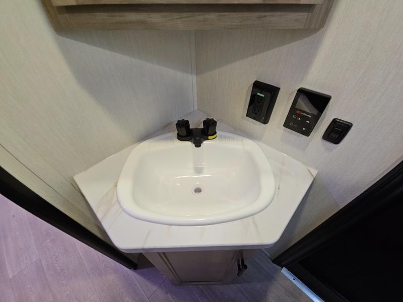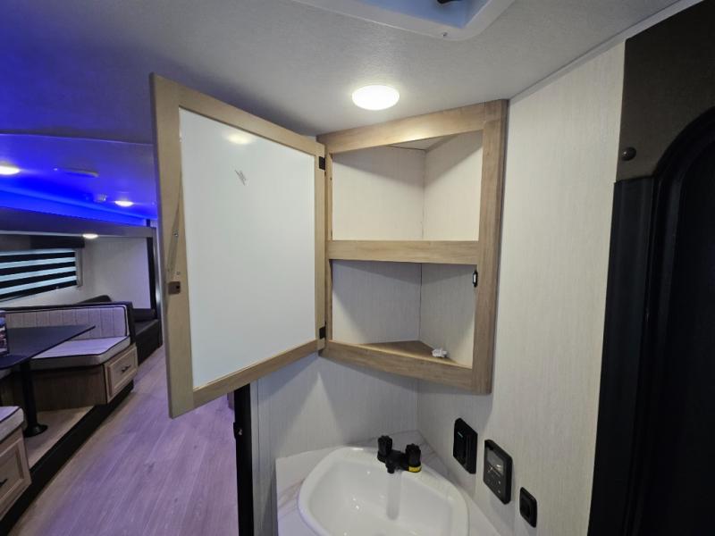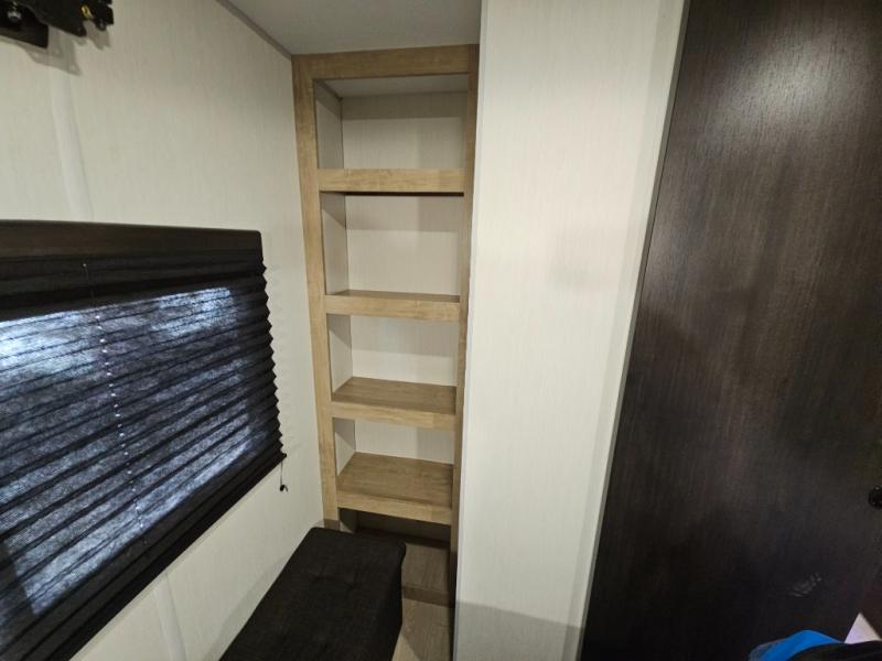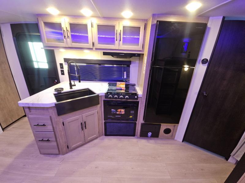 If you've been searching for a travel trailer with a larger sleeping capacity to camp with friends, this is the one! There are double-size bunks in the rear corner, and the full bath with its own exterior entry door is in the other rear corner for easy nighttime use. Up front, an RV king bed in the private bedroom is sure to bring a great night's rest, and you'll find a bedside wardrobe to keep your clothes picked up off of the floor. In the morning, everyone can meet in the main living room that includes a large slide out, U-shaped dinette, sofa, and a fireplace with a hidden pantry behind it for smart storage solutions. An outside kitchen will allow you to get some fresh air as you make dinner, but there's also a full interior kitchen if the weather isn't cooperating. Additional outdoor features include a rear storage rack, an outside TV mount, and a 15' awning for some shade!