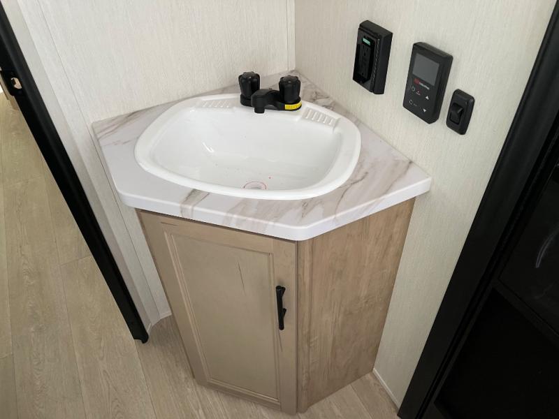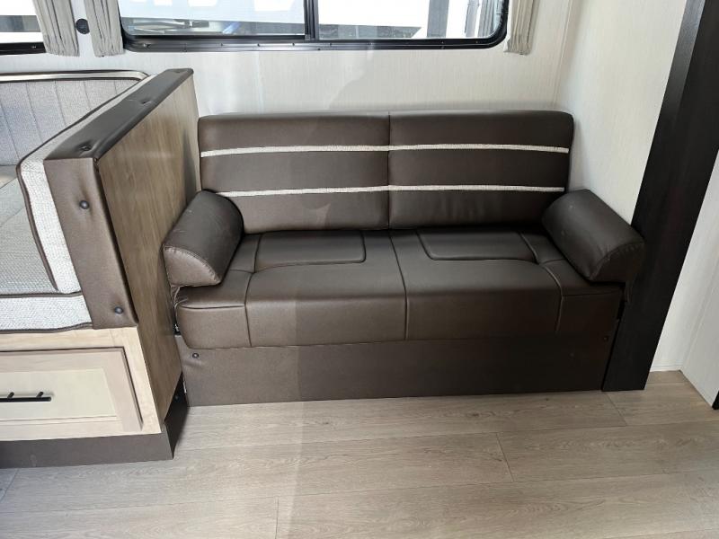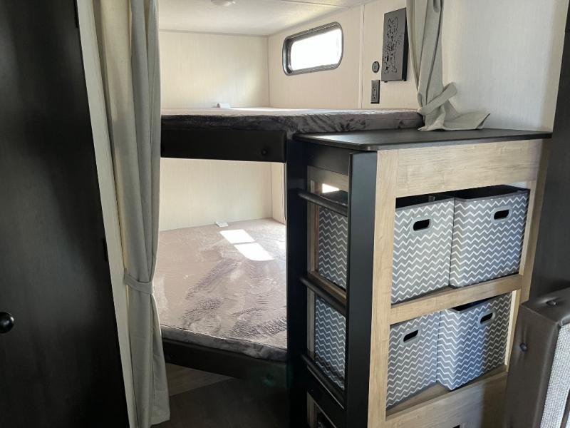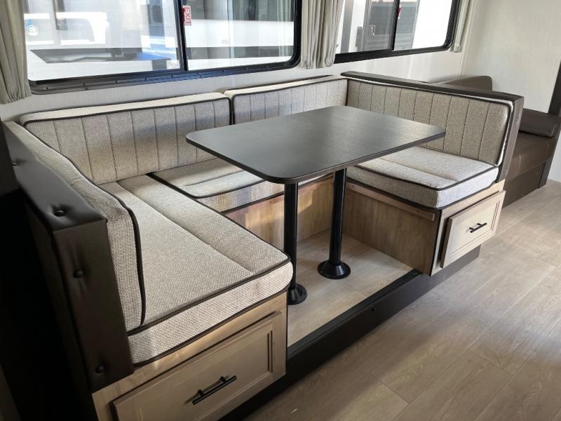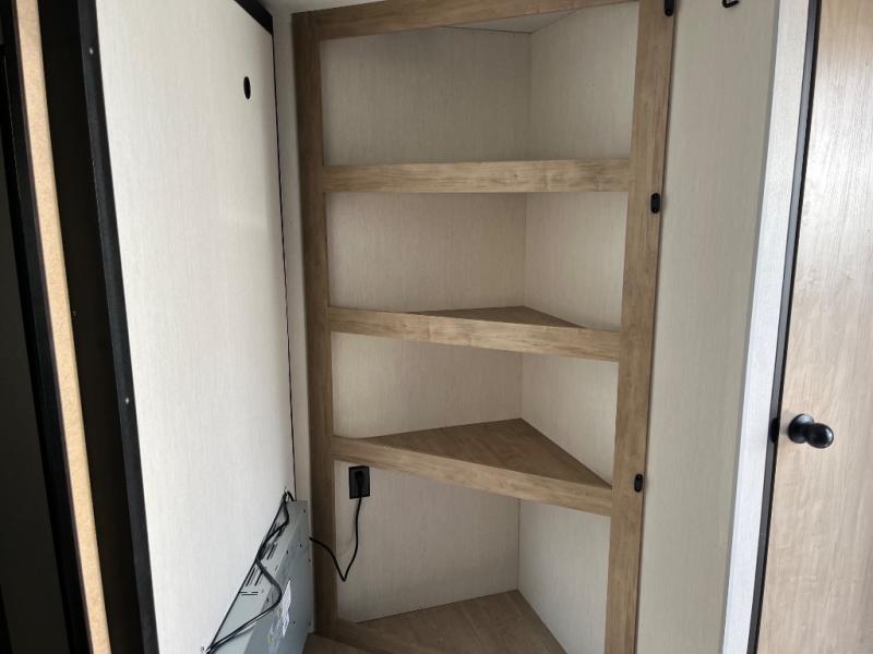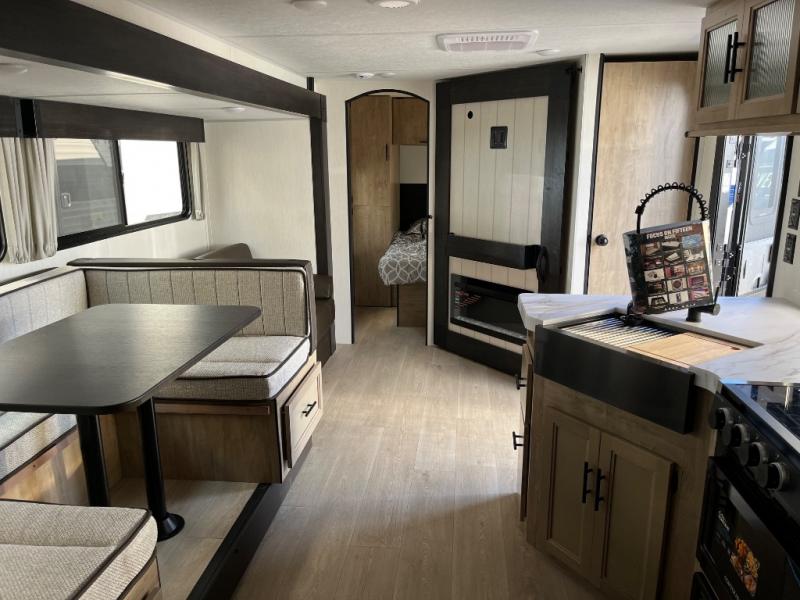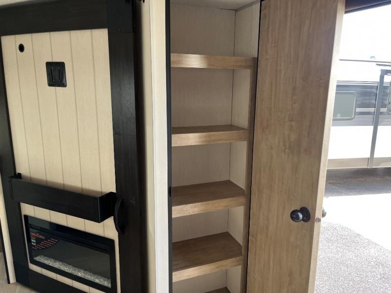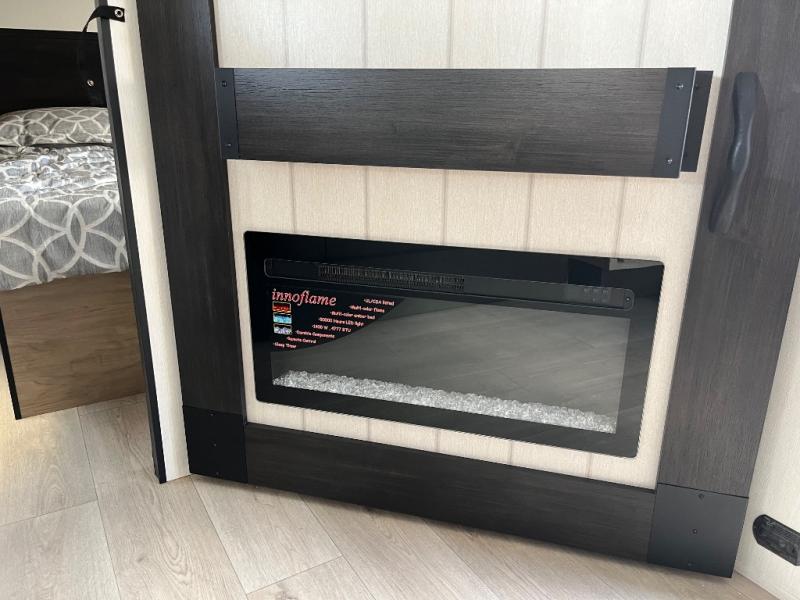 If you've been searching for a travel trailer with a larger sleeping capacity to camp with friends, this is the one! There are double-size bunks in the rear corner, and the full bath with its own exterior entry door is in the other rear corner for easy nighttime use. Up front, an RV king bed in the private bedroom is sure to bring a great night's rest, and you'll find a bedside wardrobe to keep your clothes picked up off of the floor. In the morning, everyone can meet in the main living room that includes a large slide out, U-shaped dinette, sofa, and a fireplace with a hidden pantry behind it for smart storage solutions. An outside kitchen will allow you to get some fresh air as you make dinner, but there's also a full interior kitchen if the weather isn't cooperating. Additional outdoor features include a rear storage rack, an outside TV mount, and a 15' awning for some shade!