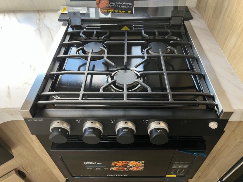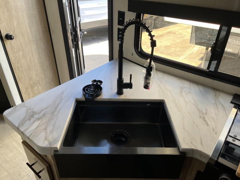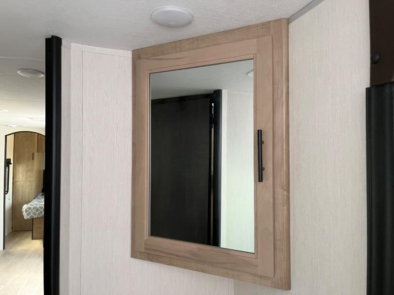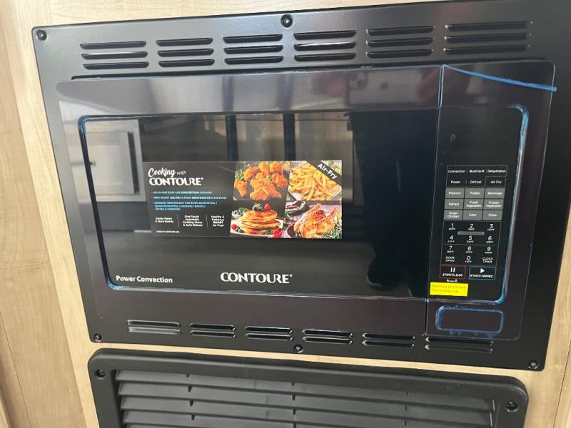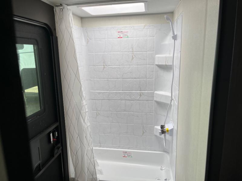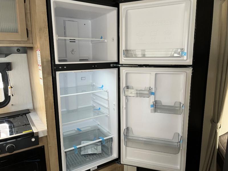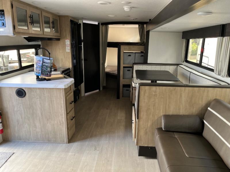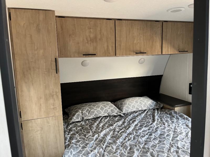 If you've been searching for a travel trailer with a larger sleeping capacity to camp with friends, this is the one! There are double-size bunks in the rear corner, and the full bath with its own exterior entry door is in the other rear corner for easy nighttime use. Up front, an RV king bed in the private bedroom is sure to bring a great night's rest, and you'll find a bedside wardrobe to keep your clothes picked up off of the floor. In the morning, everyone can meet in the main living room that includes a large slide out, U-shaped dinette, sofa, and a fireplace with a hidden pantry behind it for smart storage solutions. An outside kitchen will allow you to get some fresh air as you make dinner, but there's also a full interior kitchen if the weather isn't cooperating. Additional outdoor features include a rear storage rack, an outside TV mount, and a 15' awning for some shade!