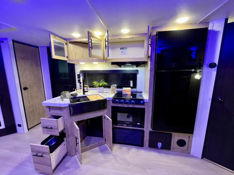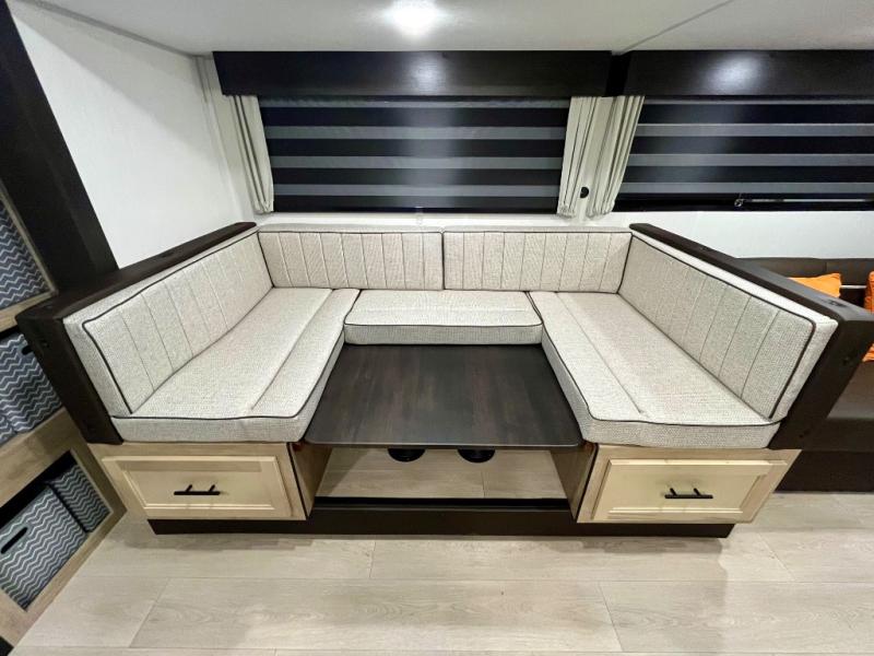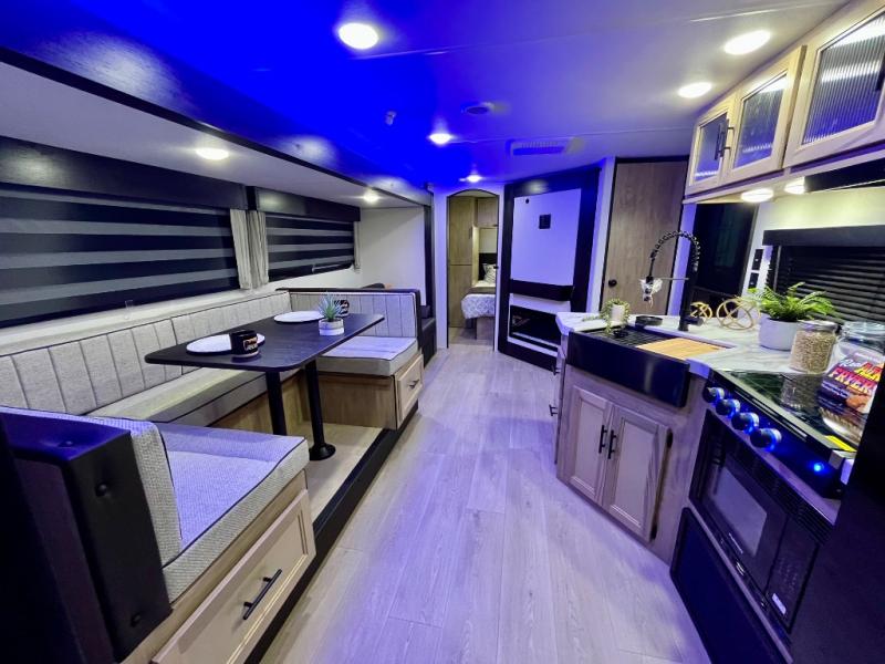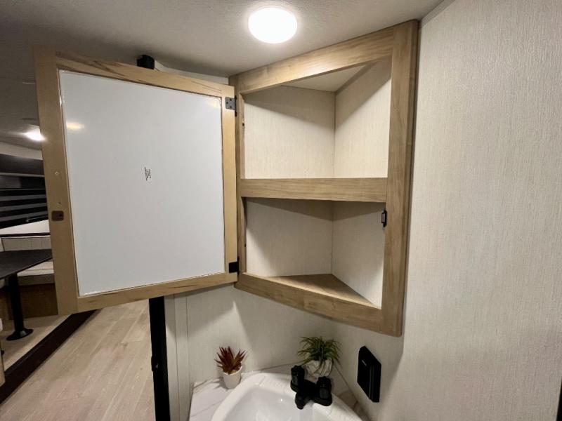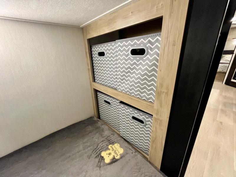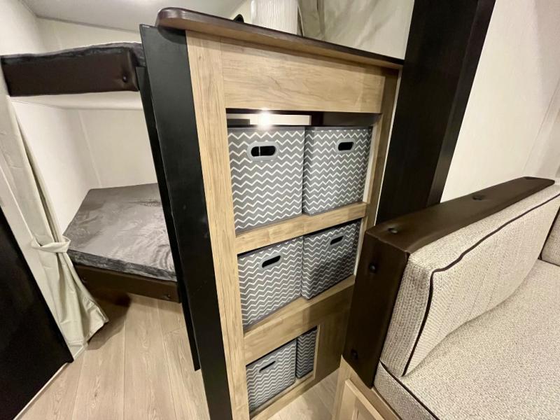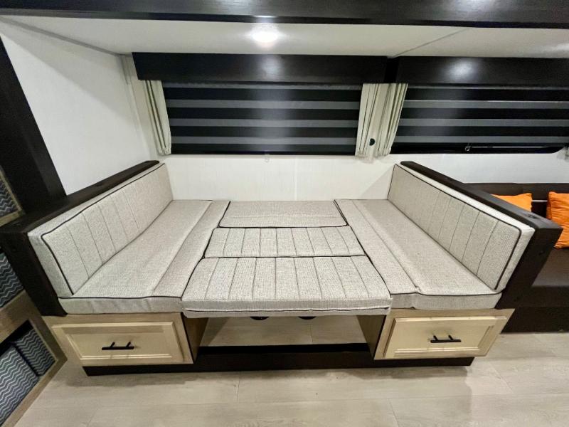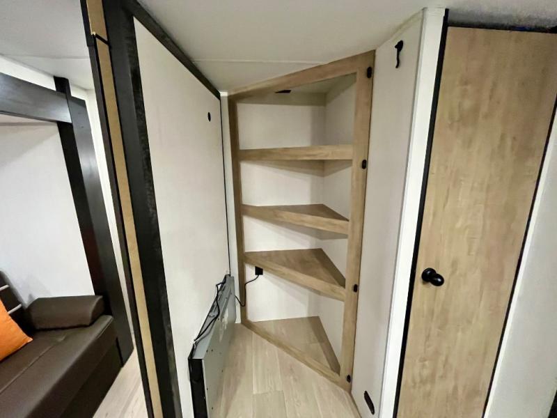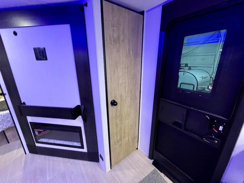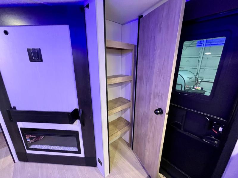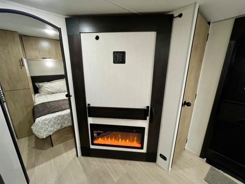 If you've been searching for a travel trailer with a larger sleeping capacity to camp with friends, this is the one! There are double-size bunks in the rear corner, and the full bath with its own exterior entry door is in the other rear corner for easy nighttime use. Up front, an RV king bed in the private bedroom is sure to bring a great night's rest, and you'll find dual bedside wardrobes to keep your clothes picked up off of the floor. In the morning, everyone can meet in the main living room that includes a large slide out, U-shaped dinette, sofa, and a fireplace with a hidden pantry behind it for smart storage solutions. There is also a TV mount here for the option to bring along your television. An outside mini kitchen will allow you to get some fresh air as you make dinner, but there's also a full interior kitchen if the weather isn't cooperating. Additional outdoor features include a rear storage rack, an outside TV mount, and a 9' power awning for some shade!