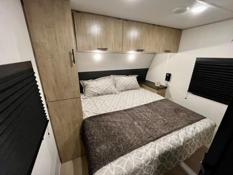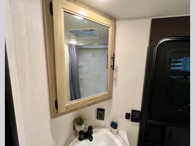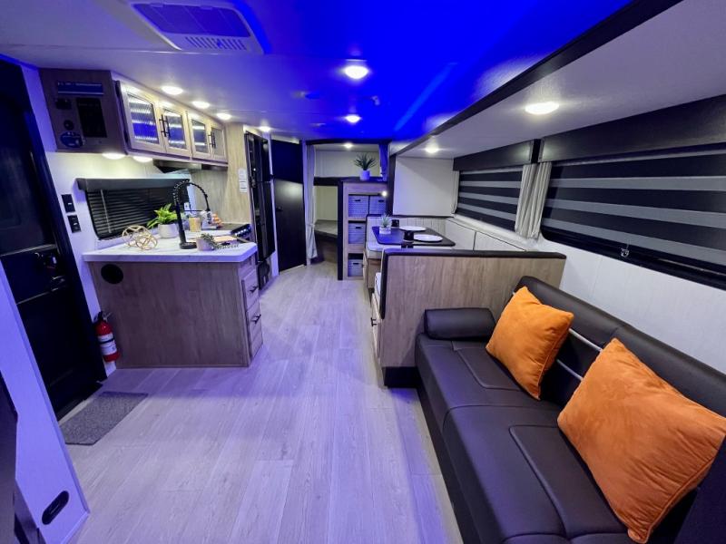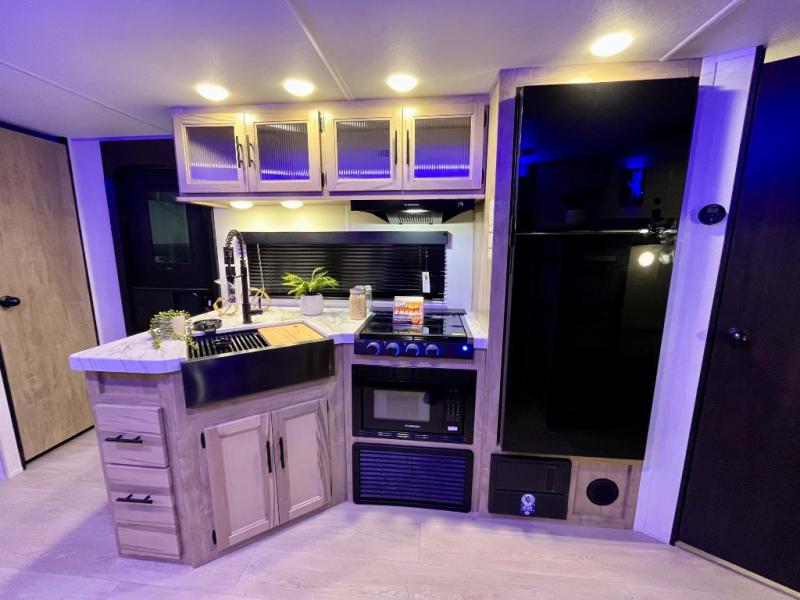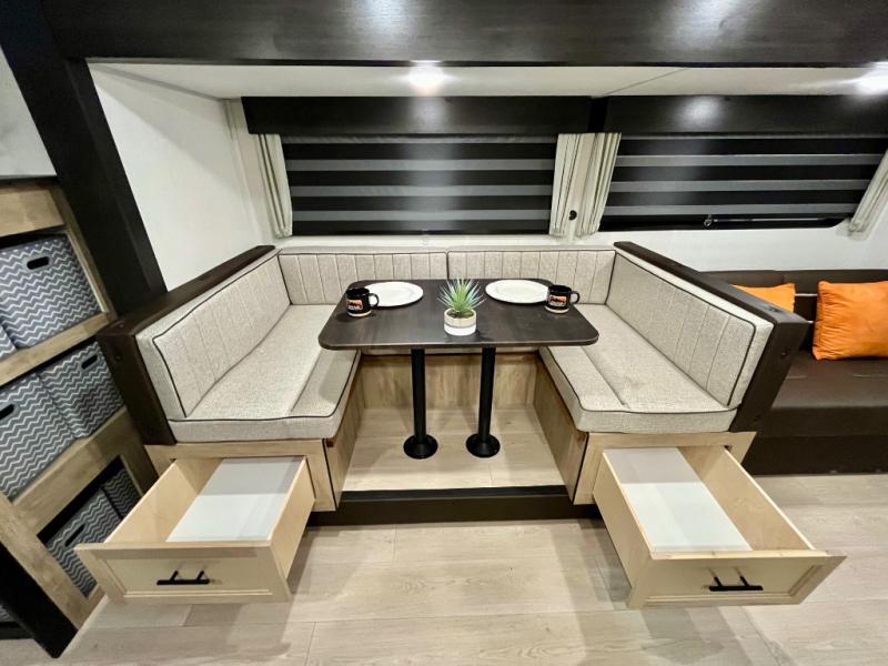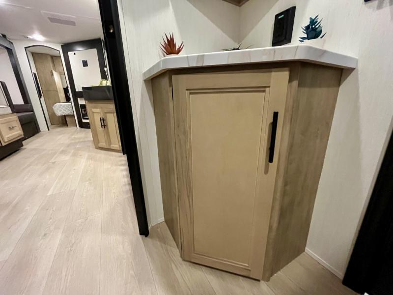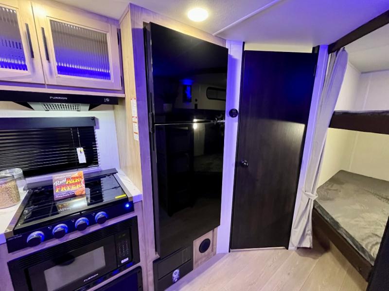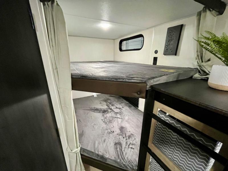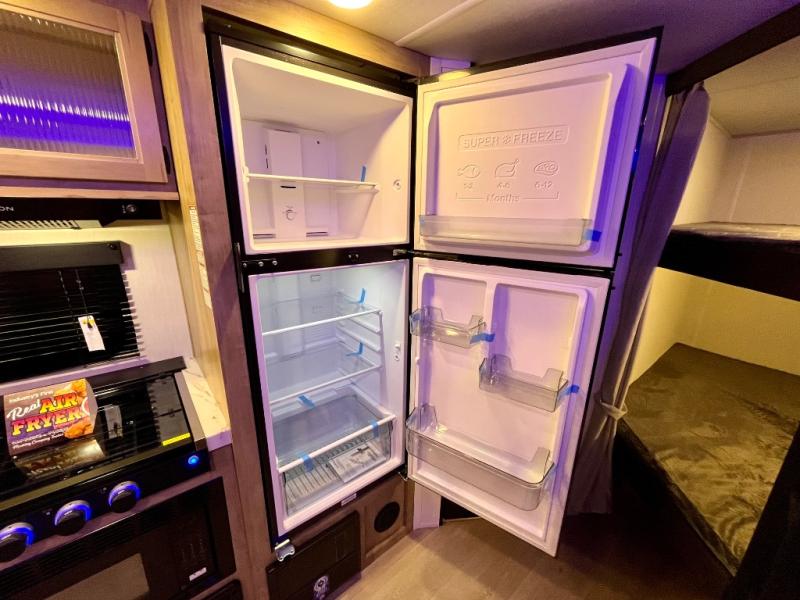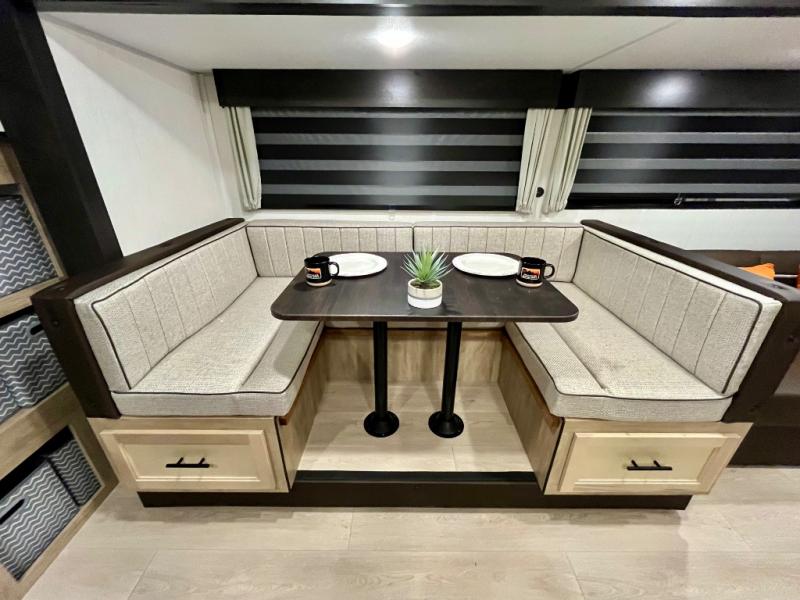 If you've been searching for a travel trailer with a larger sleeping capacity to camp with friends, this is the one! There are double-size bunks in the rear corner, and the full bath with its own exterior entry door is in the other rear corner for easy nighttime use. Up front, an RV king bed in the private bedroom is sure to bring a great night's rest, and you'll find dual bedside wardrobes to keep your clothes picked up off of the floor. In the morning, everyone can meet in the main living room that includes a large slide out, U-shaped dinette, sofa, and a fireplace with a hidden pantry behind it for smart storage solutions. There is also a TV mount here for the option to bring along your television. An outside mini kitchen will allow you to get some fresh air as you make dinner, but there's also a full interior kitchen if the weather isn't cooperating. Additional outdoor features include a rear storage rack, an outside TV mount, and a 9' power awning for some shade!
