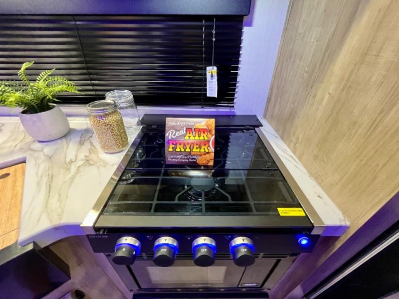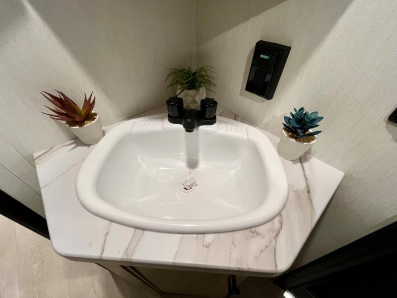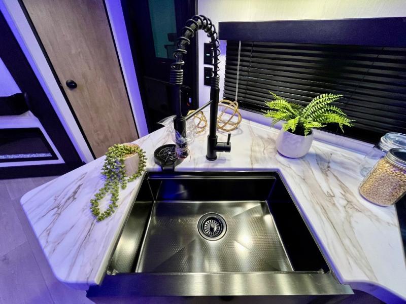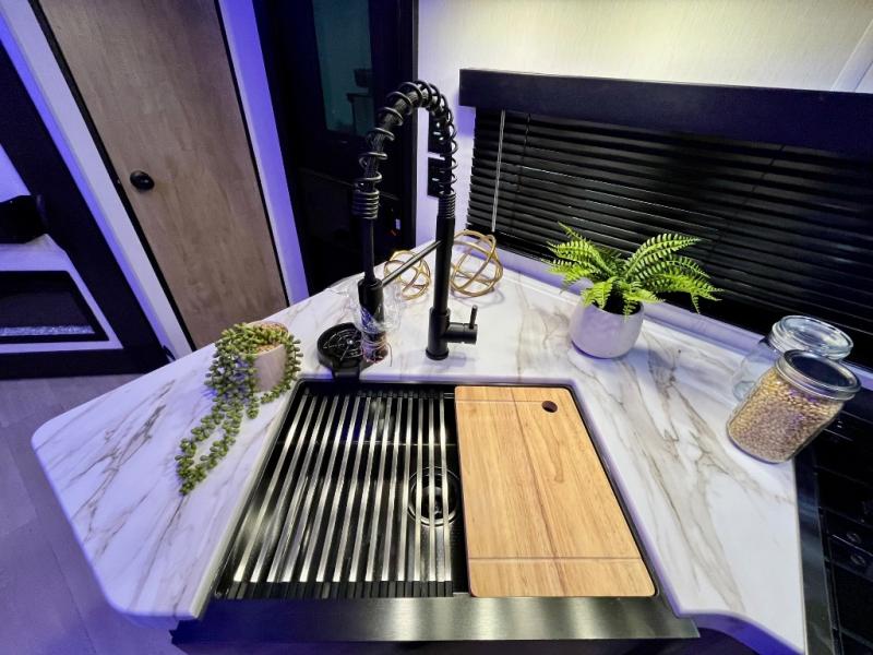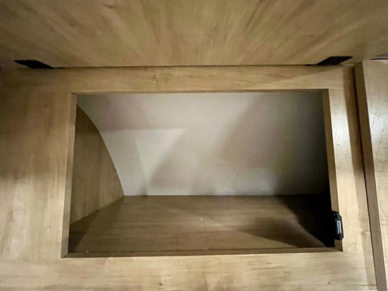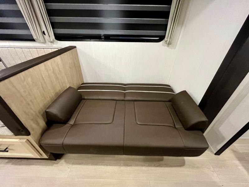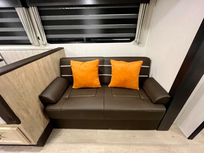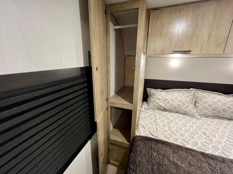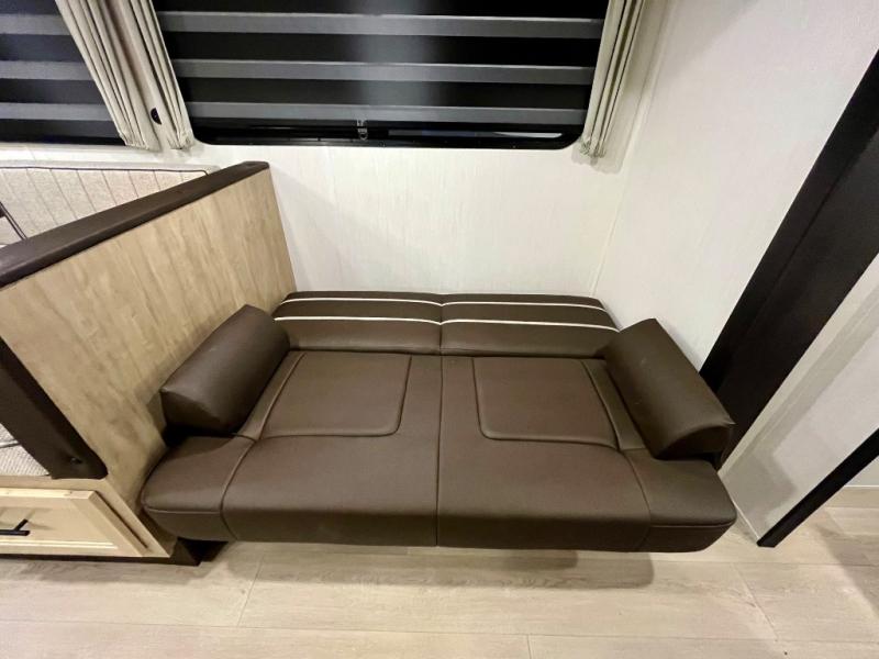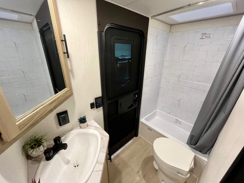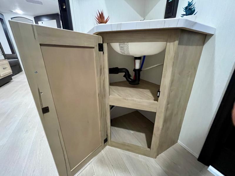 If you've been searching for a travel trailer with a larger sleeping capacity to camp with friends, this is the one! There are double-size bunks in the rear corner, and the full bath with its own exterior entry door is in the other rear corner for easy nighttime use. Up front, an RV king bed in the private bedroom is sure to bring a great night's rest, and you'll find dual bedside wardrobes to keep your clothes picked up off of the floor. In the morning, everyone can meet in the main living room that includes a large slide out, U-shaped dinette, sofa, and a fireplace with a hidden pantry behind it for smart storage solutions. There is also a TV mount here for the option to bring along your television. An outside mini kitchen will allow you to get some fresh air as you make dinner, but there's also a full interior kitchen if the weather isn't cooperating. Additional outdoor features include a rear storage rack, an outside TV mount, and a 9' power awning for some shade!