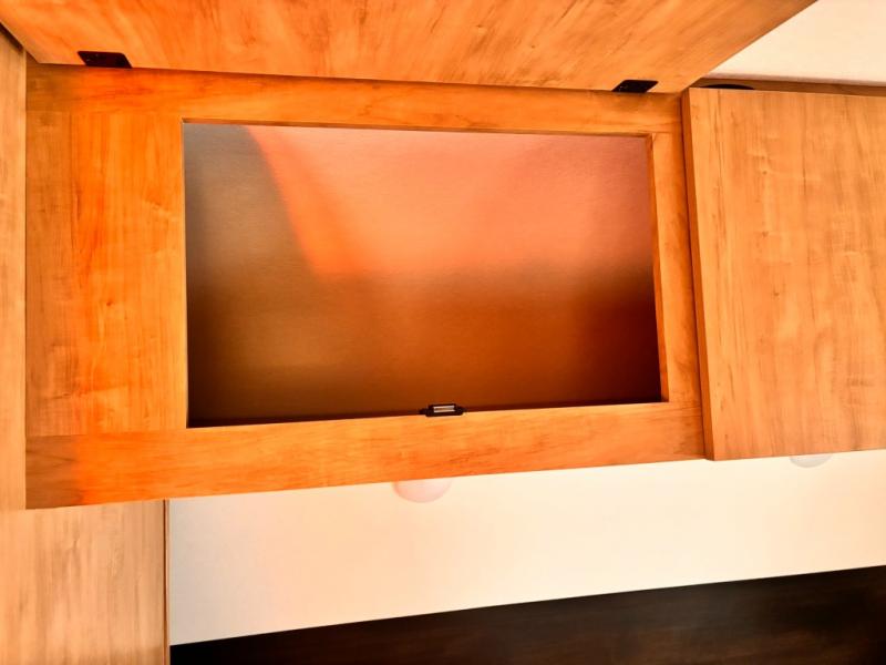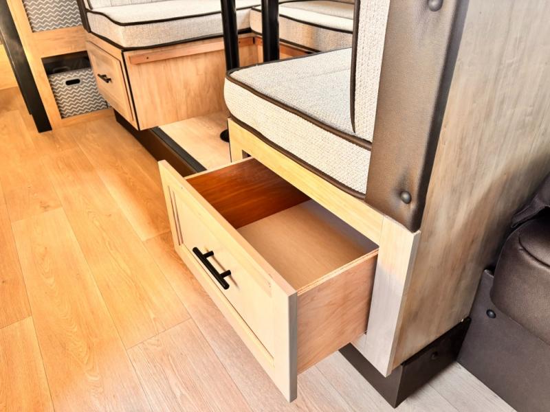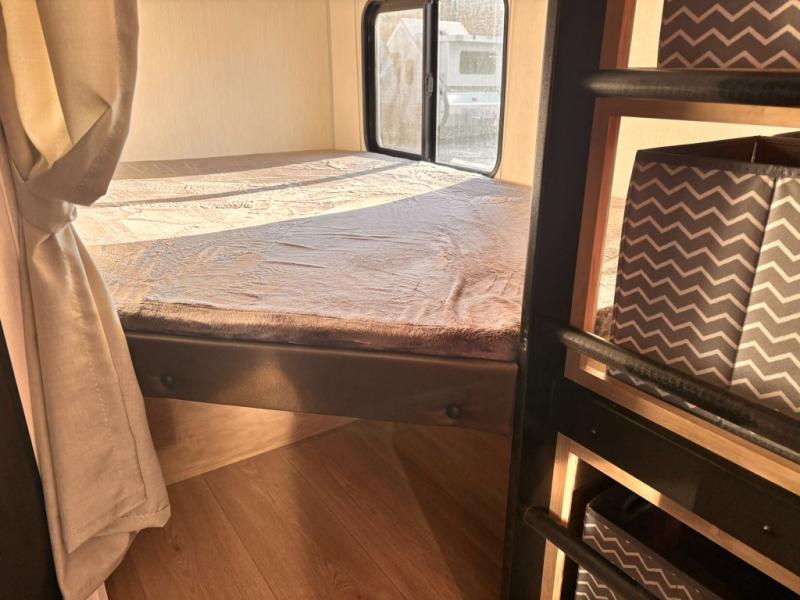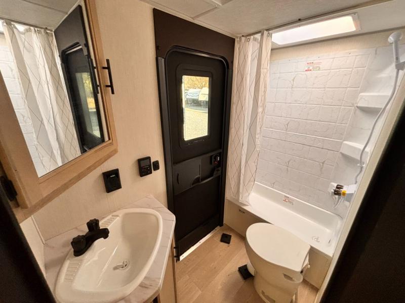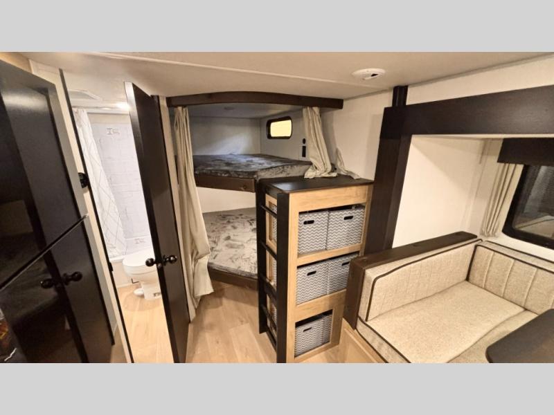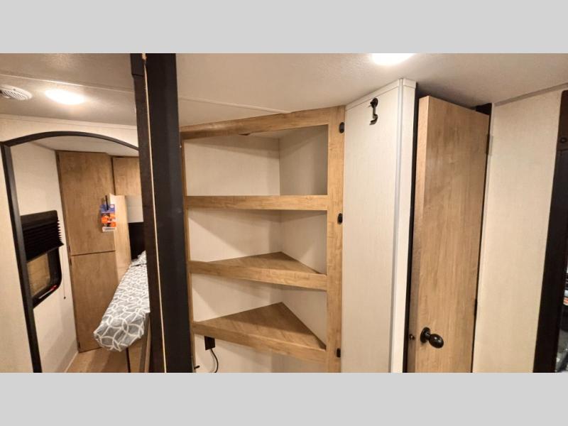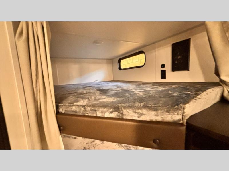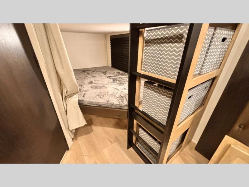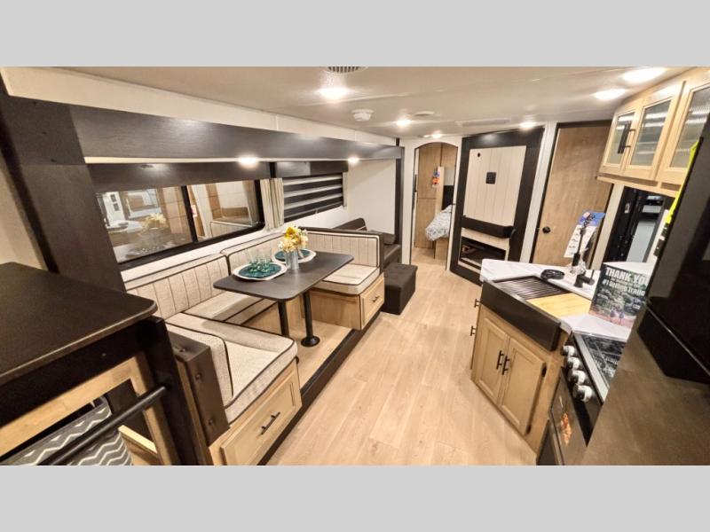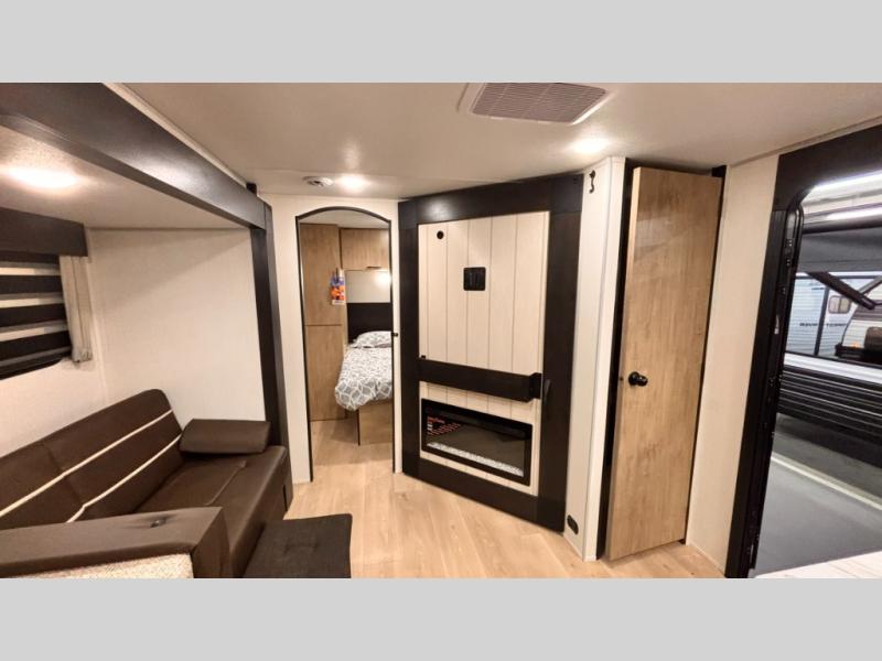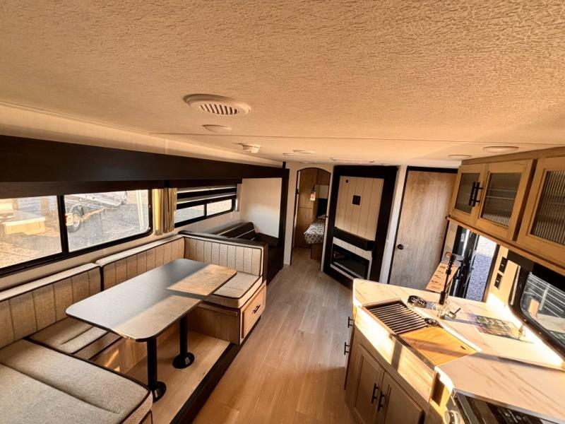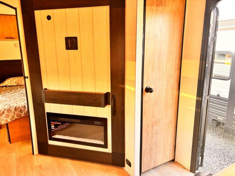 If you've been searching for a travel trailer with a larger sleeping capacity to camp with friends, this is the one! There are double-size bunks in the rear corner, and the full bath with its own exterior entry door is in the other rear corner for easy nighttime use. Up front, an RV king bed in the private bedroom is sure to bring a great night's rest, and you'll find a bedside wardrobe to keep your clothes picked up off of the floor. In the morning, everyone can meet in the main living room that includes a large slide out, U-shaped dinette, sofa, and a fireplace with a hidden pantry behind it for smart storage solutions. An outside kitchen will allow you to get some fresh air as you make dinner, but there's also a full interior kitchen if the weather isn't cooperating. Additional outdoor features include a rear storage rack, an outside TV mount, and a 15' awning for some shade!