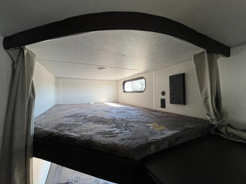If you've been searching for a travel trailer with a larger sleeping capacity to camp with friends, this is the one! There are double-size bunks in the rear corner, and the full bath with its own exterior entry door is in the other rear corner for easy nighttime use. Up front, an RV king bed in the private bedroom is sure to bring a great night's rest, and you'll find a bedside wardrobe to keep your clothes picked up off of the floor. In the morning, everyone can meet in the main living room that includes a large slide out, U-shaped dinette, sofa, and a fireplace with a hidden pantry behind it for smart storage solutions. An outside kitchen will allow you to get some fresh air as you make dinner, but there's also a full interior kitchen if the weather isn't cooperating. Additional outdoor features include a rear storage rack, an outside TV mount, and a 15' awning for some shade!