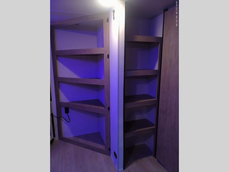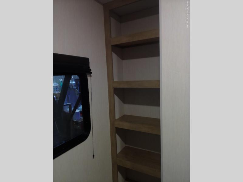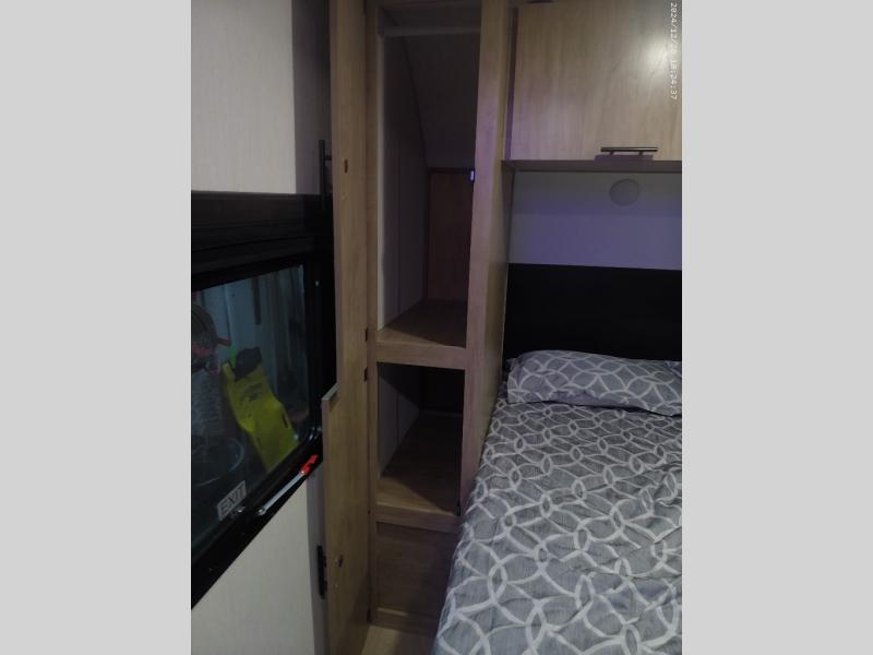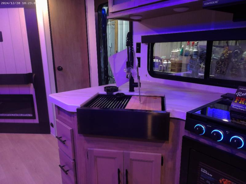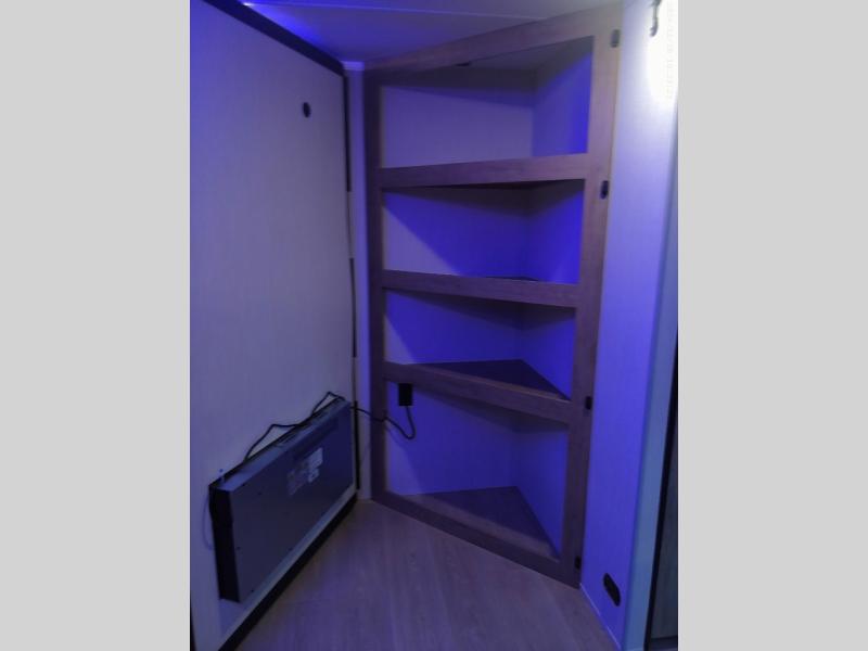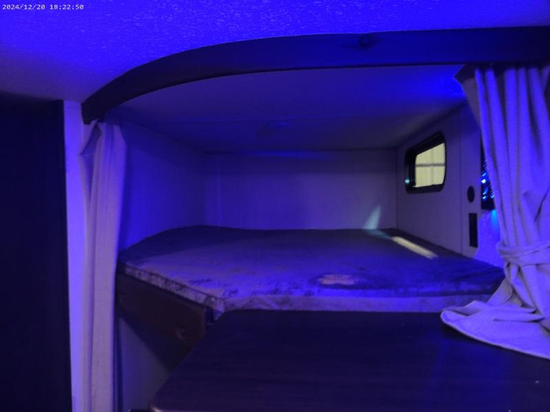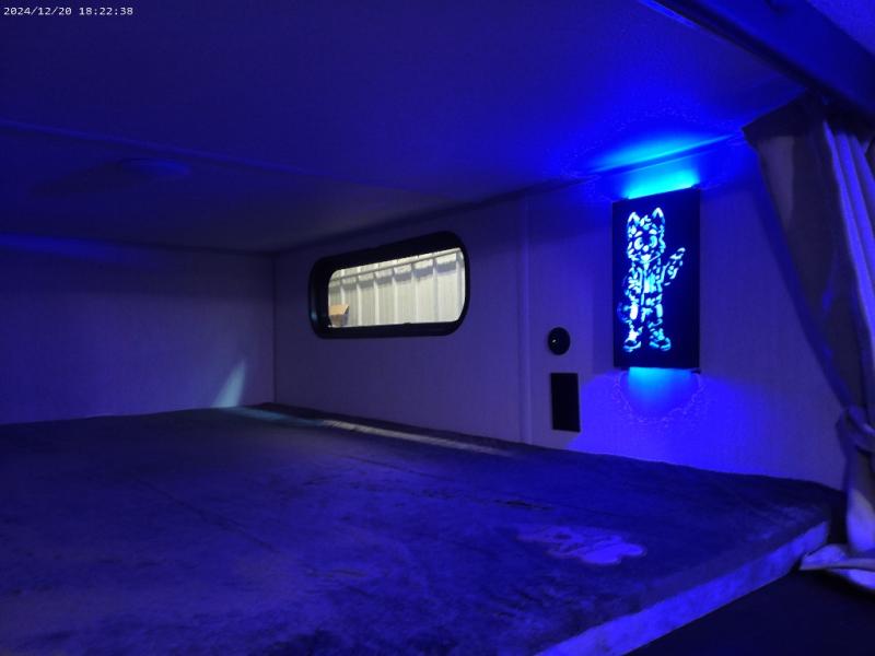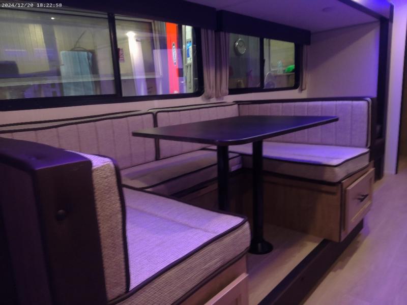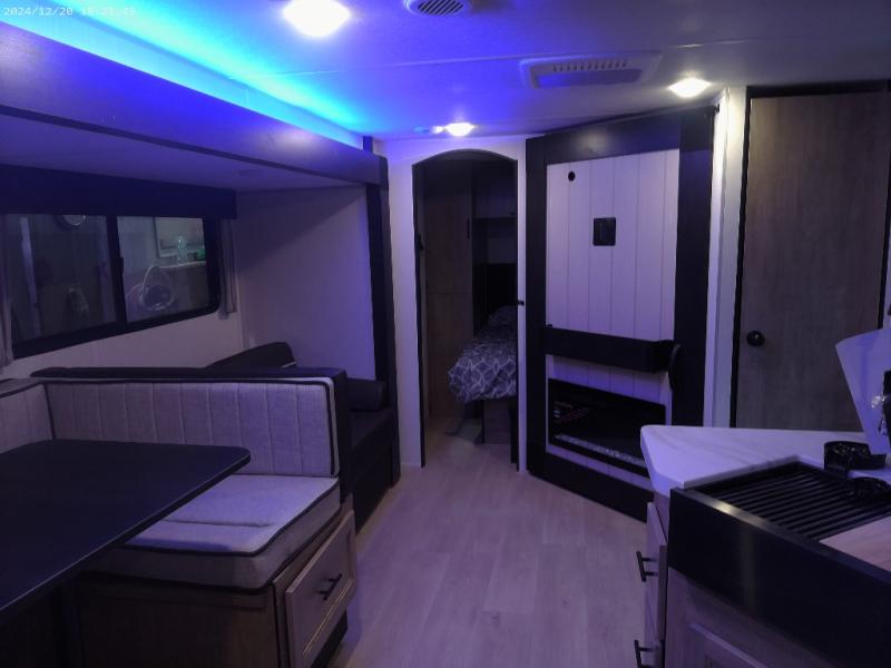 If you've been searching for a travel trailer with a larger sleeping capacity to camp with friends, this is the one! There are double-size bunks in the rear corner, and the full bath with its own exterior entry door is in the other rear corner for easy nighttime use. Up front, an RV king bed in the private bedroom is sure to bring a great night's rest, and you'll find a bedside wardrobe to keep your clothes picked up off of the floor. In the morning, everyone can meet in the main living room that includes a large slide out, U-shaped dinette, sofa, and a fireplace with a hidden pantry behind it for smart storage solutions. An outside kitchen will allow you to get some fresh air as you make dinner, but there's also a full interior kitchen if the weather isn't cooperating. Additional outdoor features include a rear storage rack, an outside TV mount, and a 15' awning for some shade!