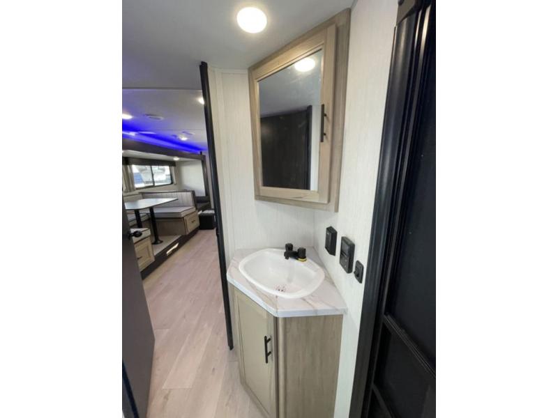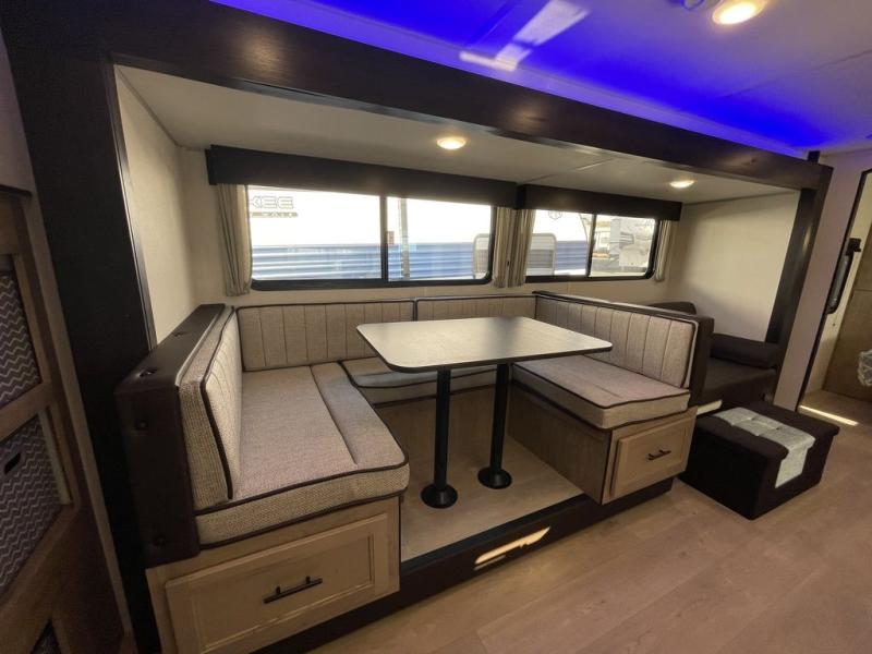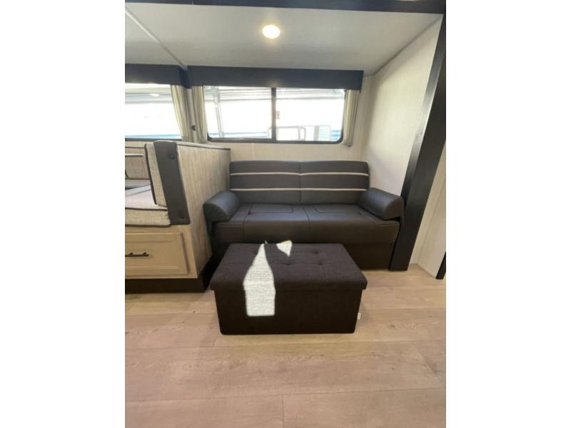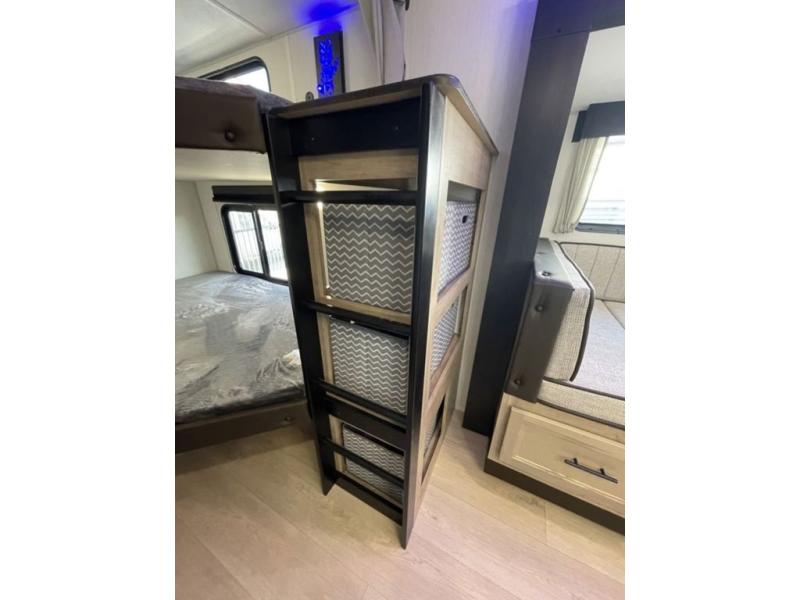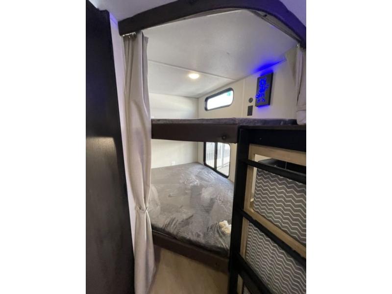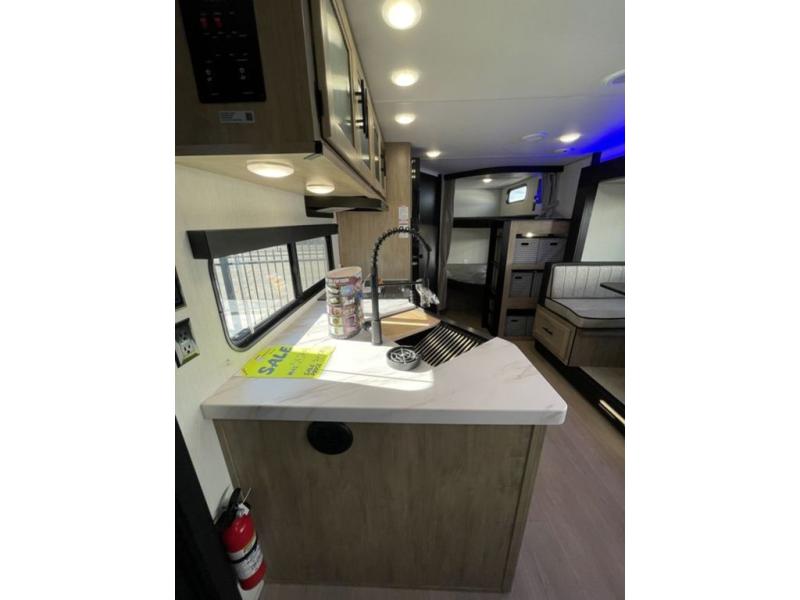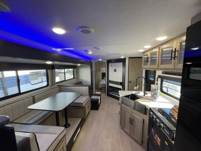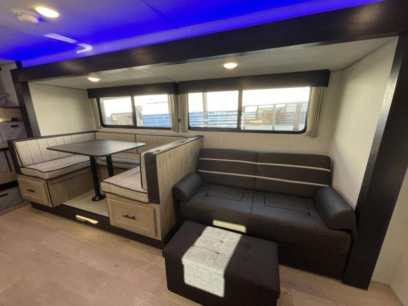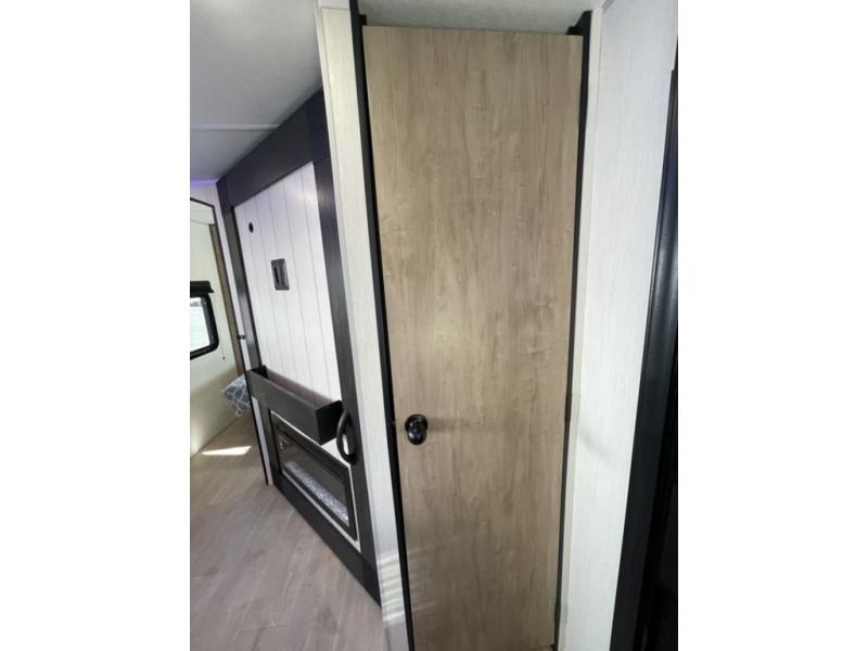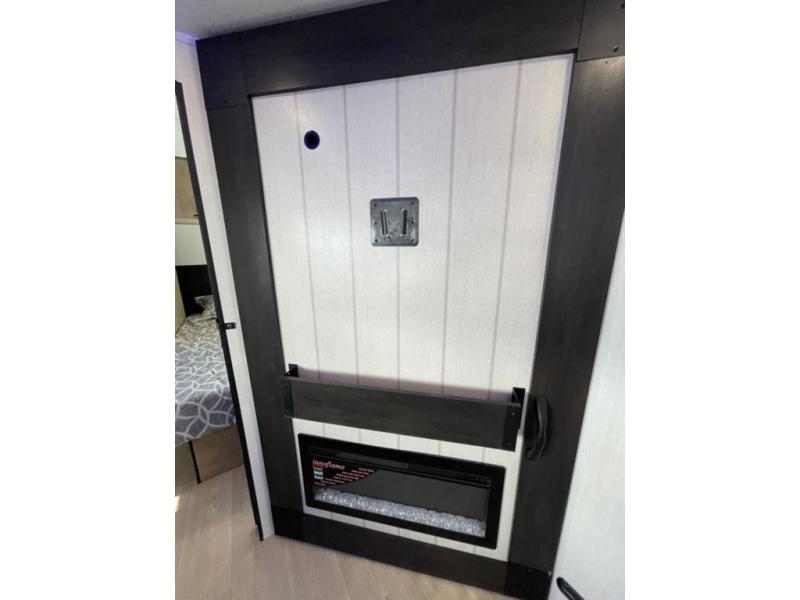 If you've been searching for a travel trailer with a larger sleeping capacity to camp with friends, this is the one! There are double-size bunks in the rear corner, and the full bath with its own exterior entry door is in the other rear corner for easy nighttime use. Up front, an RV king bed in the private bedroom is sure to bring a great night's rest, and you'll find a bedside wardrobe to keep your clothes picked up off of the floor. In the morning, everyone can meet in the main living room that includes a large slide out, U-shaped dinette, sofa, and a fireplace with a hidden pantry behind it for smart storage solutions. An outside kitchen will allow you to get some fresh air as you make dinner, but there's also a full interior kitchen if the weather isn't cooperating. Additional outdoor features include a rear storage rack, an outside TV mount, and a 15' awning for some shade!