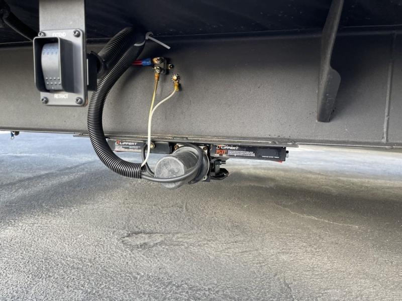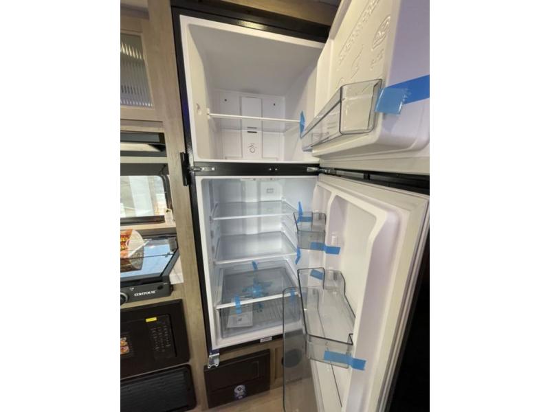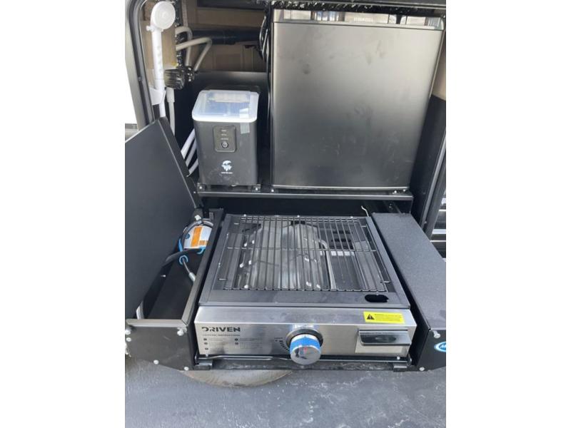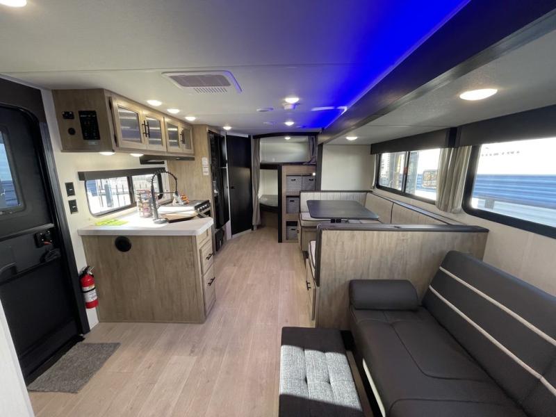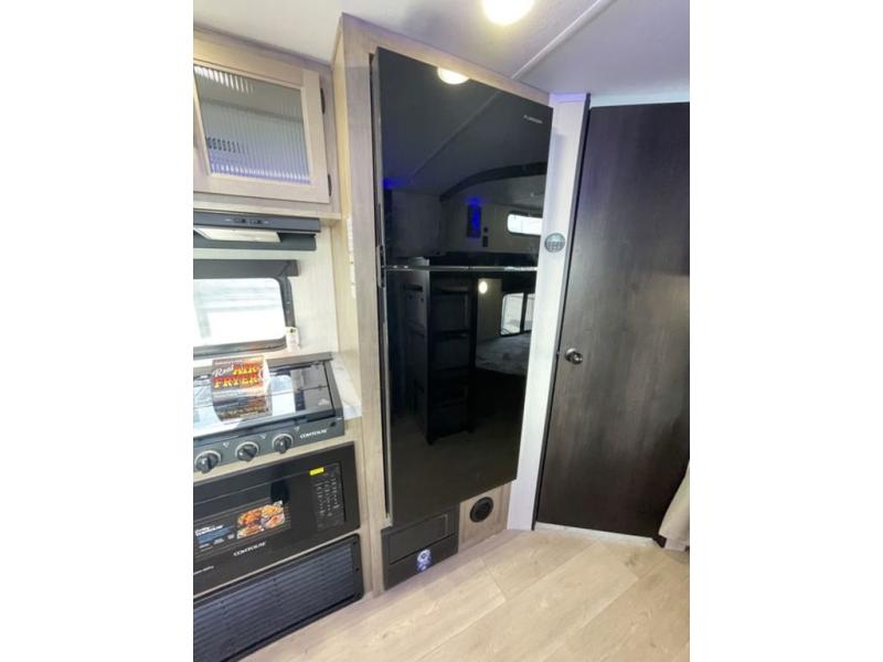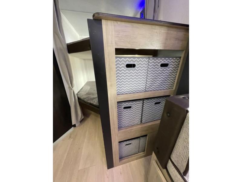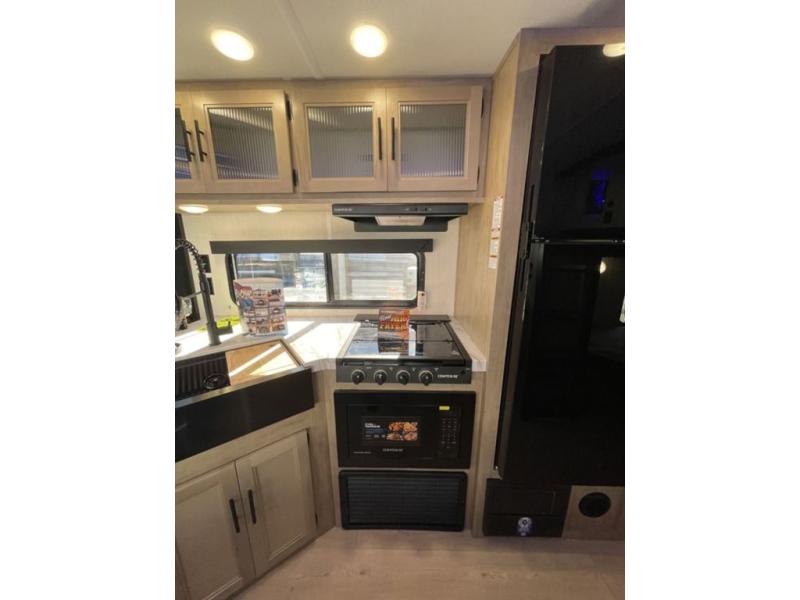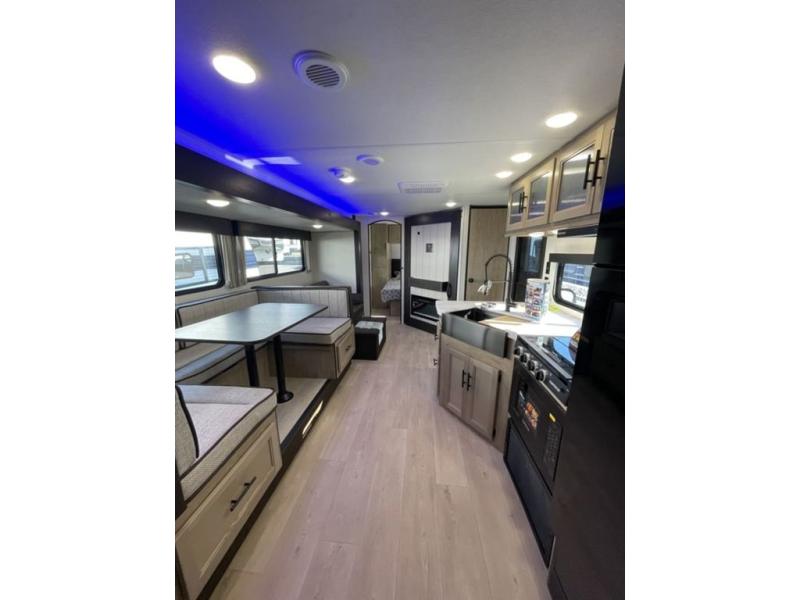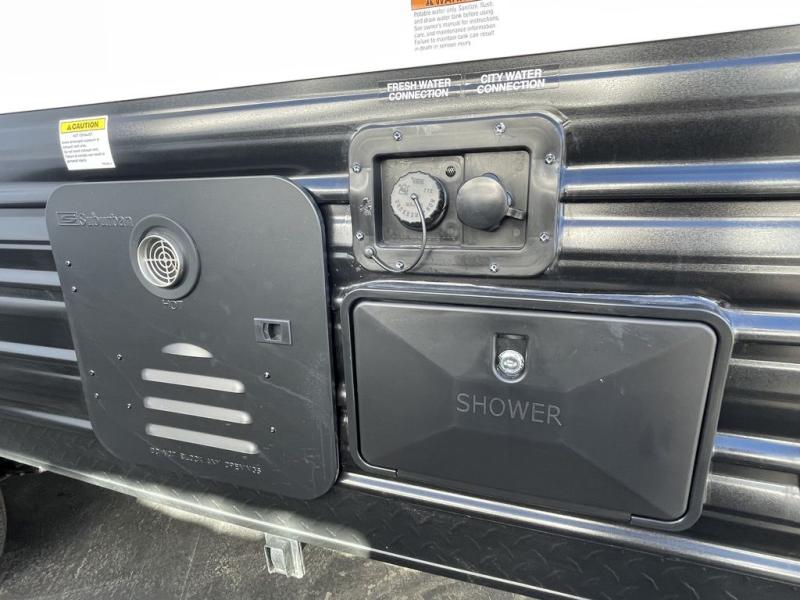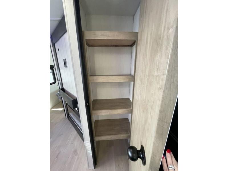 If you've been searching for a travel trailer with a larger sleeping capacity to camp with friends, this is the one! There are double-size bunks in the rear corner, and the full bath with its own exterior entry door is in the other rear corner for easy nighttime use. Up front, an RV king bed in the private bedroom is sure to bring a great night's rest, and you'll find a bedside wardrobe to keep your clothes picked up off of the floor. In the morning, everyone can meet in the main living room that includes a large slide out, U-shaped dinette, sofa, and a fireplace with a hidden pantry behind it for smart storage solutions. An outside kitchen will allow you to get some fresh air as you make dinner, but there's also a full interior kitchen if the weather isn't cooperating. Additional outdoor features include a rear storage rack, an outside TV mount, and a 15' awning for some shade!