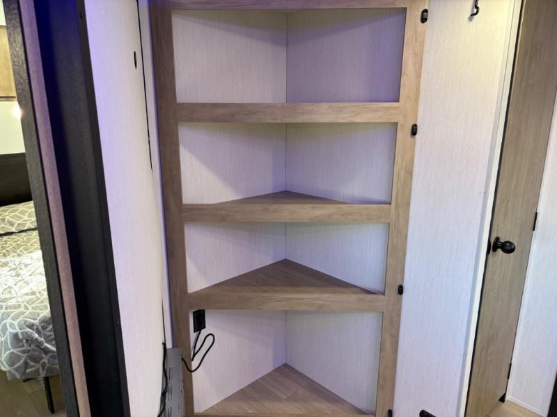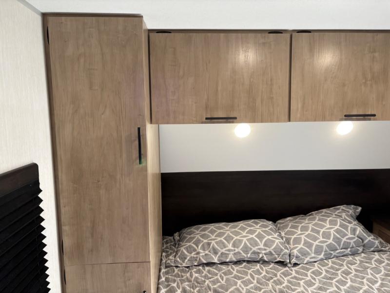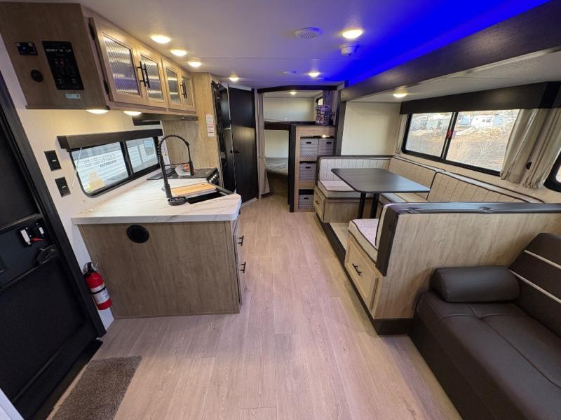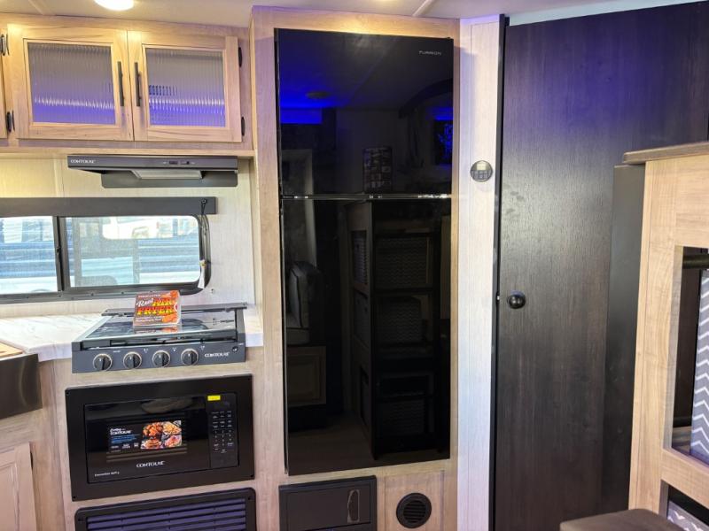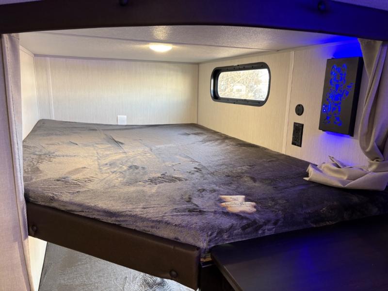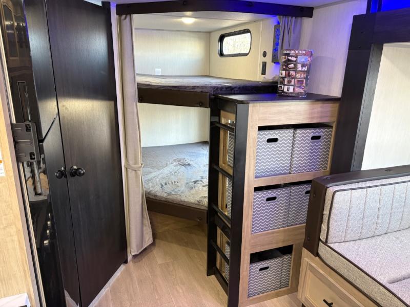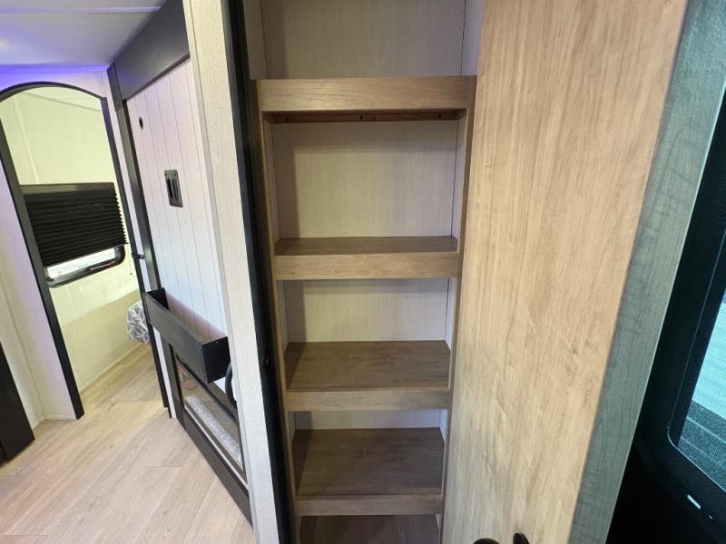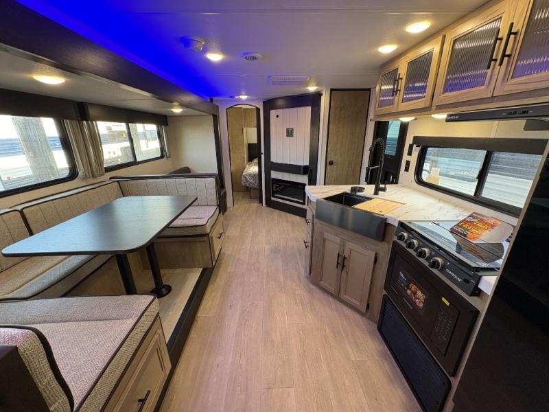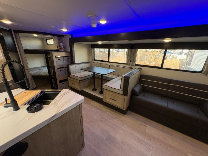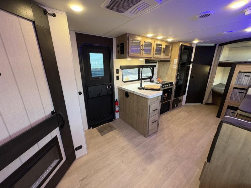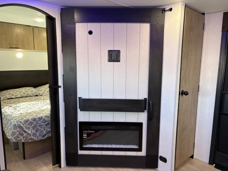If you've been searching for a travel trailer with a larger sleeping capacity to camp with friends, this is the one! There are double-size bunks in the rear corner, and the full bath with its own exterior entry door is in the other rear corner for easy nighttime use. Up front, an RV king bed in the private bedroom is sure to bring a great night's rest, and you'll find a bedside wardrobe to keep your clothes picked up off of the floor. In the morning, everyone can meet in the main living room that includes a large slide out, U-shaped dinette, sofa, and a fireplace with a hidden pantry behind it for smart storage solutions. An outside kitchen will allow you to get some fresh air as you make dinner, but there's also a full interior kitchen if the weather isn't cooperating. Additional outdoor features include a rear storage rack, an outside TV mount, and a 15' awning for some shade!