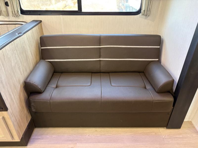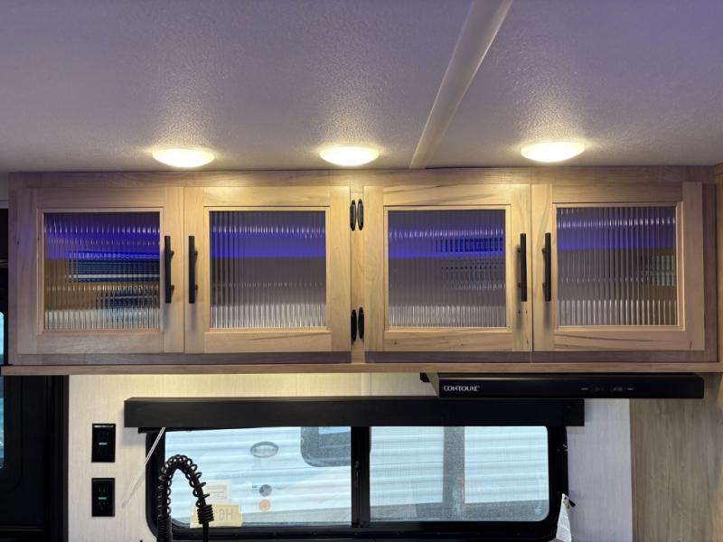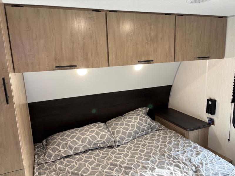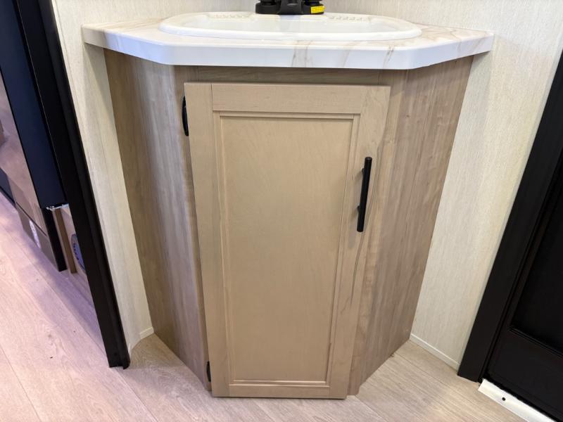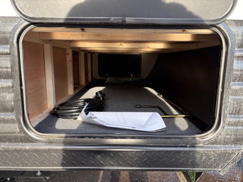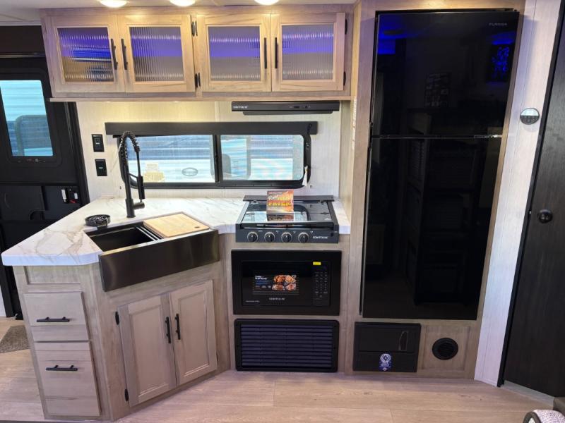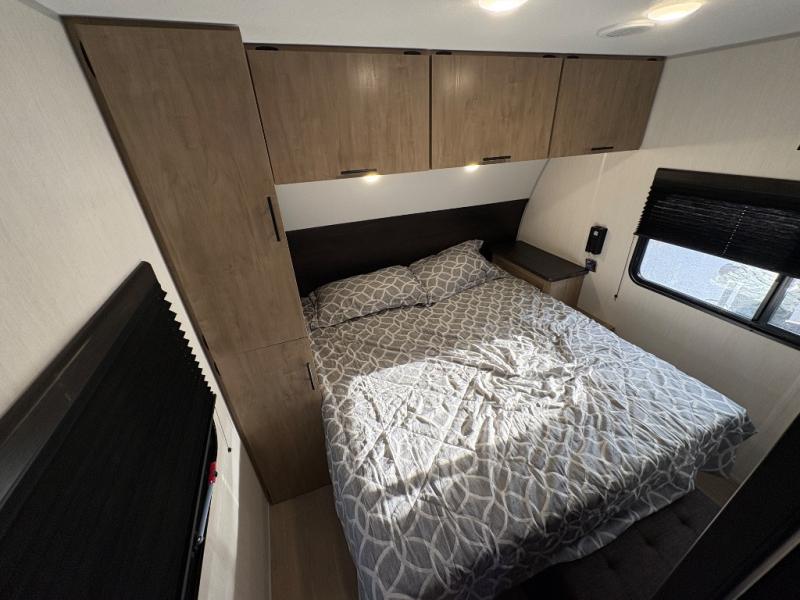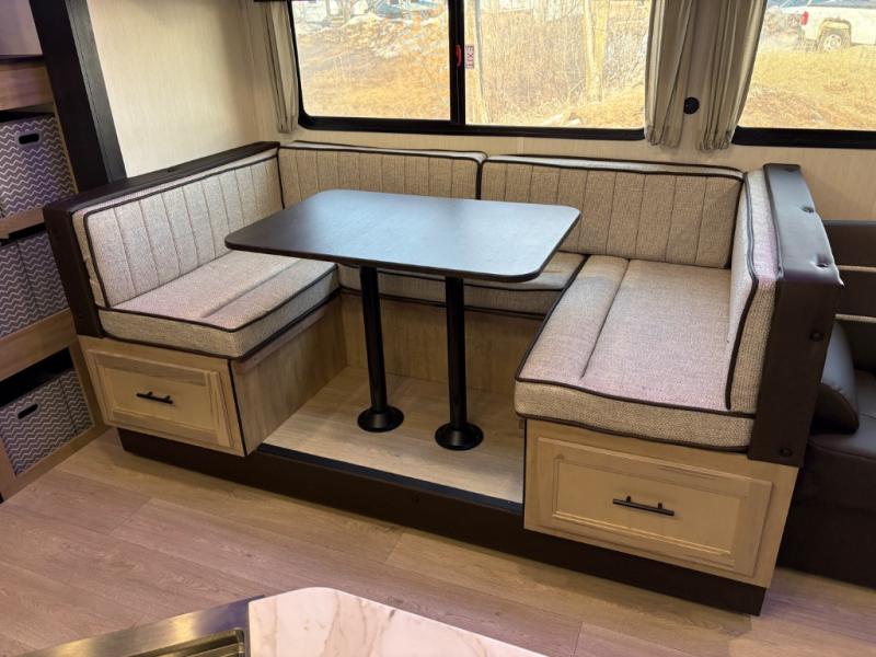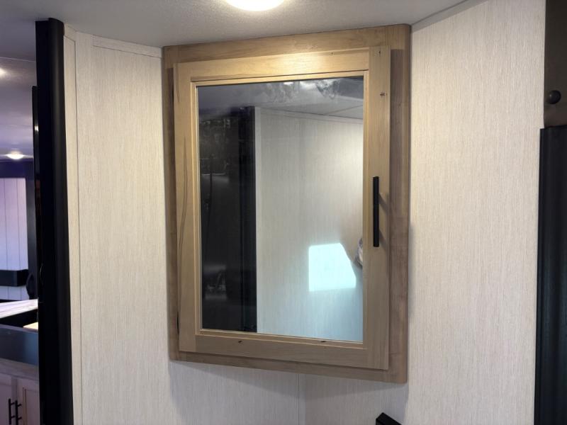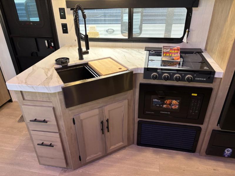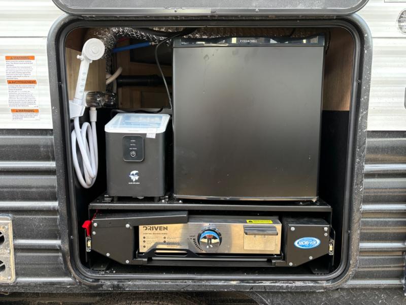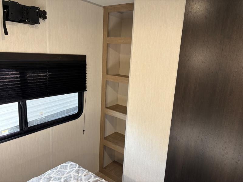 If you've been searching for a travel trailer with a larger sleeping capacity to camp with friends, this is the one! There are double-size bunks in the rear corner, and the full bath with its own exterior entry door is in the other rear corner for easy nighttime use. Up front, an RV king bed in the private bedroom is sure to bring a great night's rest, and you'll find a bedside wardrobe to keep your clothes picked up off of the floor. In the morning, everyone can meet in the main living room that includes a large slide out, U-shaped dinette, sofa, and a fireplace with a hidden pantry behind it for smart storage solutions. An outside kitchen will allow you to get some fresh air as you make dinner, but there's also a full interior kitchen if the weather isn't cooperating. Additional outdoor features include a rear storage rack, an outside TV mount, and a 15' awning for some shade!