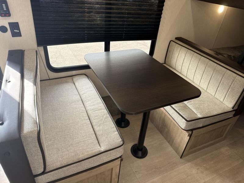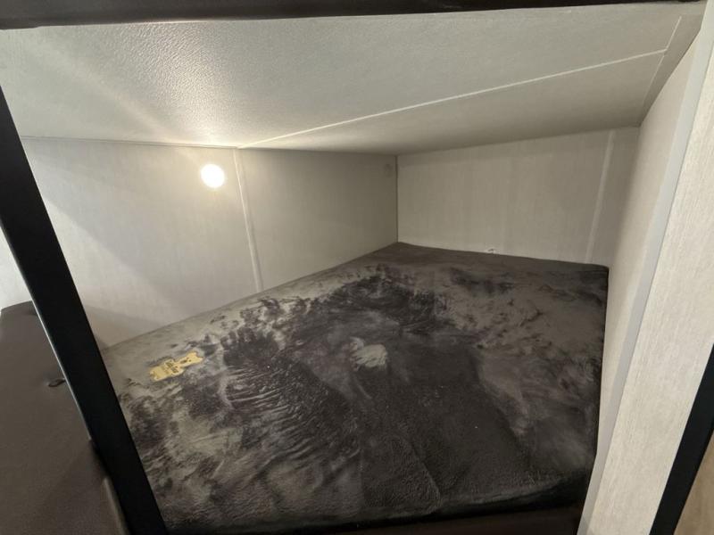 The double-size bunks in this model will allow you to camp with more friends and family! With the additional queen bed up front, plus the sofa and booth dinette, you can sleep eight! A full kitchen lets you make meals each day, and the full bath includes a tub/shower so you can clean up after hiking. This unit also includes USB ports to keep your electronics charged, and outside storage for your camp gear!