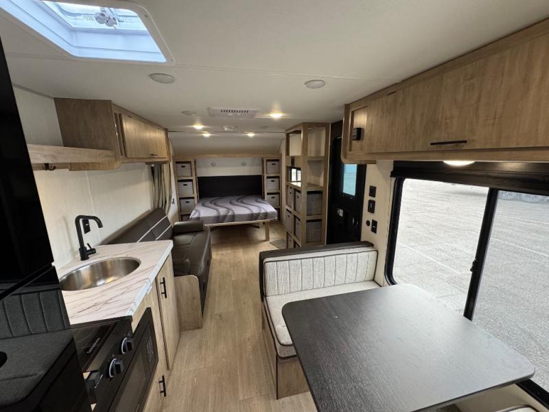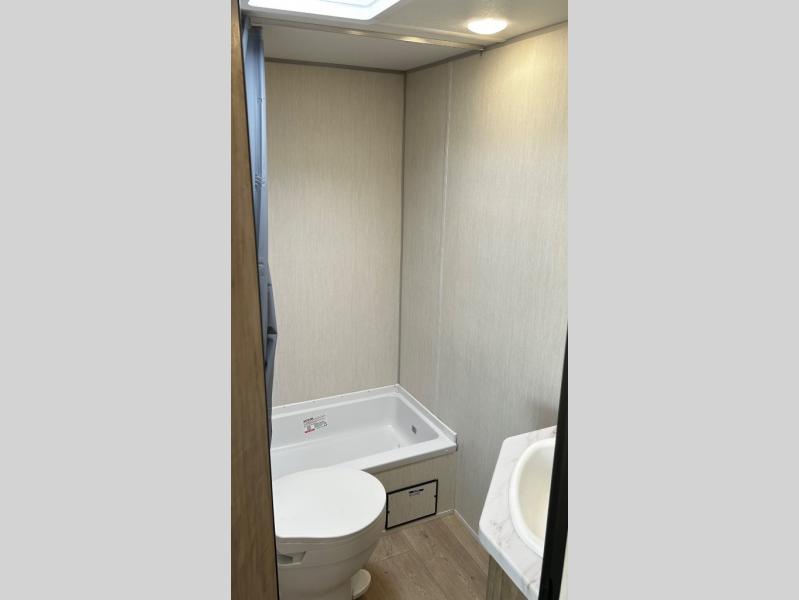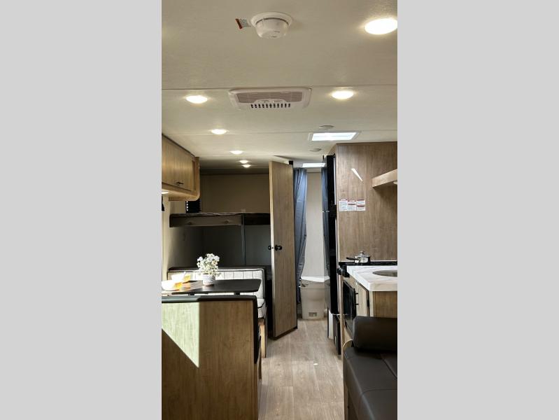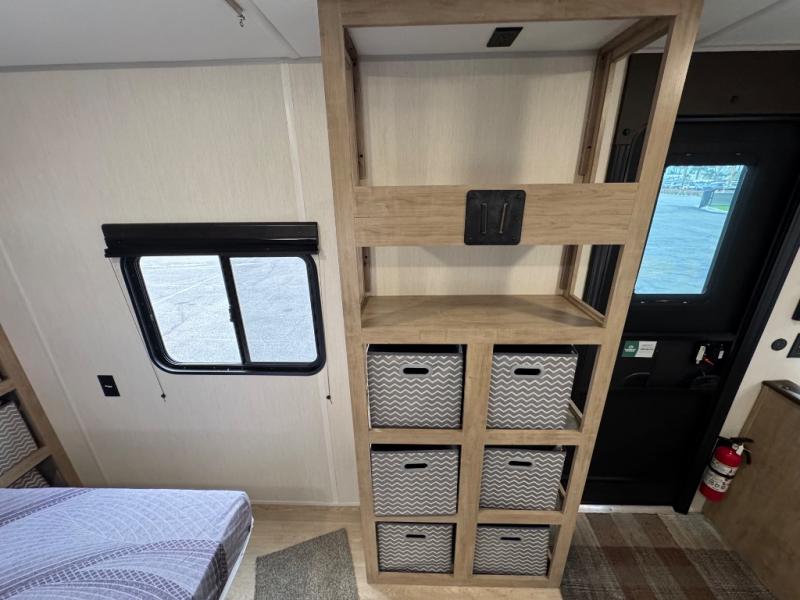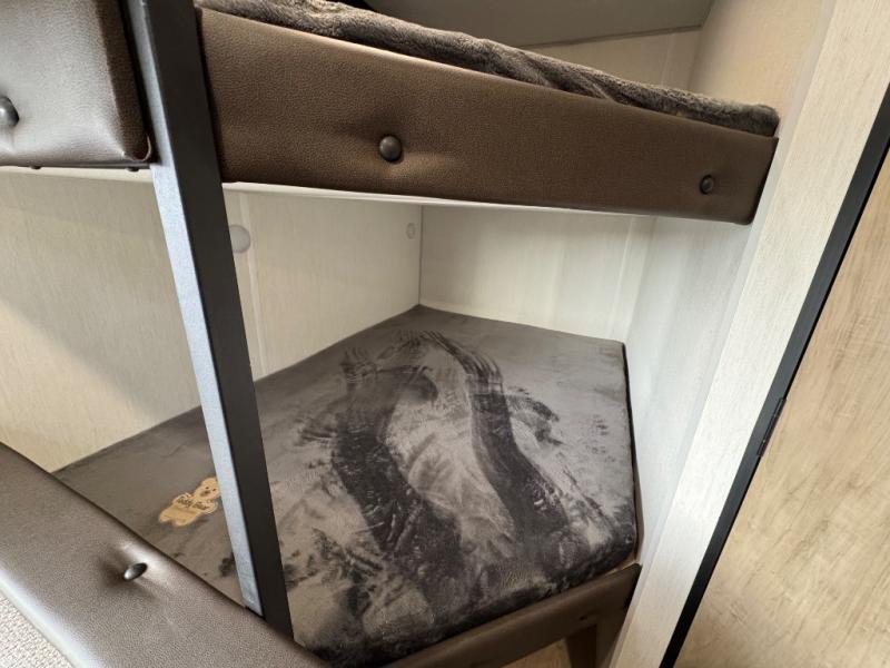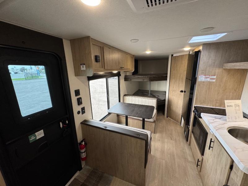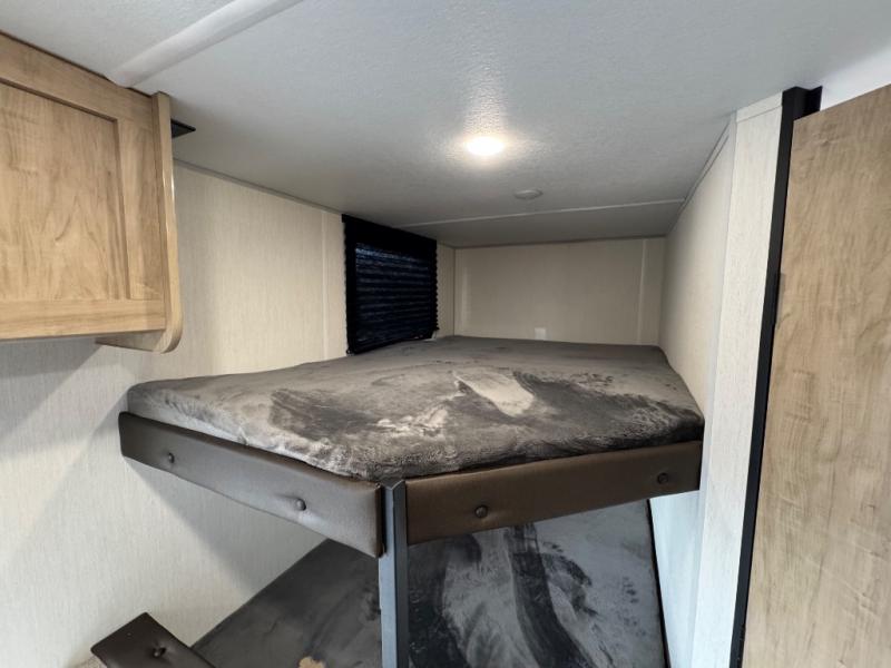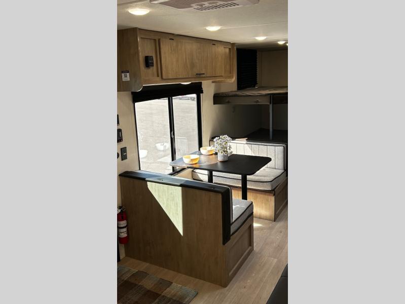 The double-size bunks in this model will allow you to camp with more friends and family! With the additional queen bed up front, plus the sofa and booth dinette, you can sleep eight! A full kitchen lets you make meals each day, and the full bath includes a tub/shower so you can clean up after hiking. This unit also includes USB ports to keep your electronics charged, and outside storage for your camp gear!