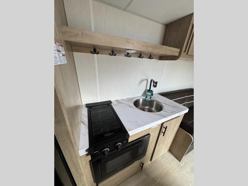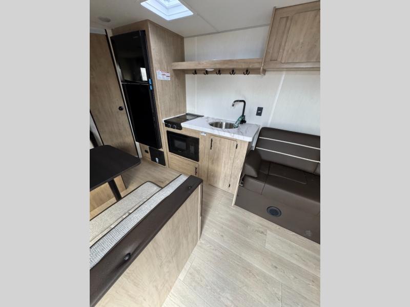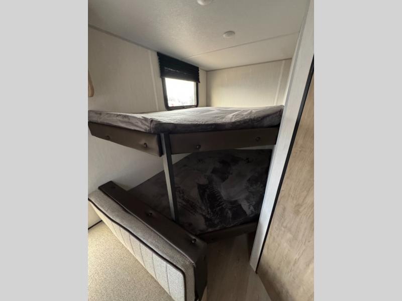 The double-size bunks in this model will allow you to camp with more friends and family! With the additional queen bed up front, plus the sofa and booth dinette, you can sleep eight! A full kitchen lets you make meals each day, and the full bath includes a tub/shower so you can clean up after hiking. This unit also includes USB ports to keep your electronics charged, and outside storage for your camp gear!