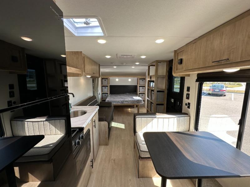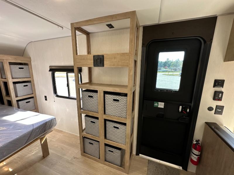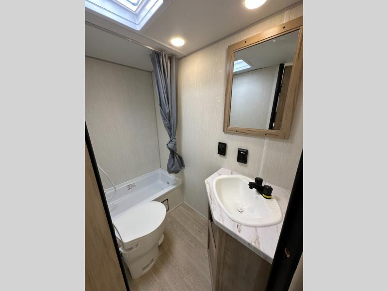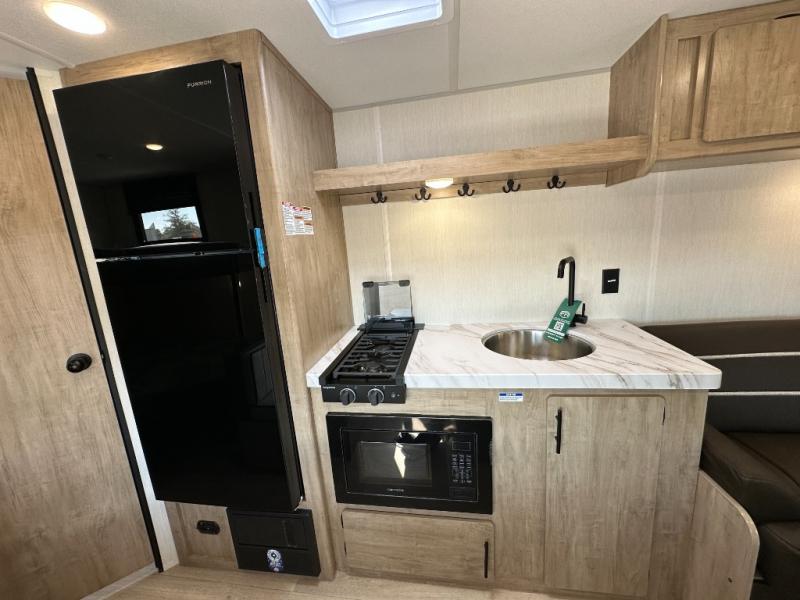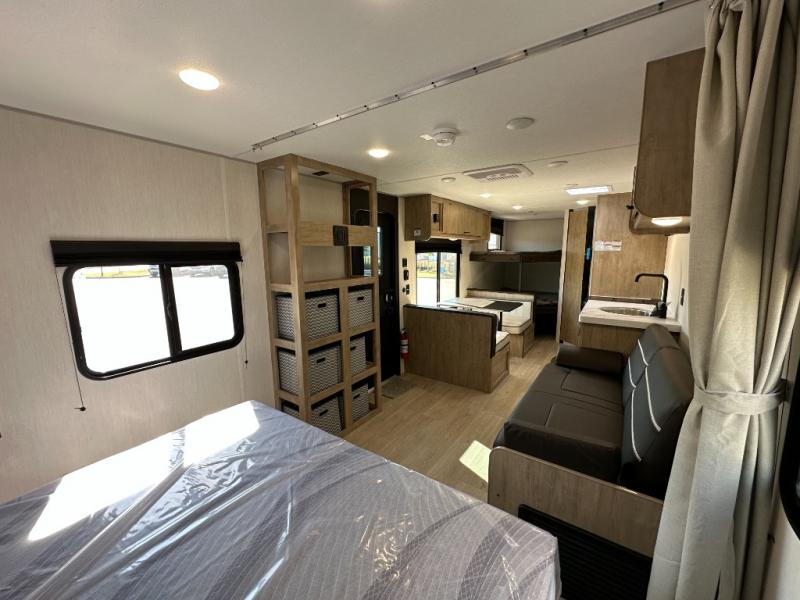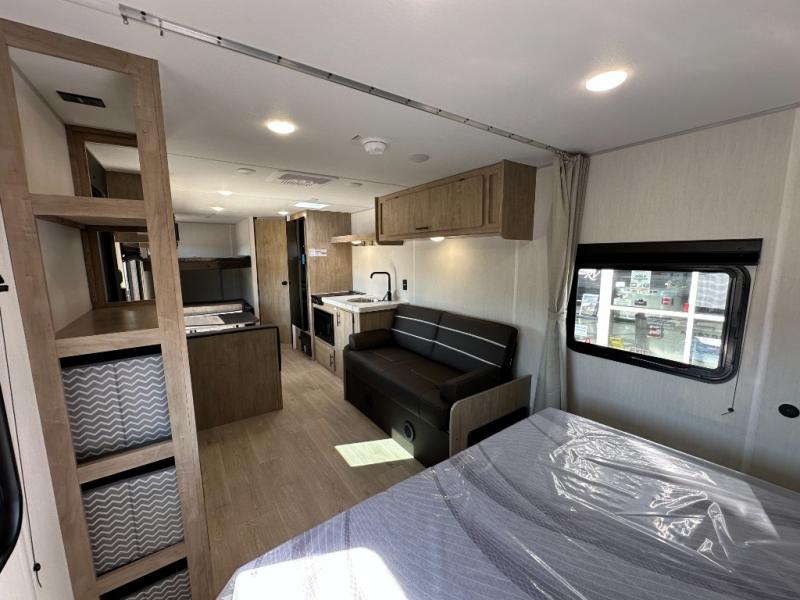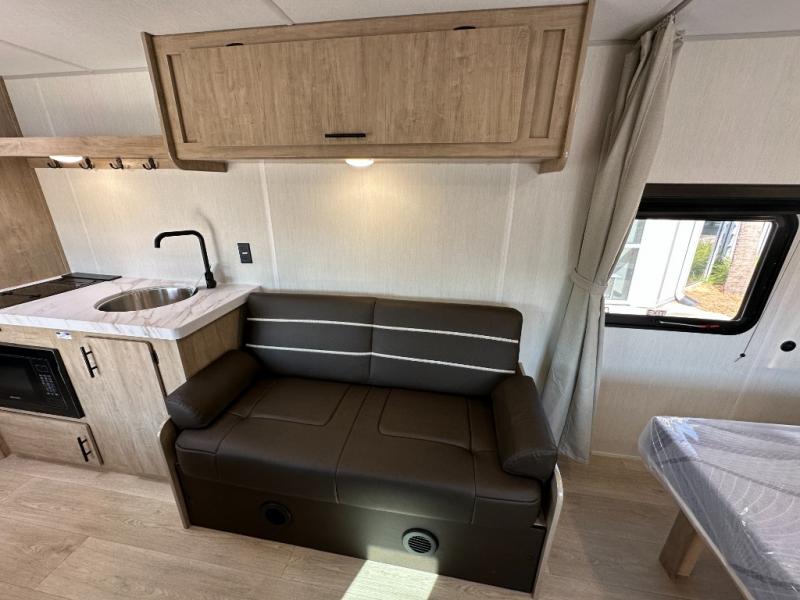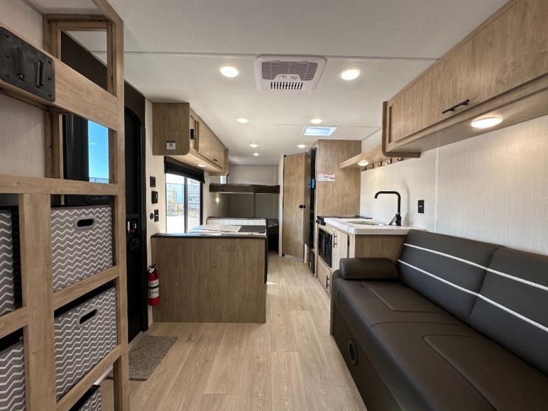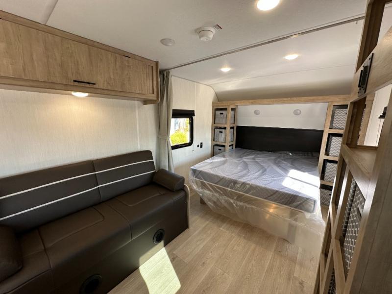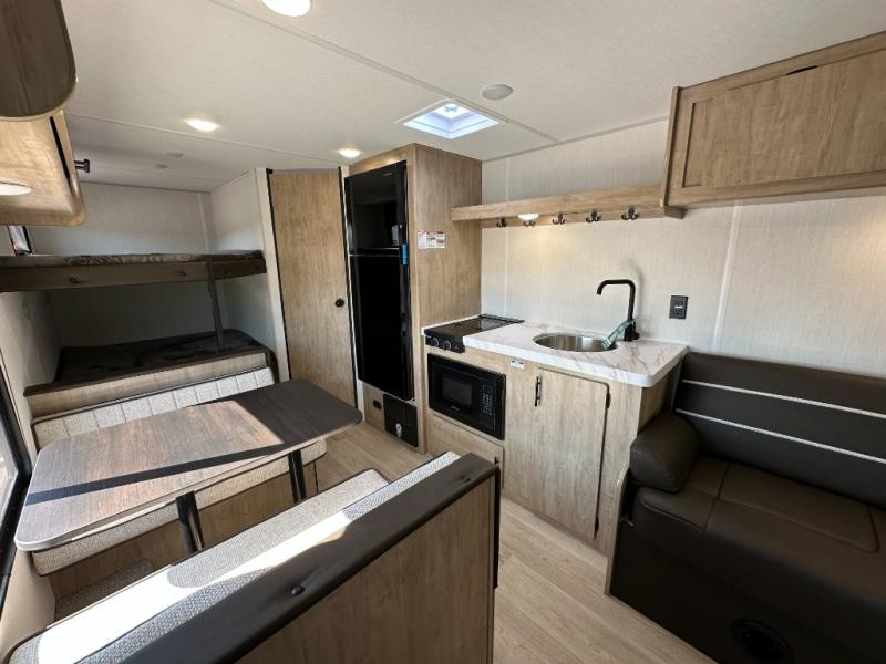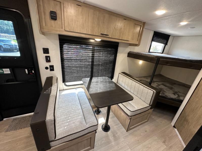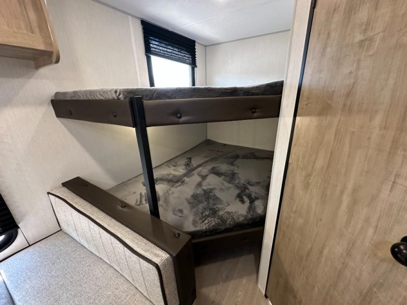The double-size bunks in this model will allow you to camp with more friends and family! With the additional queen bed up front, plus the sofa and booth dinette, you can sleep eight! A full kitchen lets you make meals each day, and the full bath includes a tub/shower so you can clean up after hiking. This unit also includes USB ports to keep your electronics charged, and outside storage for your camp gear!