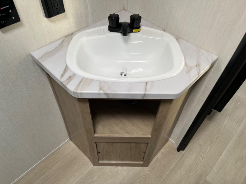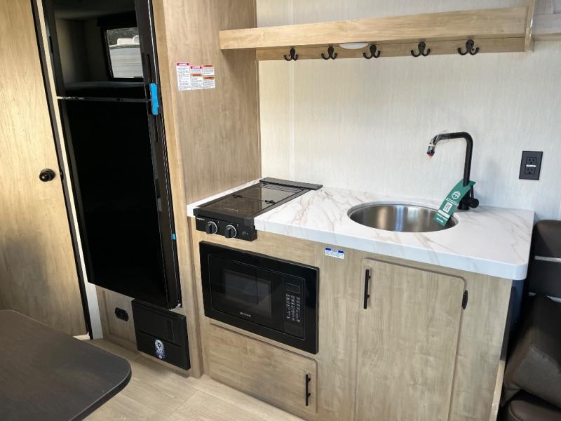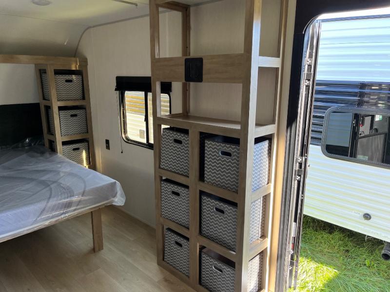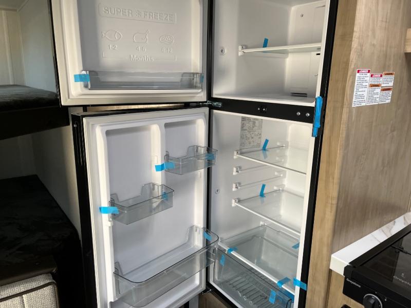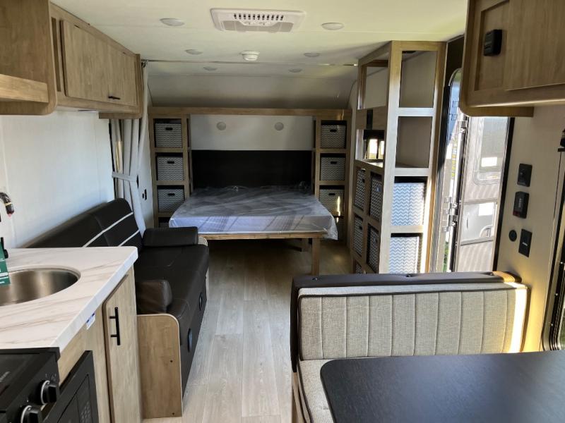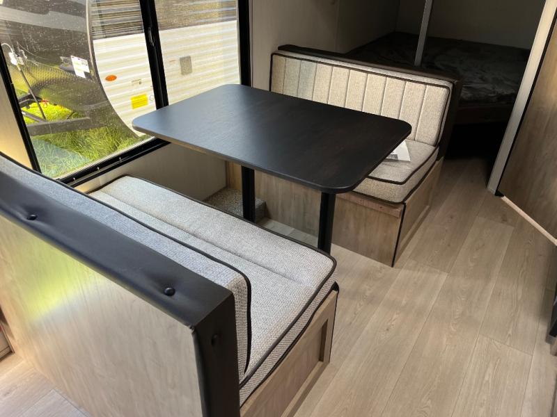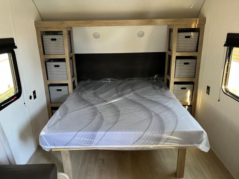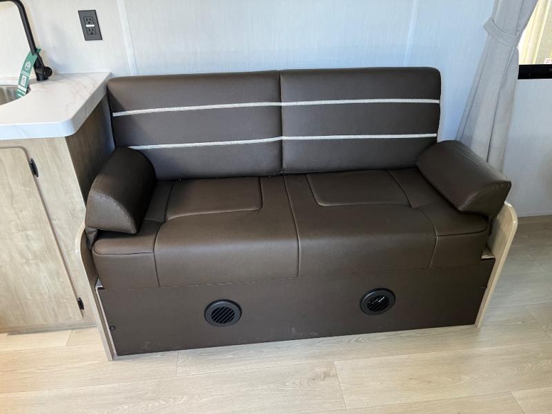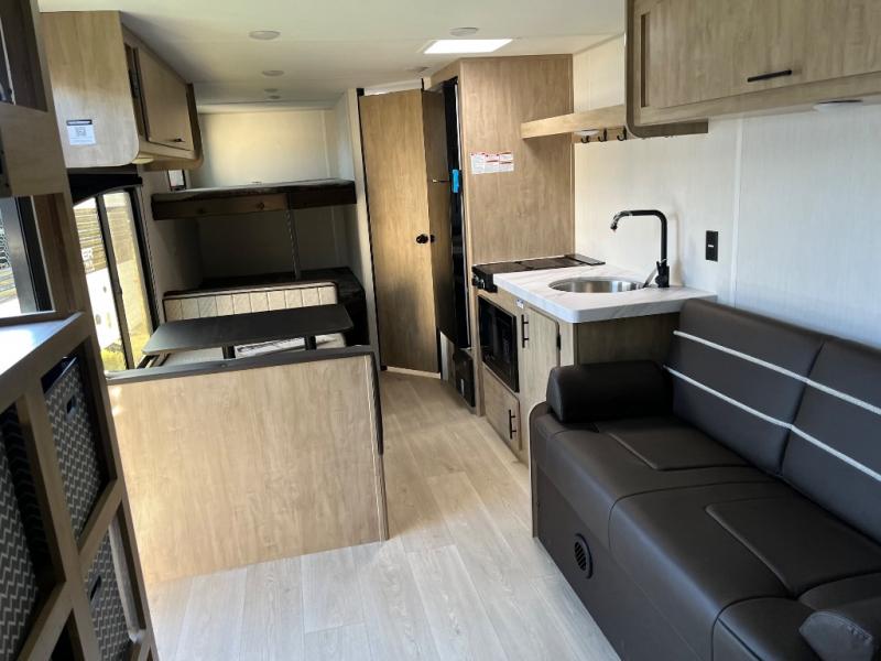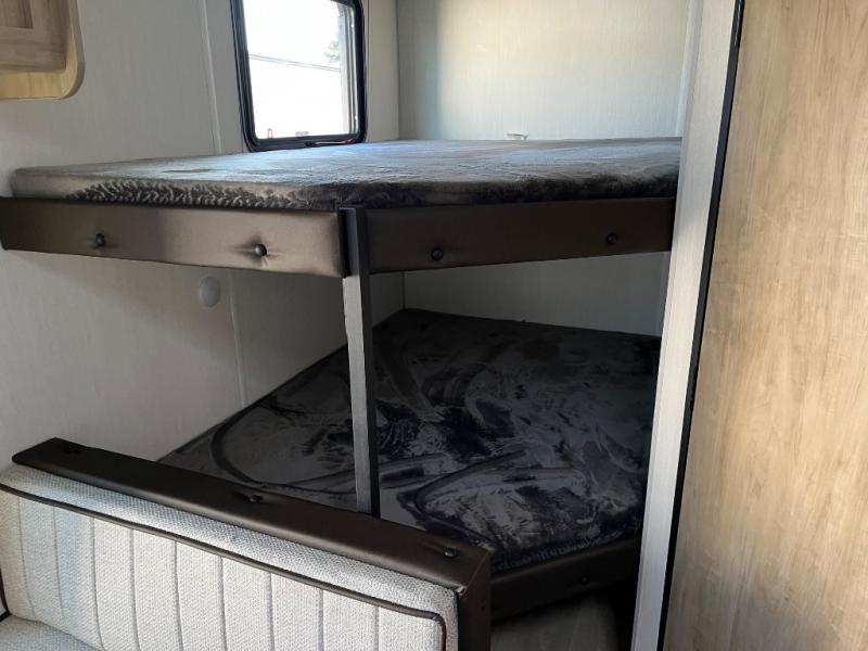 The double-size bunks in this model will allow you to camp with more friends and family! With the additional queen bed up front, plus the sofa and booth dinette, you can sleep eight! A full kitchen lets you make meals each day, and the full bath includes a tub/shower so you can clean up after hiking. This unit also includes USB ports to keep your electronics charged, and outside storage for your camp gear!