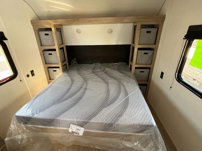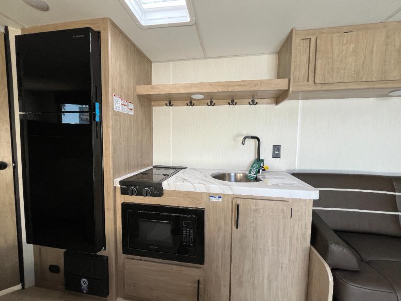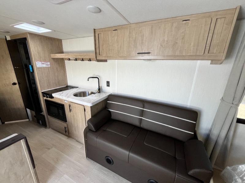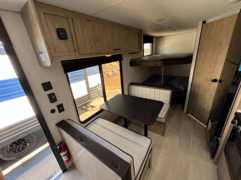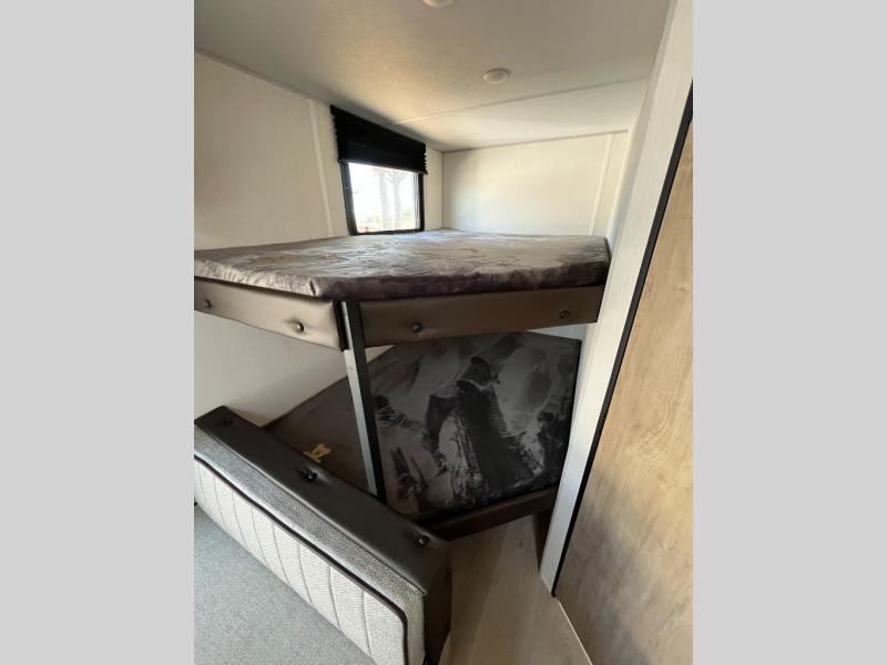 The double-size bunks in this model will allow you to camp with more friends and family! With the additional queen bed up front, plus the sofa and booth dinette, you can sleep eight! A full kitchen lets you make meals each day, and the full bath includes a tub/shower so you can clean up after hiking. This unit also includes USB ports to keep your electronics charged, and outside storage for your camp gear!