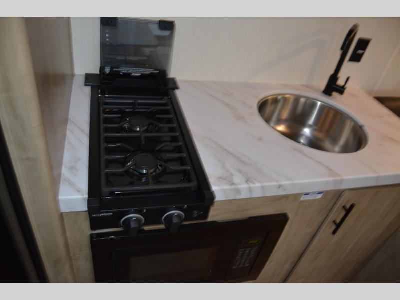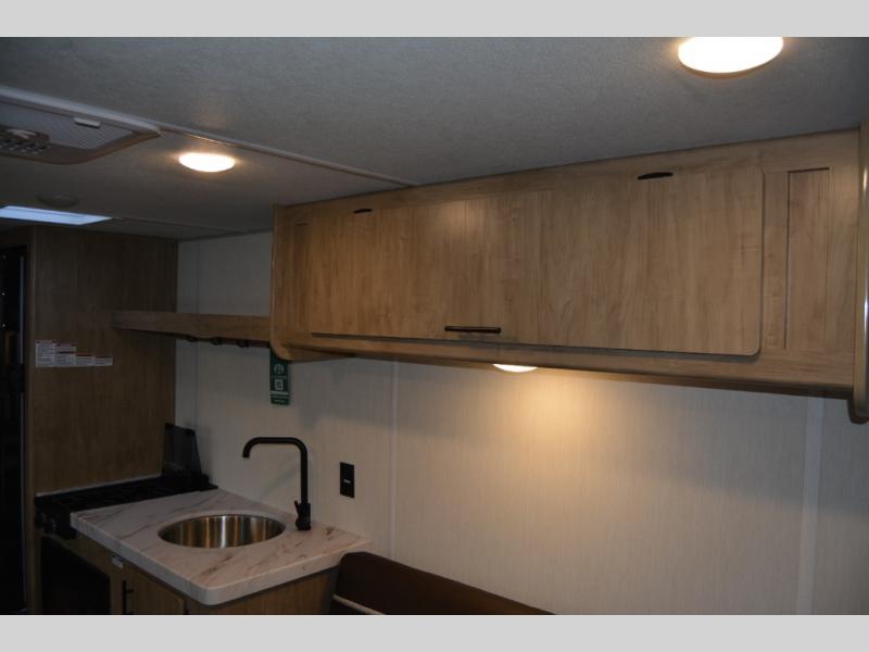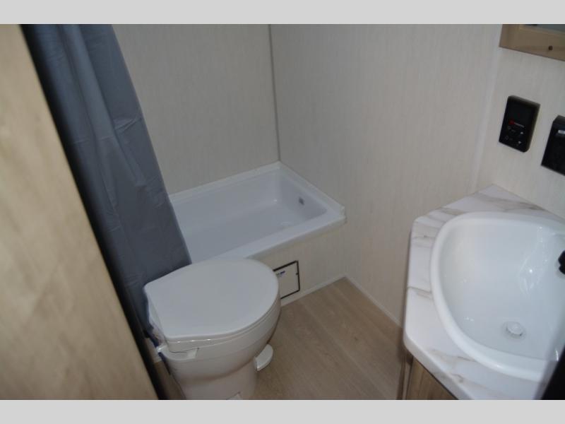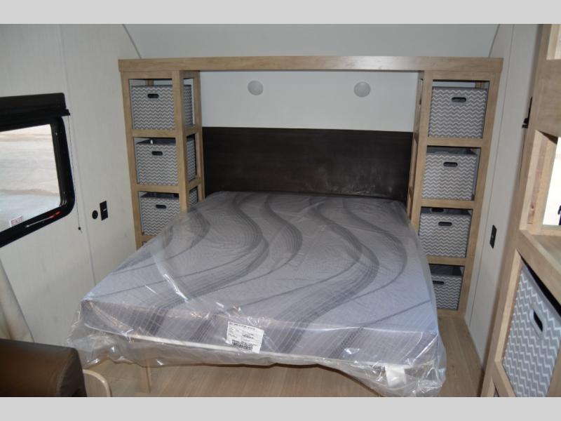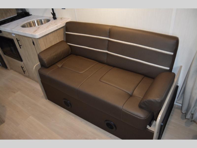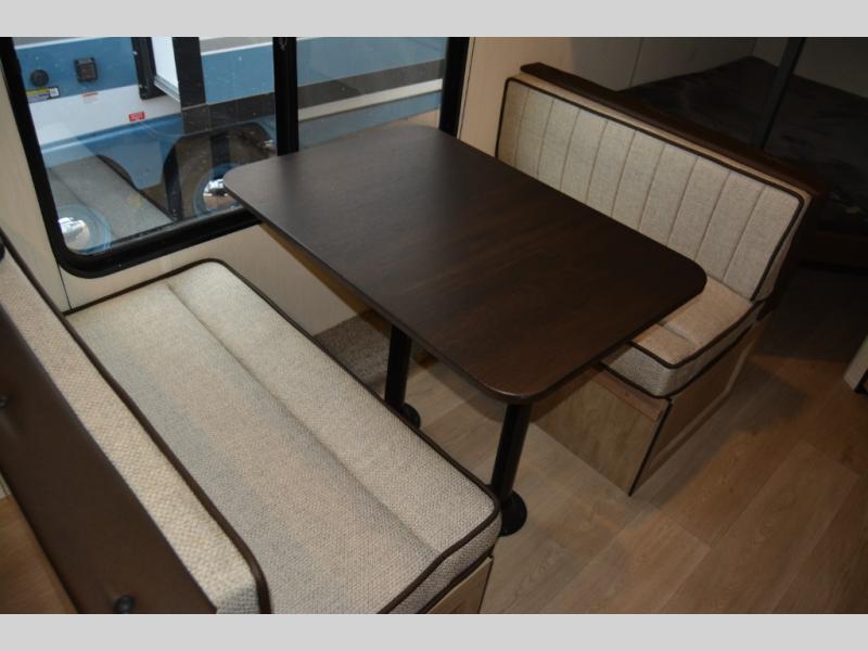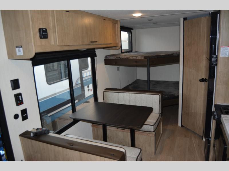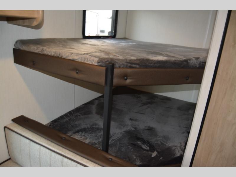 The double-size bunks in this model will allow you to camp with more friends and family! With the additional queen bed up front, plus the sofa and booth dinette, you can sleep eight! A full kitchen lets you make meals each day, and the full bath includes a tub/shower so you can clean up after hiking. This unit also includes USB ports to keep your electronics charged, and outside storage for your camp gear!