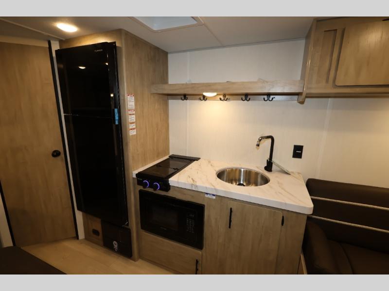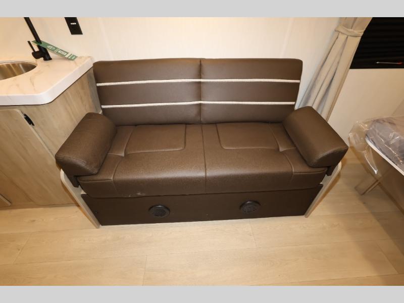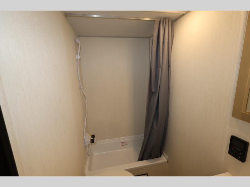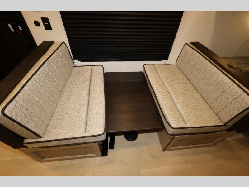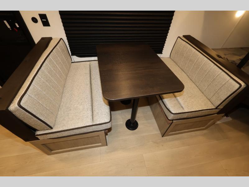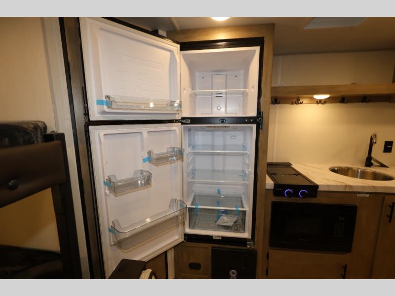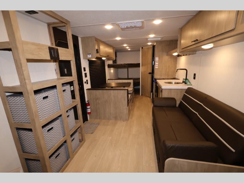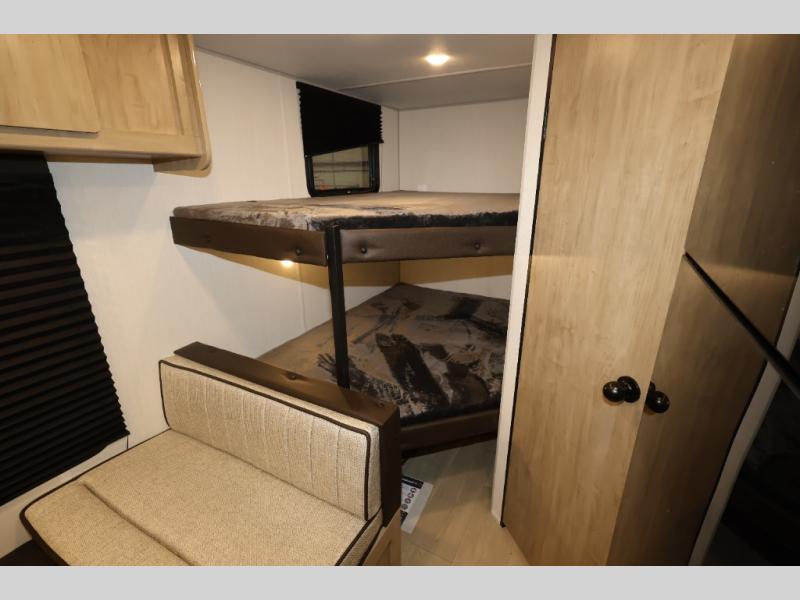 The double-size bunks in this model will allow you to camp with more friends and family! With the additional queen bed up front, plus the sofa and booth dinette, you can sleep eight! A full kitchen lets you make meals each day, and the full bath includes a tub/shower so you can clean up after hiking. This unit also includes USB ports to keep your electronics charged, and outside storage for your camp gear!