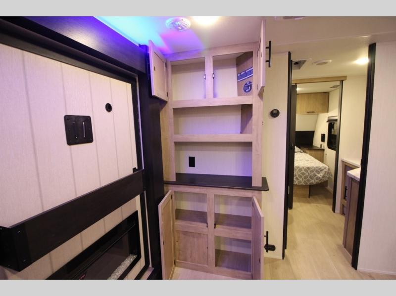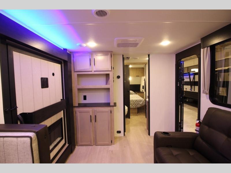 You're going to love camping in this spacious travel trailer that sleeps three to four each night! The spacious side patio includes patio doors and an awning above it so you can sit outdoors and visit in your camp chairs. A mud room in the front kitchen provides a place to take your shoes off, and there are added shelves here for more storage. Once inside, you can relax on the L-shaped sofa within the large slide out, prep dinner on the rolling island, and turn on the fireplace for a cozy evenings inside. There is a full bath that will let you clean up every day, and you'll have your own space in the front private bedroom that includes an RV king bed. There are also dual closets here plus one of the dual entry doors for added convenience!