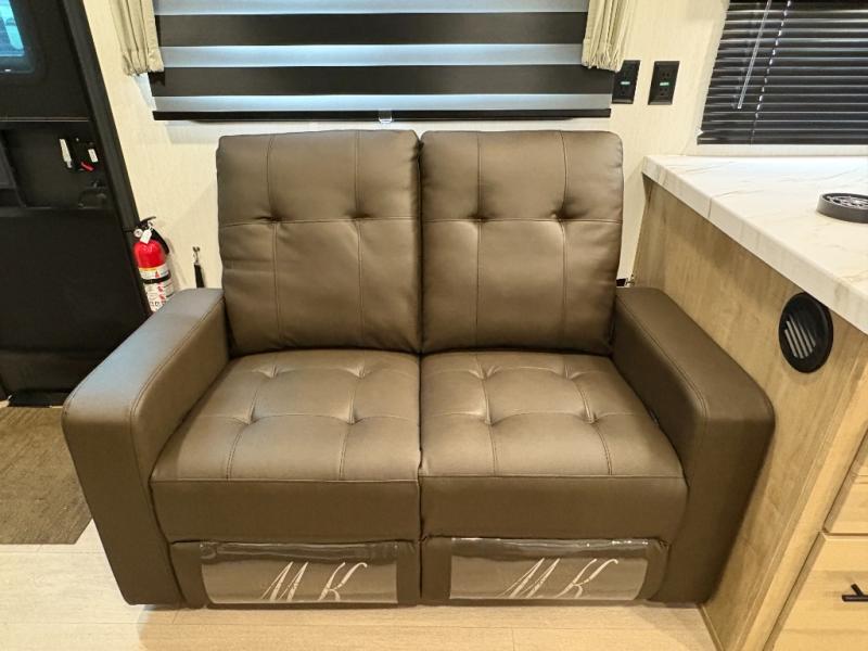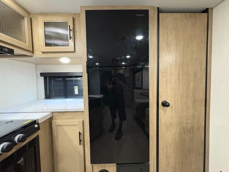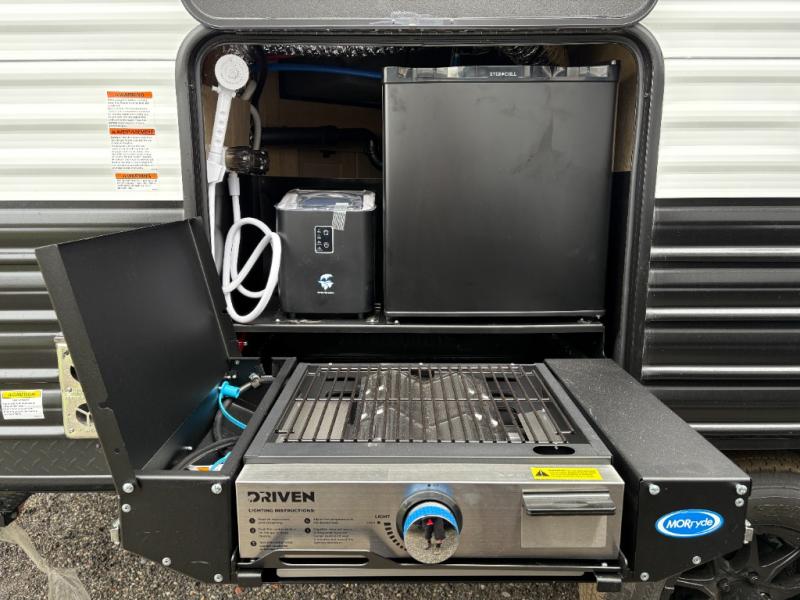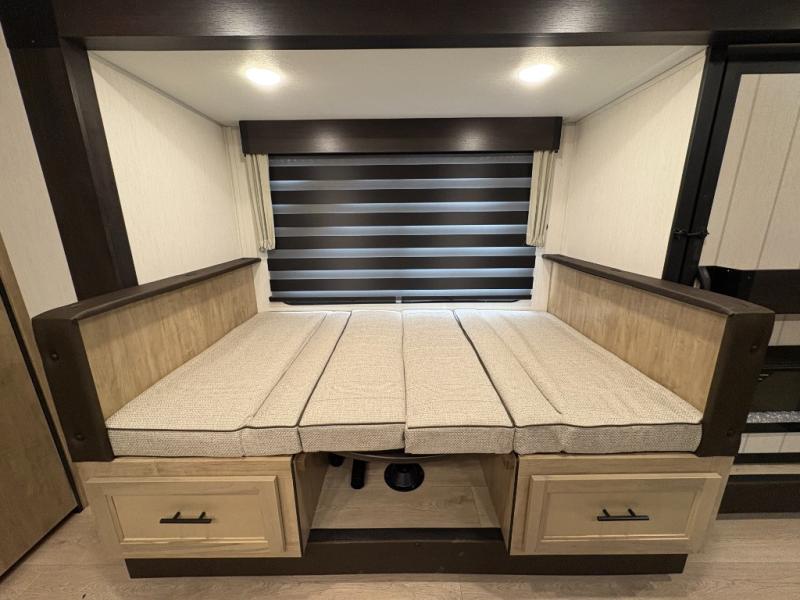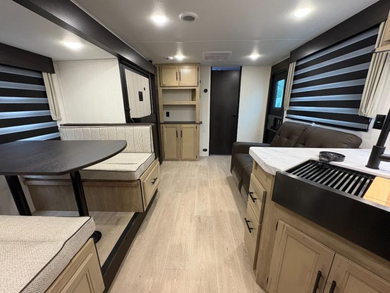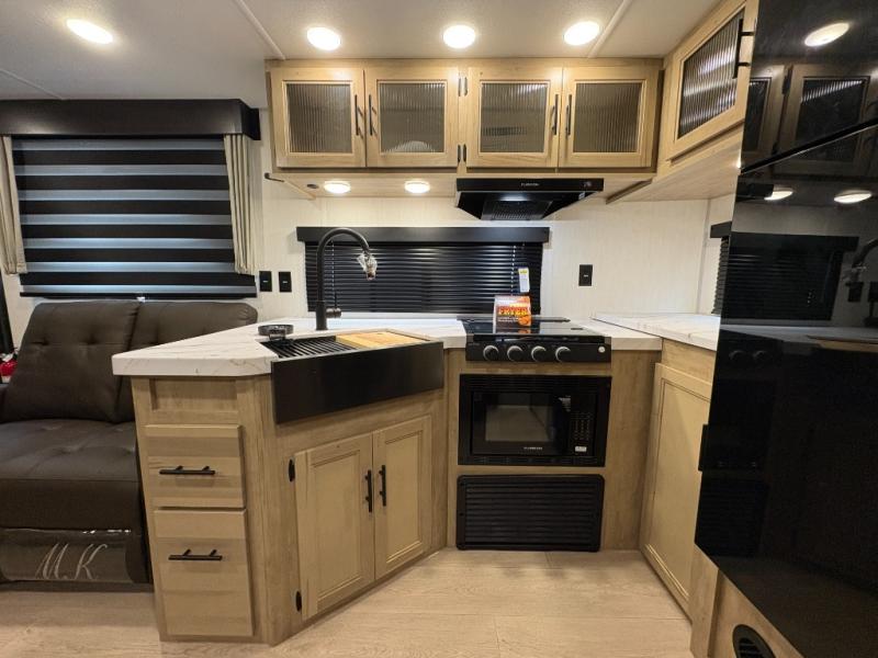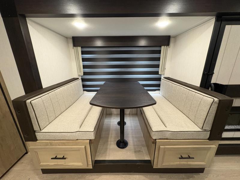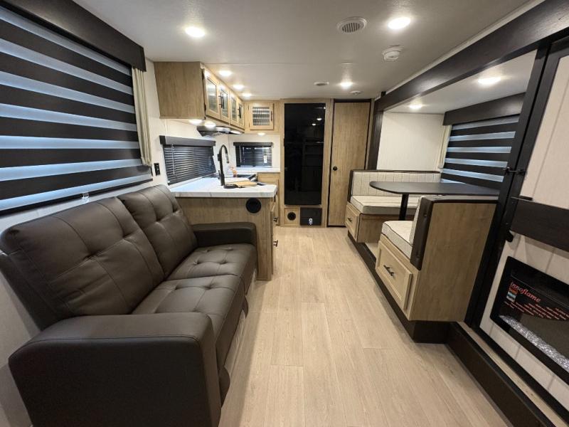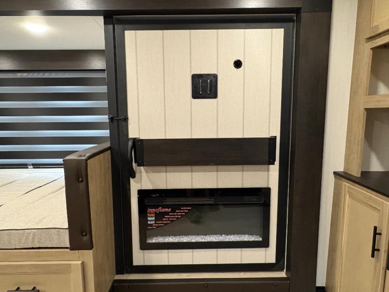 You'll love every minute spent in this single slide out travel trailer, whether you're cooking dinner on the outside kitchen or in the rear kitchen, relaxing on the sofa across from the fireplace, or sleeping on the RV king bed in the front master bedroom! There is a hidden pantry behind the fireplace for convenient storage, and the booth dinette within the slide provides a place to dine together. The walk-thru bath is spacious, and includes a tub/shower, toilet, and sink with counter space.