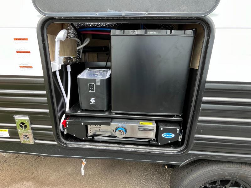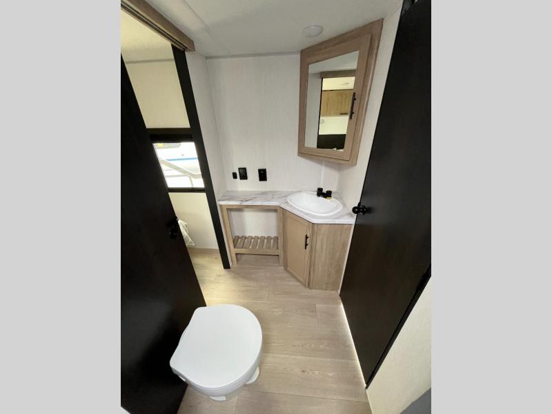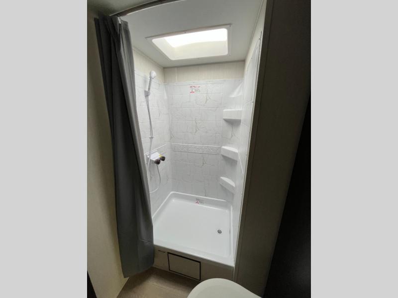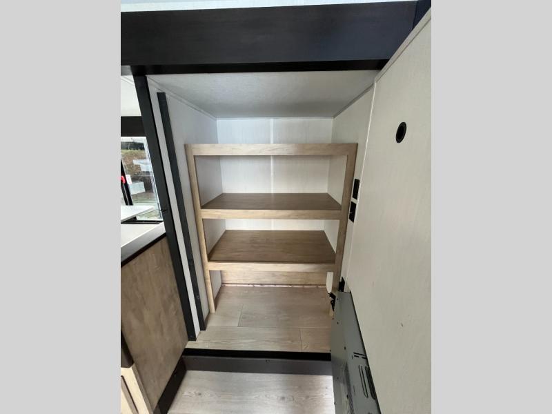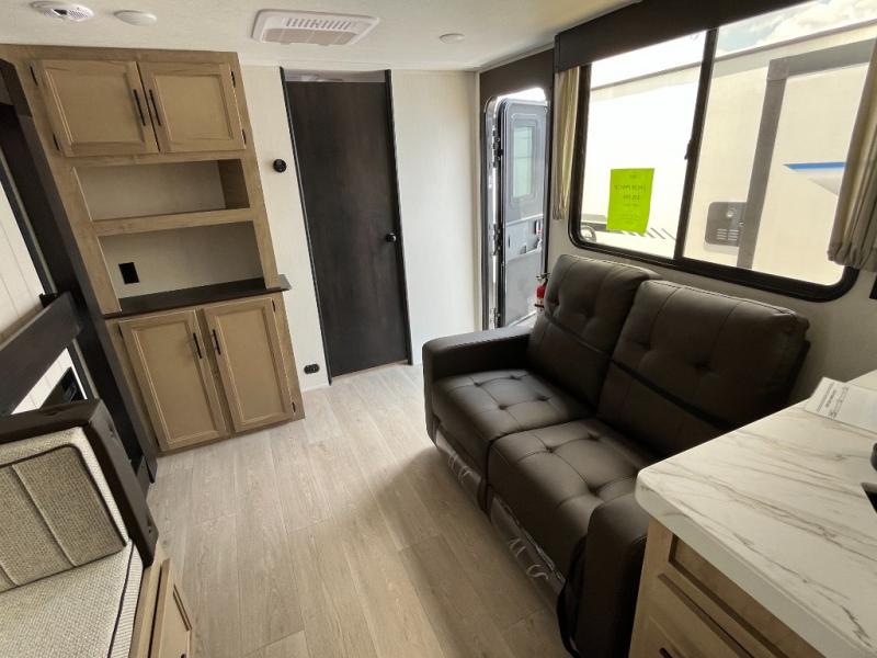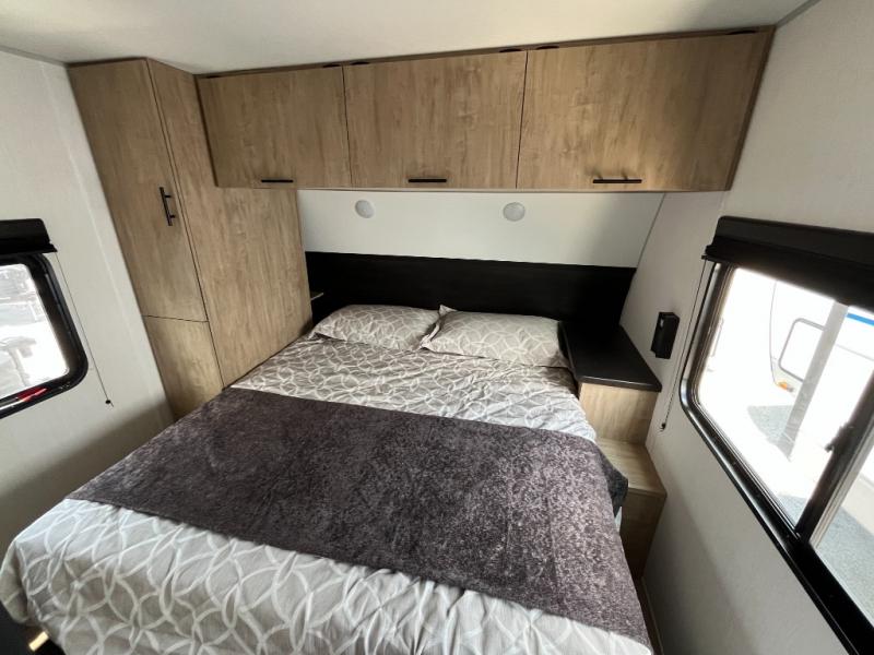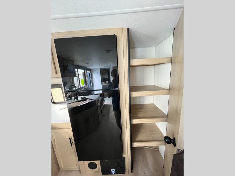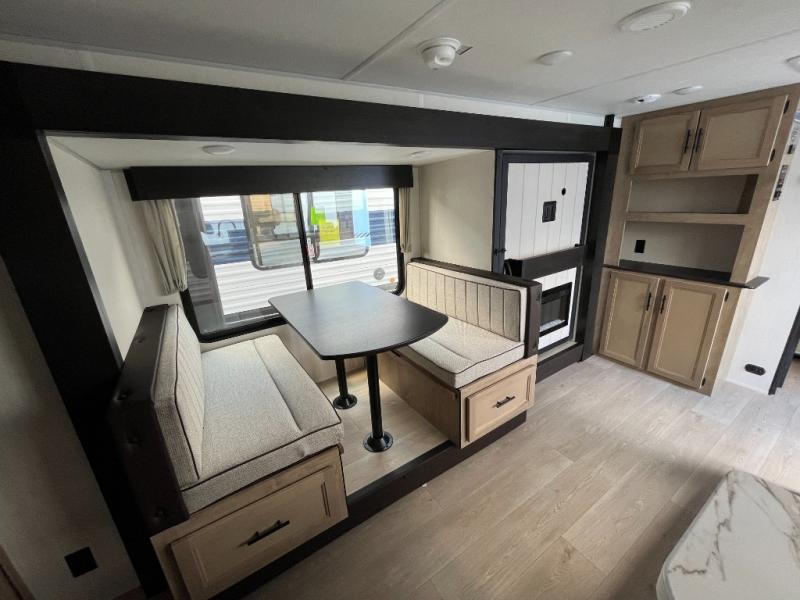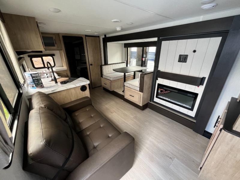 You'll love every minute spent in this single slide out travel trailer, whether you're cooking dinner on the outside kitchen or in the rear kitchen, relaxing on the sofa across from the fireplace, or sleeping on the RV king bed in the front master bedroom! There are hidden shelves behind the fireplace for convenient storage, and the booth dinette within the slide provides a place to dine together. The walk-thru bath is spacious, and includes a tub/shower, toilet, and sink with counter space.